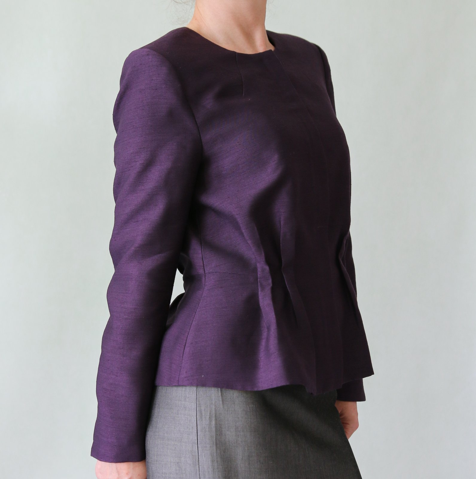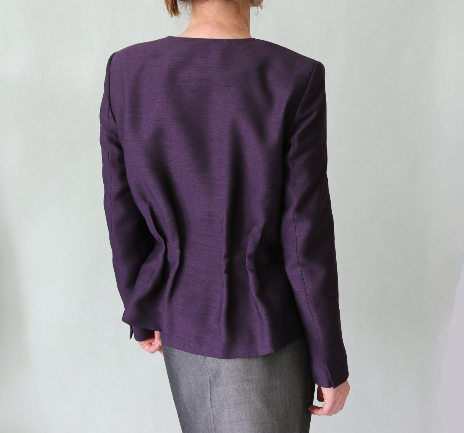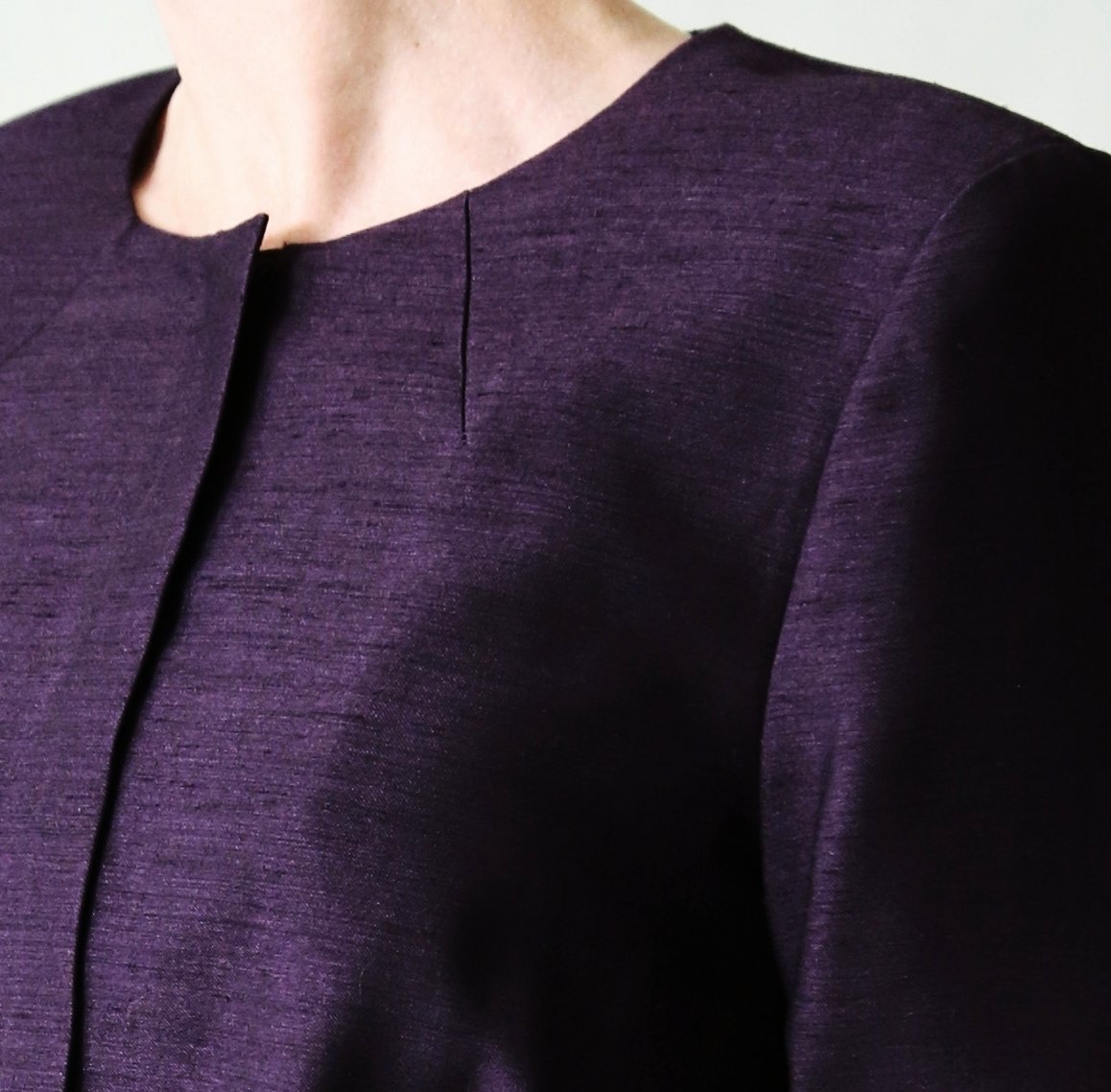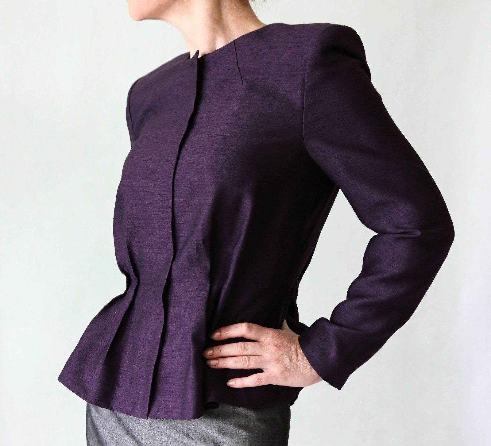 Zvláštne sako z veľmi peknej tmavofialovej látky s nerovným povrchom, krásnym jemným leskom, imitujúce dupionový hodváb. Sako má moderný okrúhly výstrih bez goliera, skryté zapínanie na zips a v páse je stiahnuté nezvyčajnými obrátenými záhybmi. Vďaka pevnému materiálu tak vzniká peplumová sukňa. Je podšité. Vrchný materiál: 84 % polyester, 16 % viskóza, podšívka 52 % polyester, 48 % viskóza.