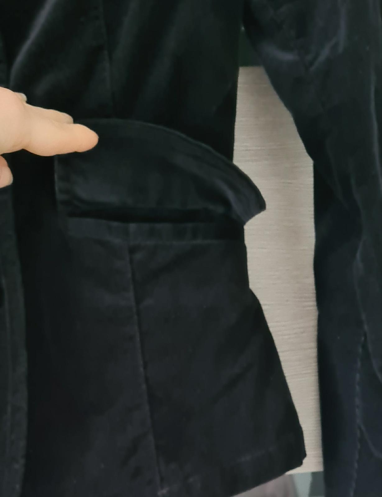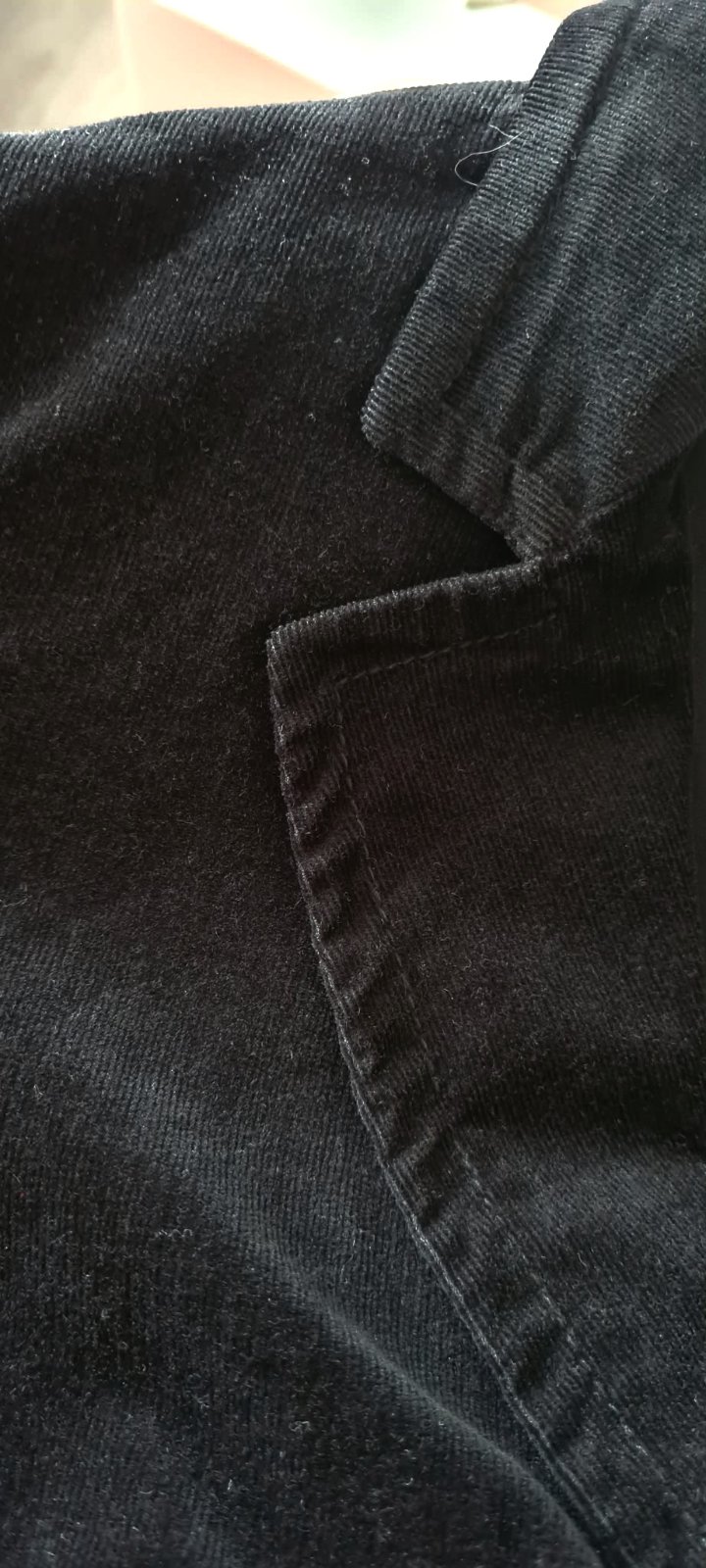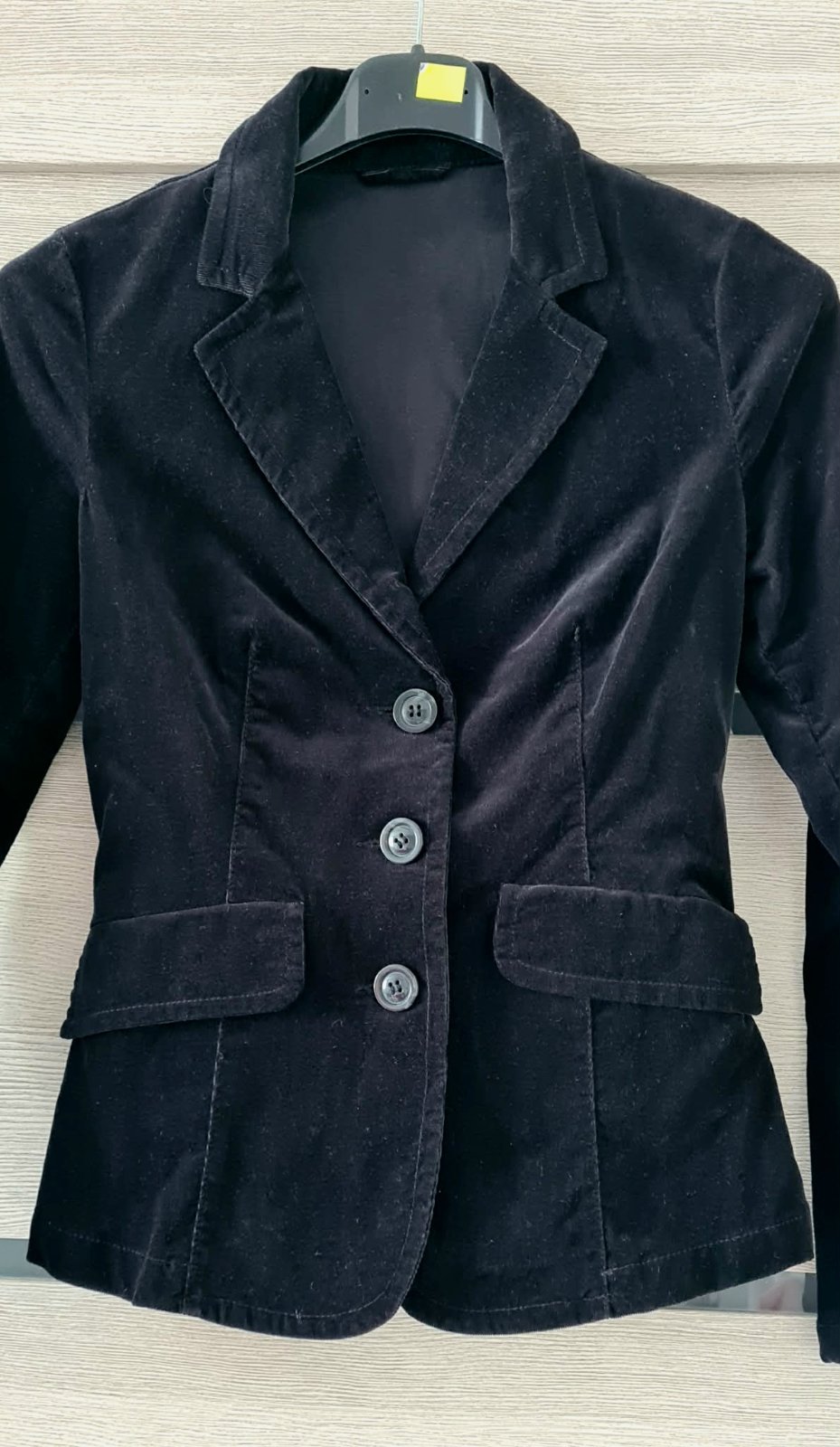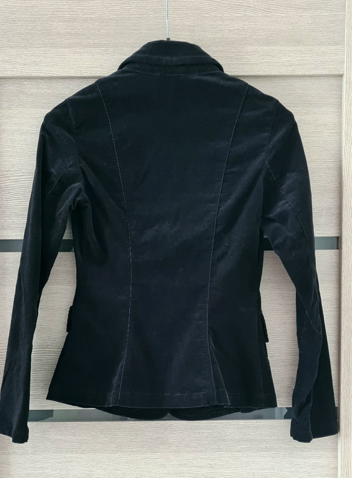 Sako je strečové, čím super sedí na postave, vzhľad plyšu, sýta čierna farba. Šírka cez prsia 39cm.