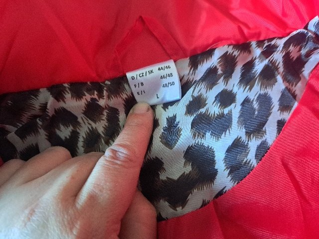 Krásna červená bunda s lemom z brúsenej kože. Rozmery: šírka 2x 60, dĺžka 74 cm.