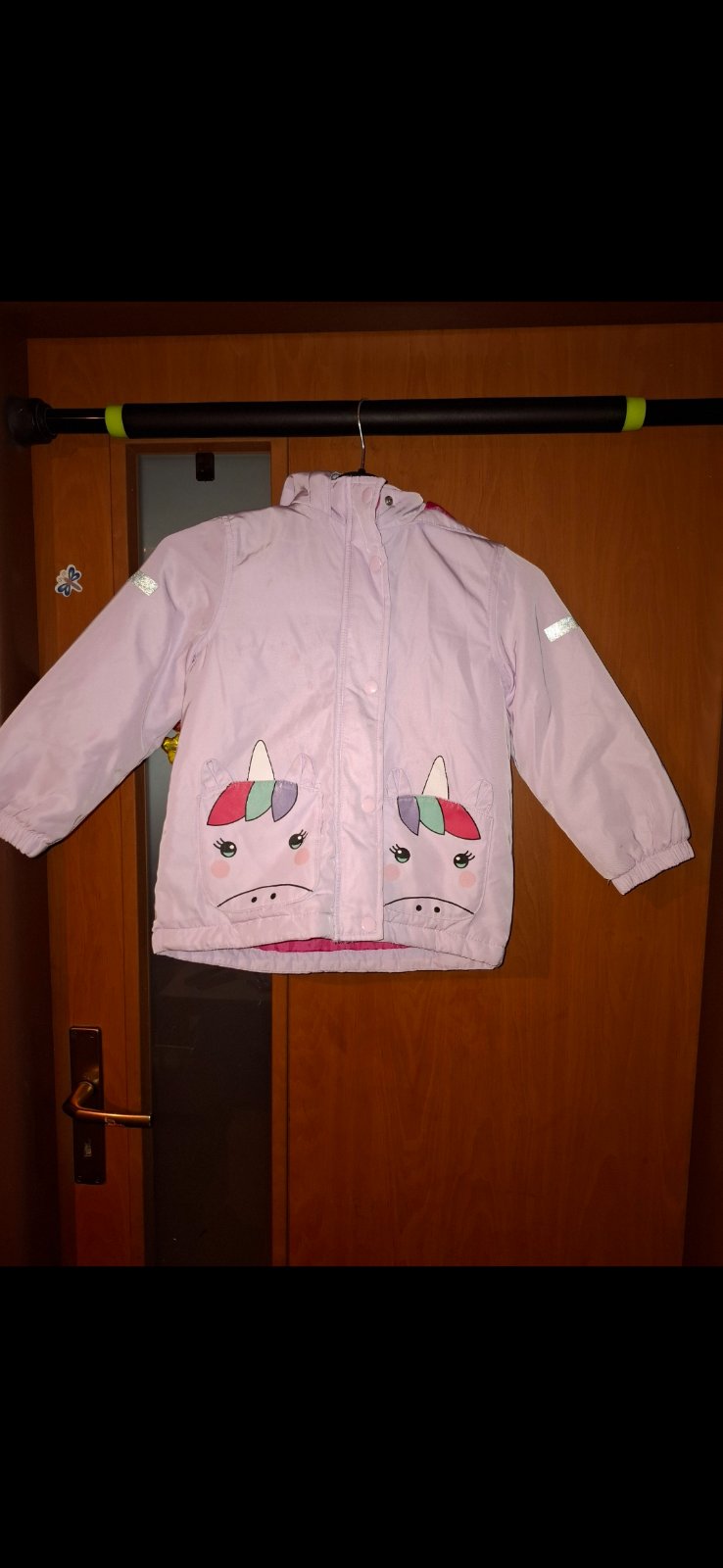 Predám prechodné bundy veľkosť 110/116 -fialová ako nová na bodkovana vidieť nosenie ale nieje poškodená. Darček čiapka. Spolu 5.5 €