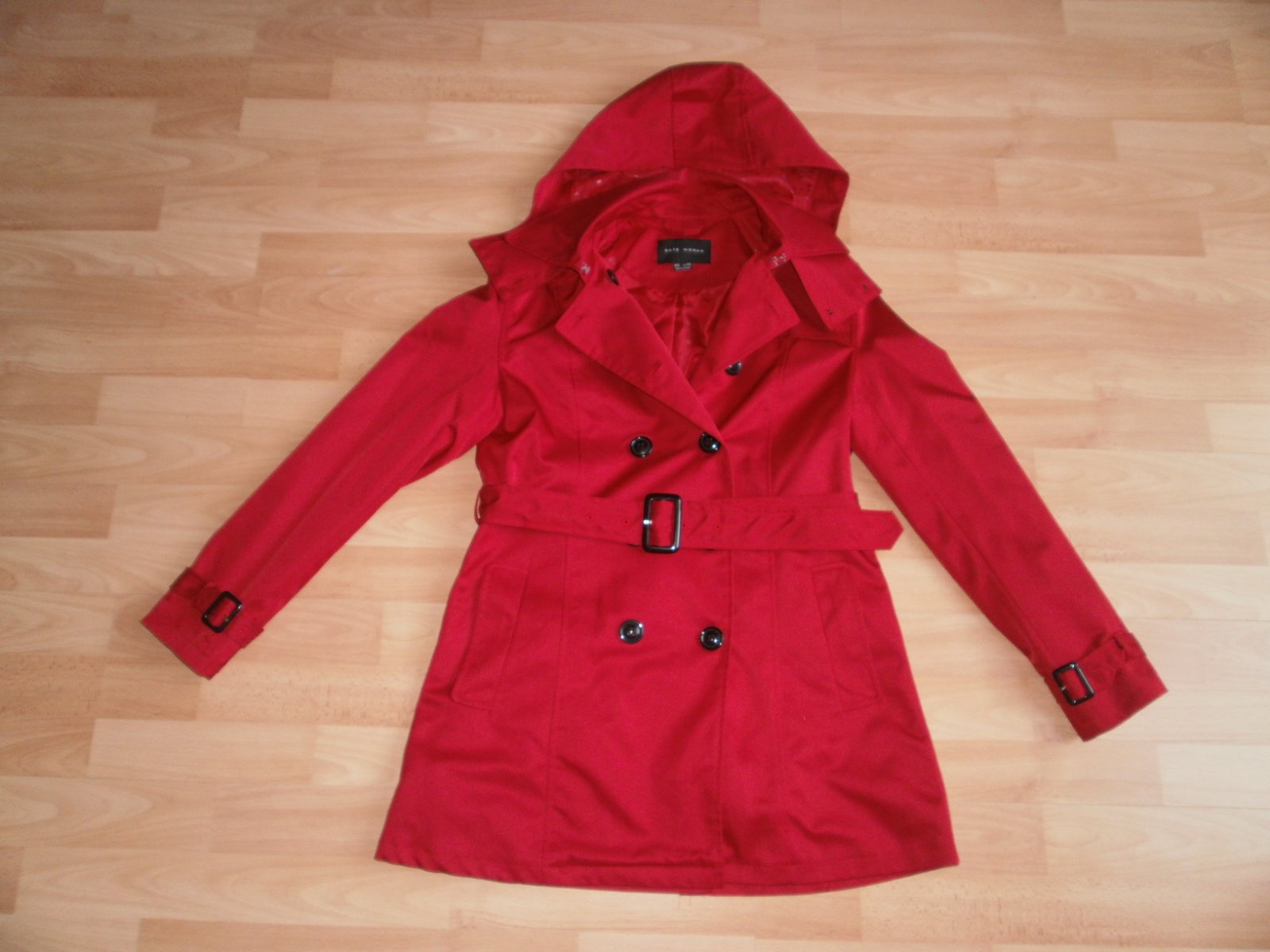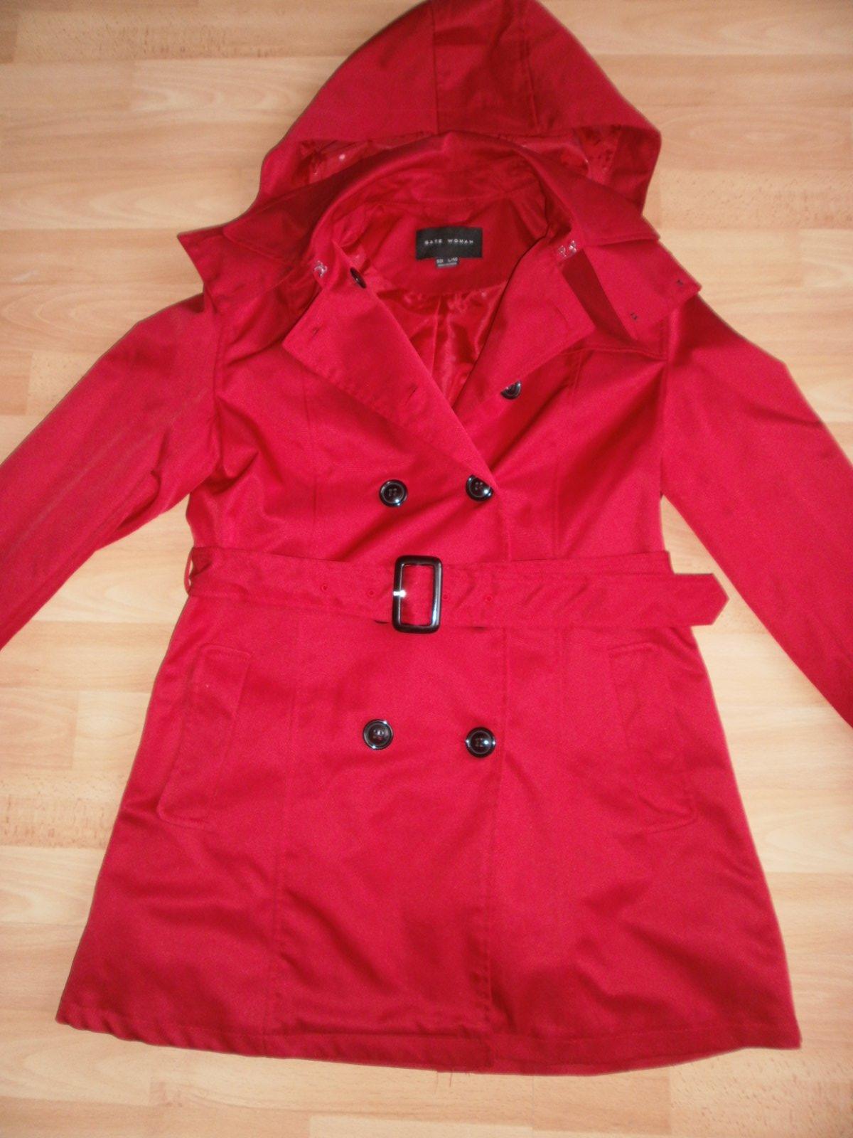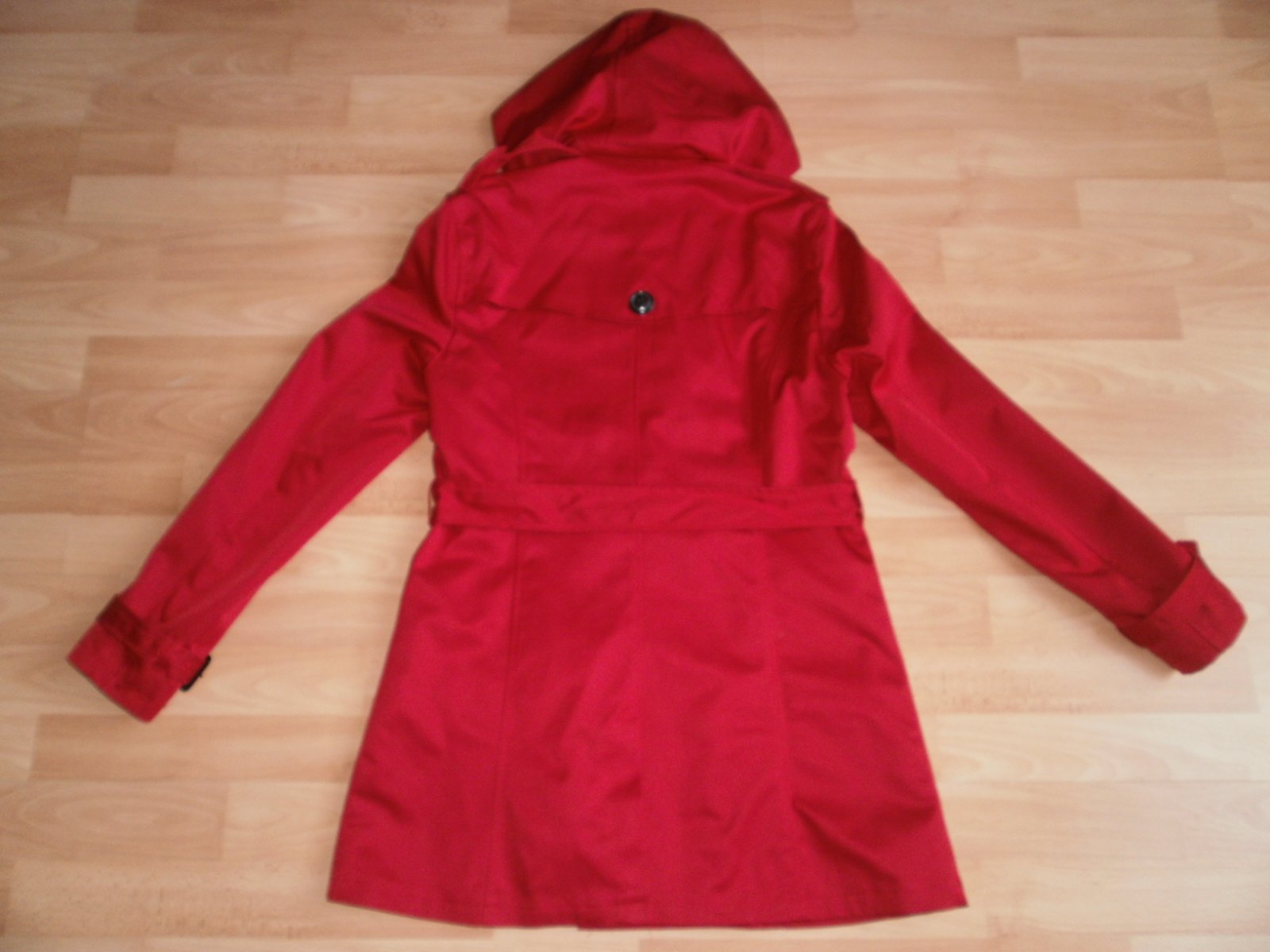 Mala som ho párkrát, ale už mi je malý. Kapucňa sa dá odopnúť a dá sa zapnúť až kuk krku. Veľkosť píše L/40, ale je to M/38. Farba tmavočervená.