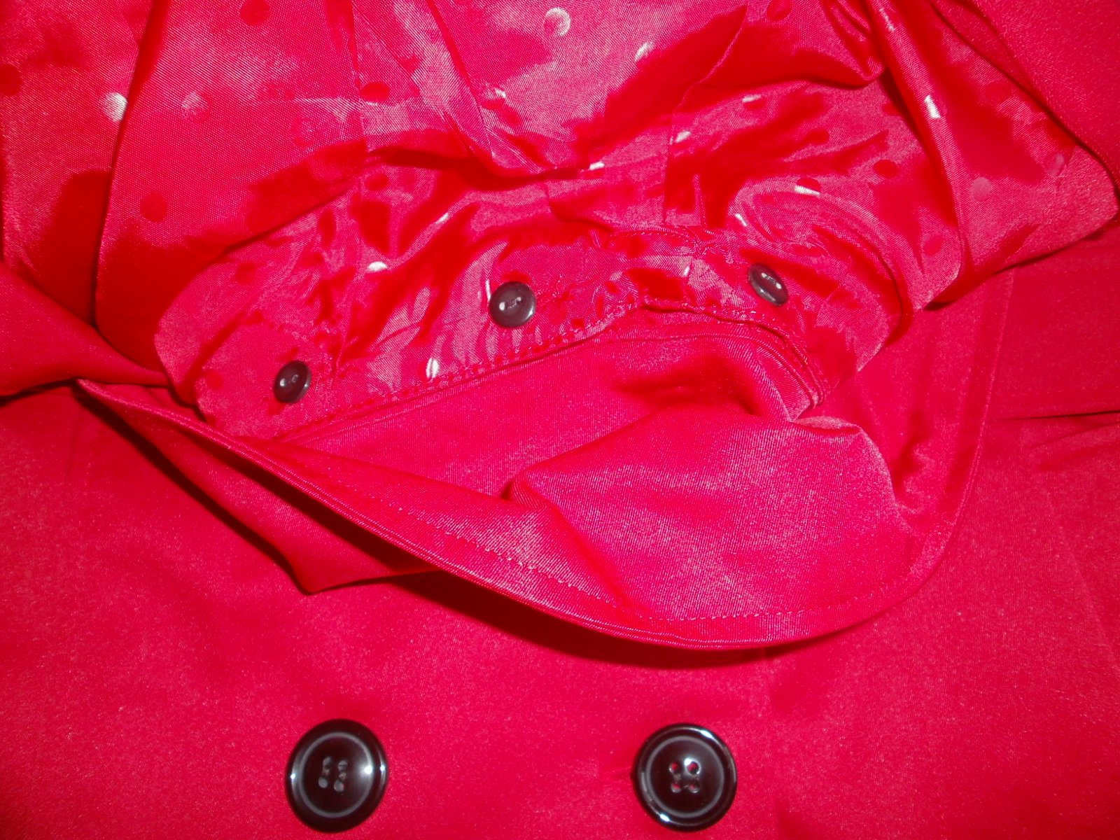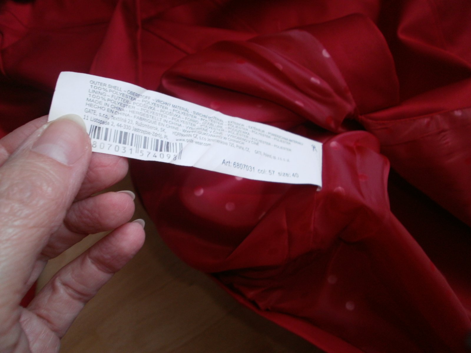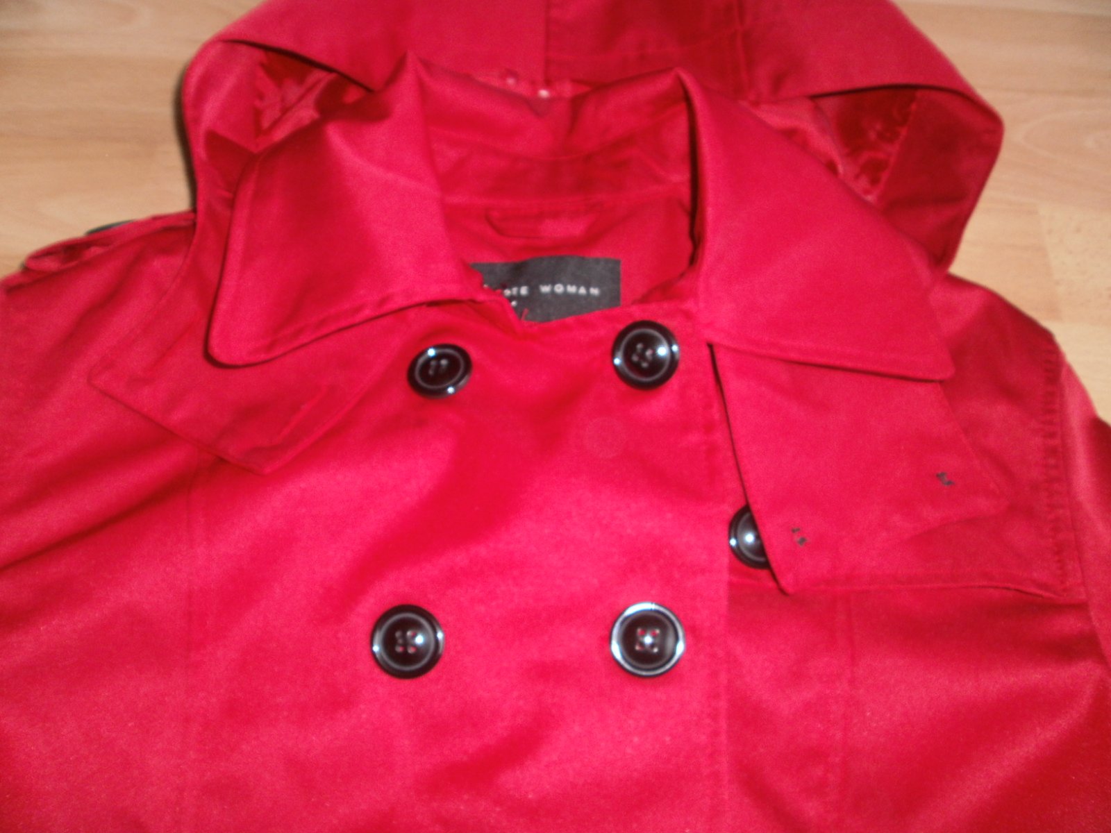 Mala som ho párkrát, ale už mi je malý. Kapucňa sa dá odopnúť a dá sa zapnúť až kuk krku. Veľkosť píše L/40, ale je to M/38. Farba tmavočervená.