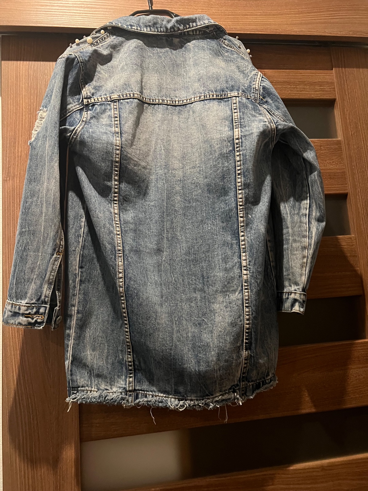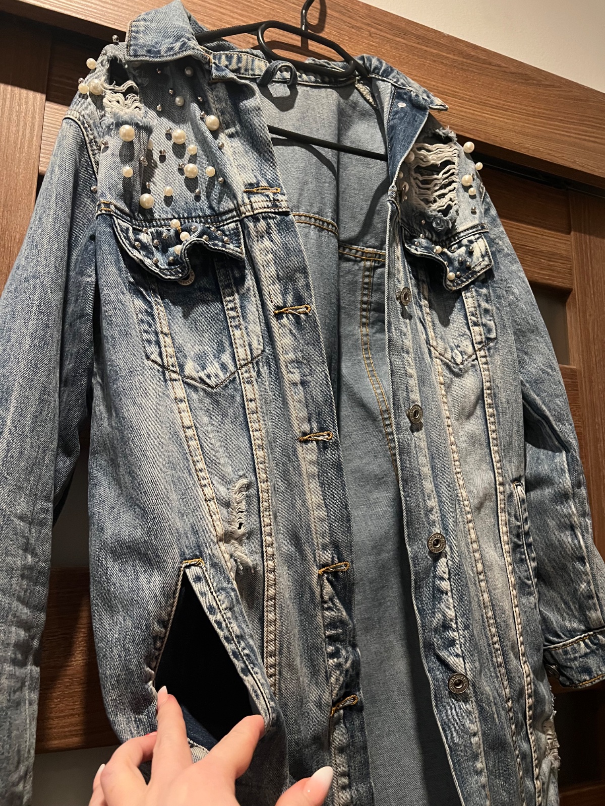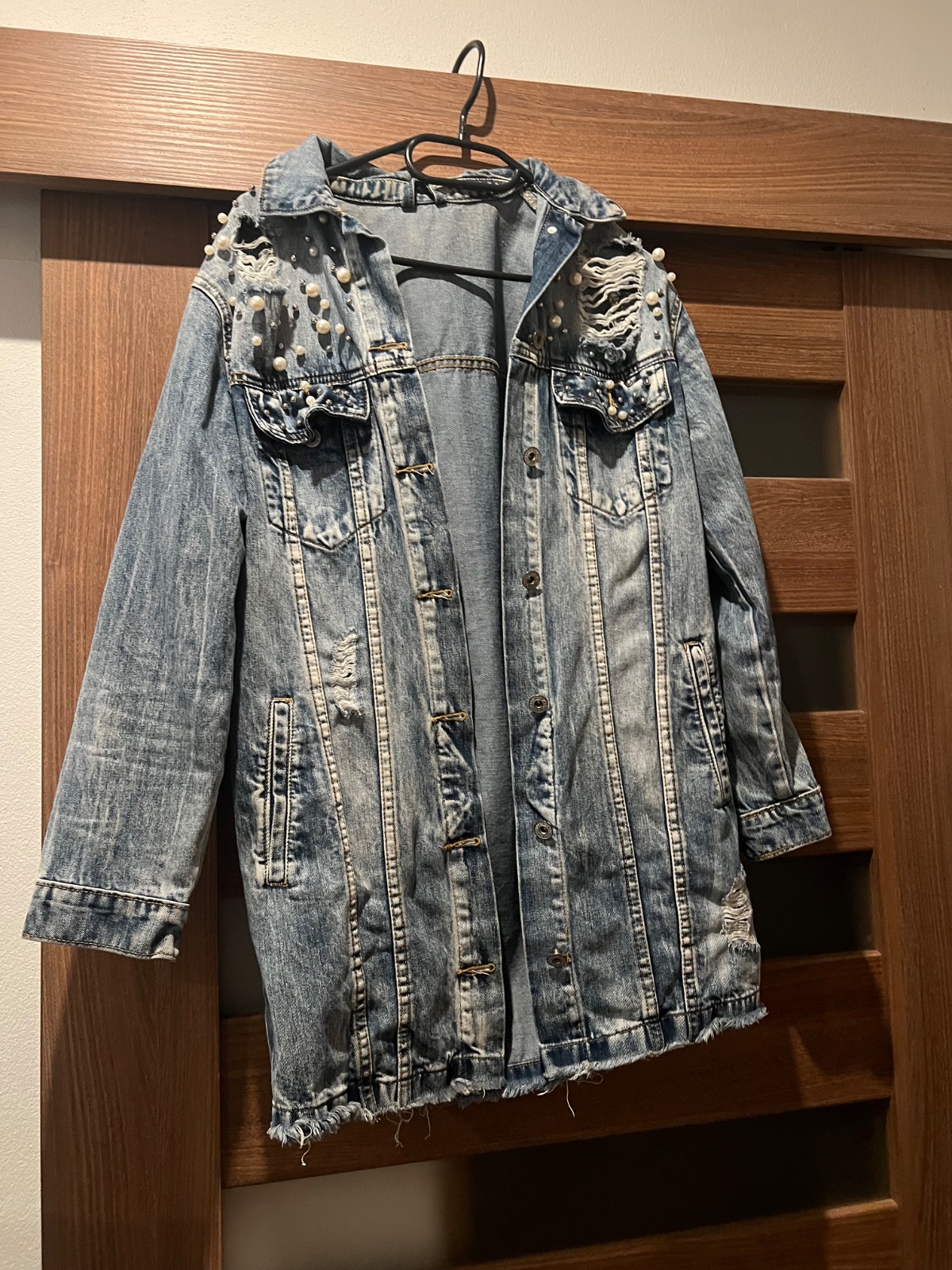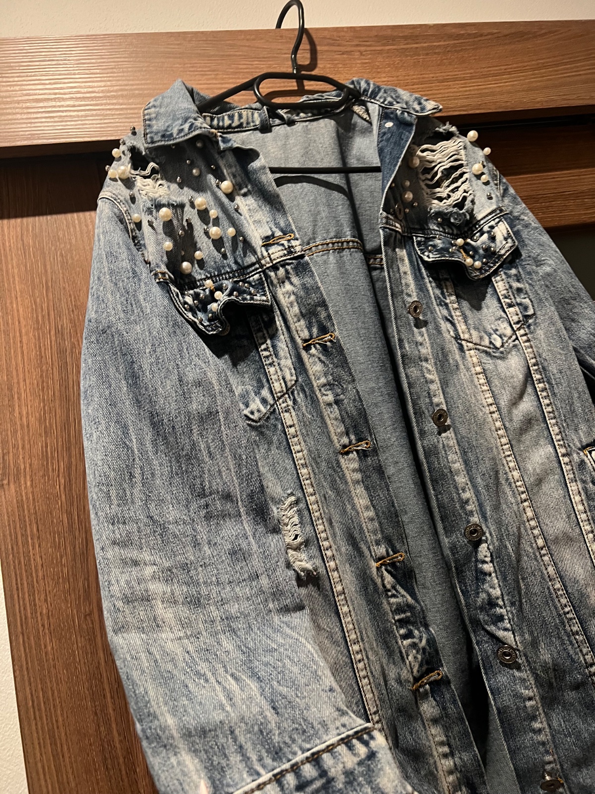 Vyteplená džínsová bunda vzadu s výšivkou. OVERSIZE veľkosť. Zapínanie na gombíky, vpredu vrecká. Dĺžka 67 cm a prsia 53 cm.