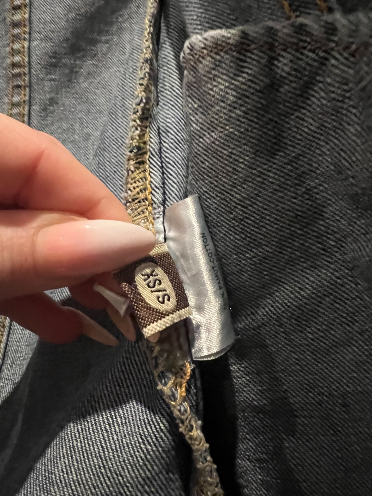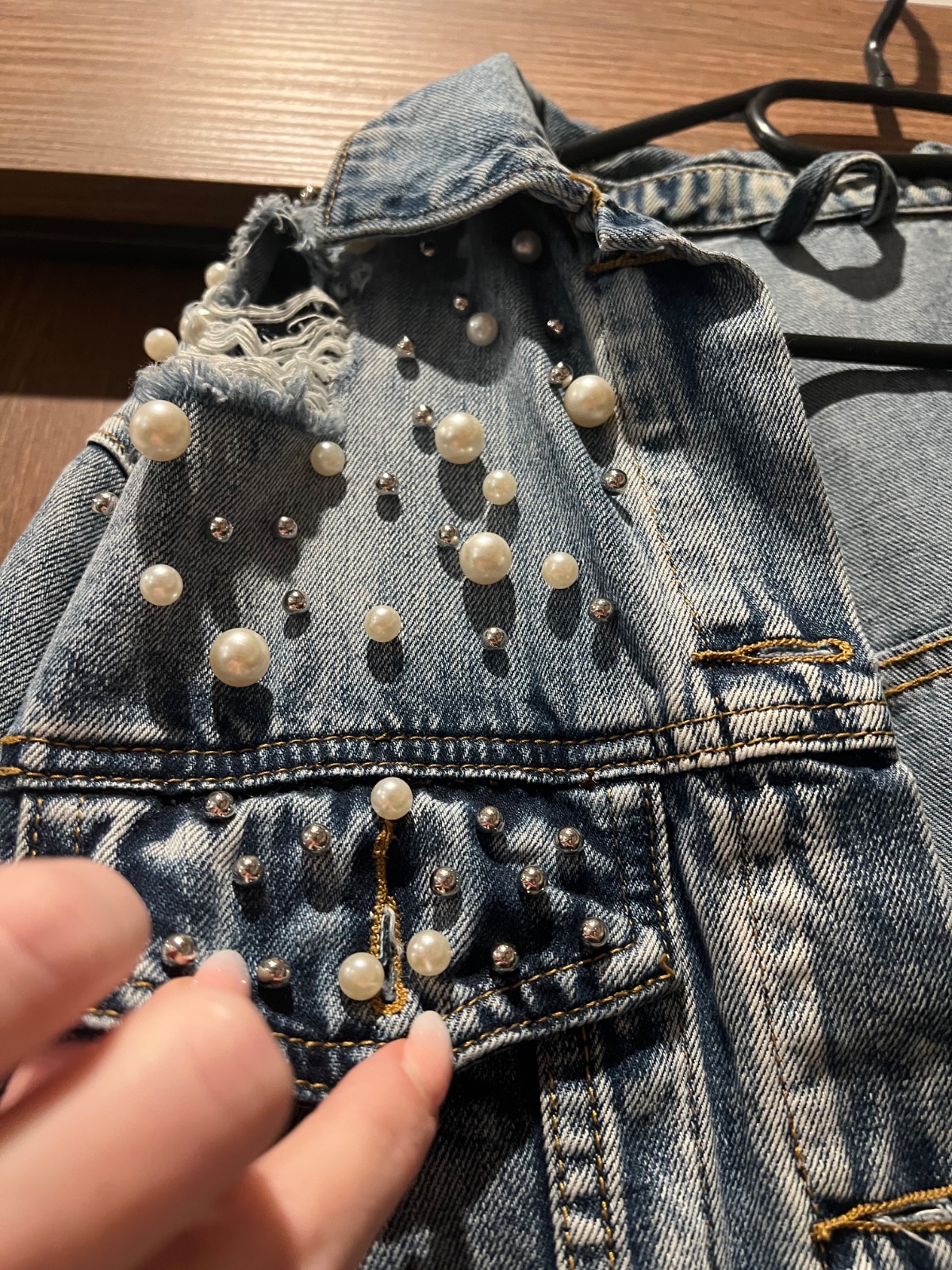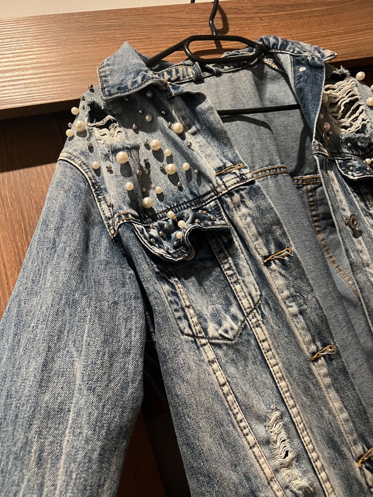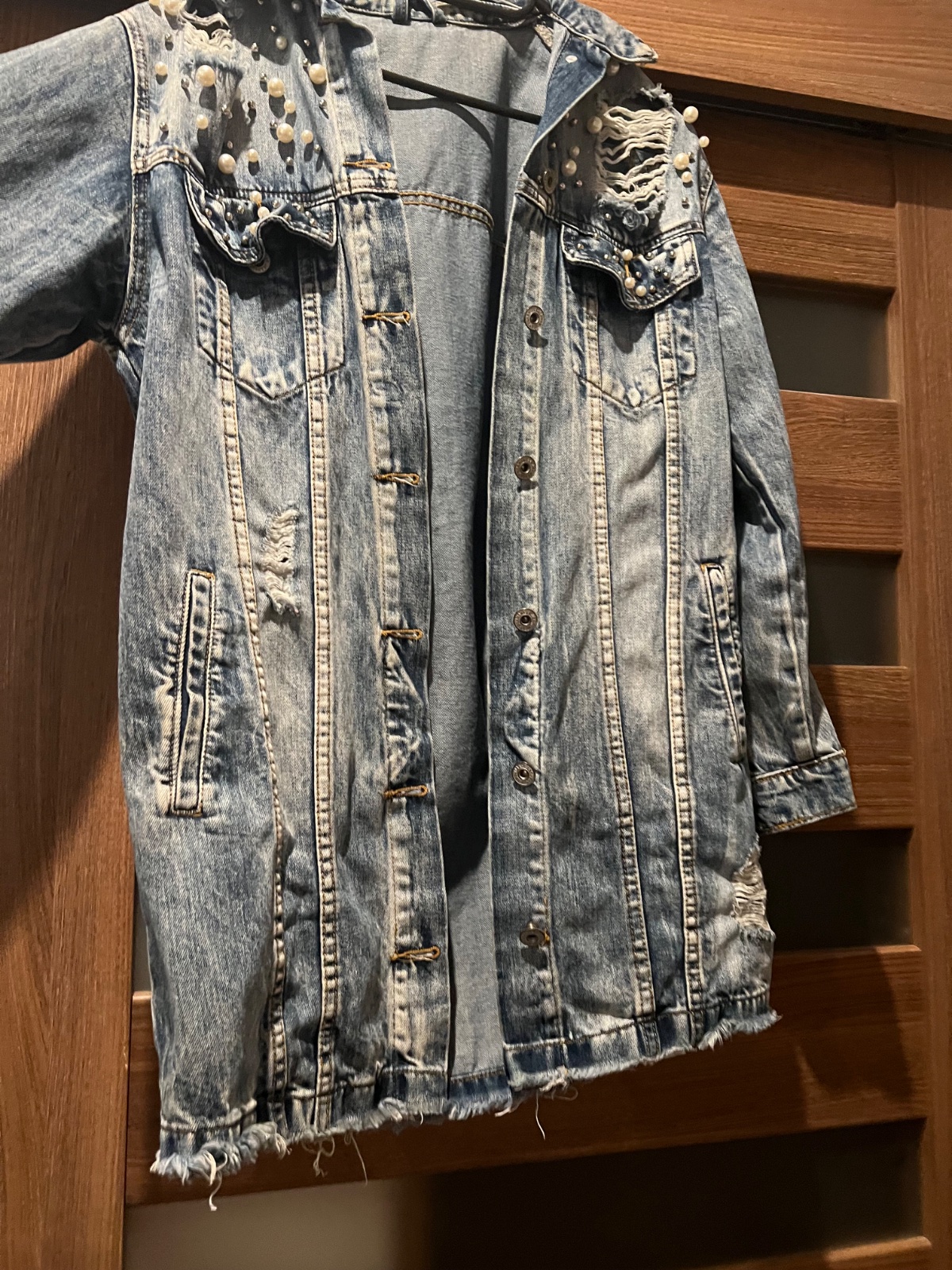 Vyteplená džínsová bunda vzadu s výšivkou. OVERSIZE veľkosť. Zapínanie na gombíky, vpredu vrecká. Dĺžka 67 cm a prsia 53 cm.