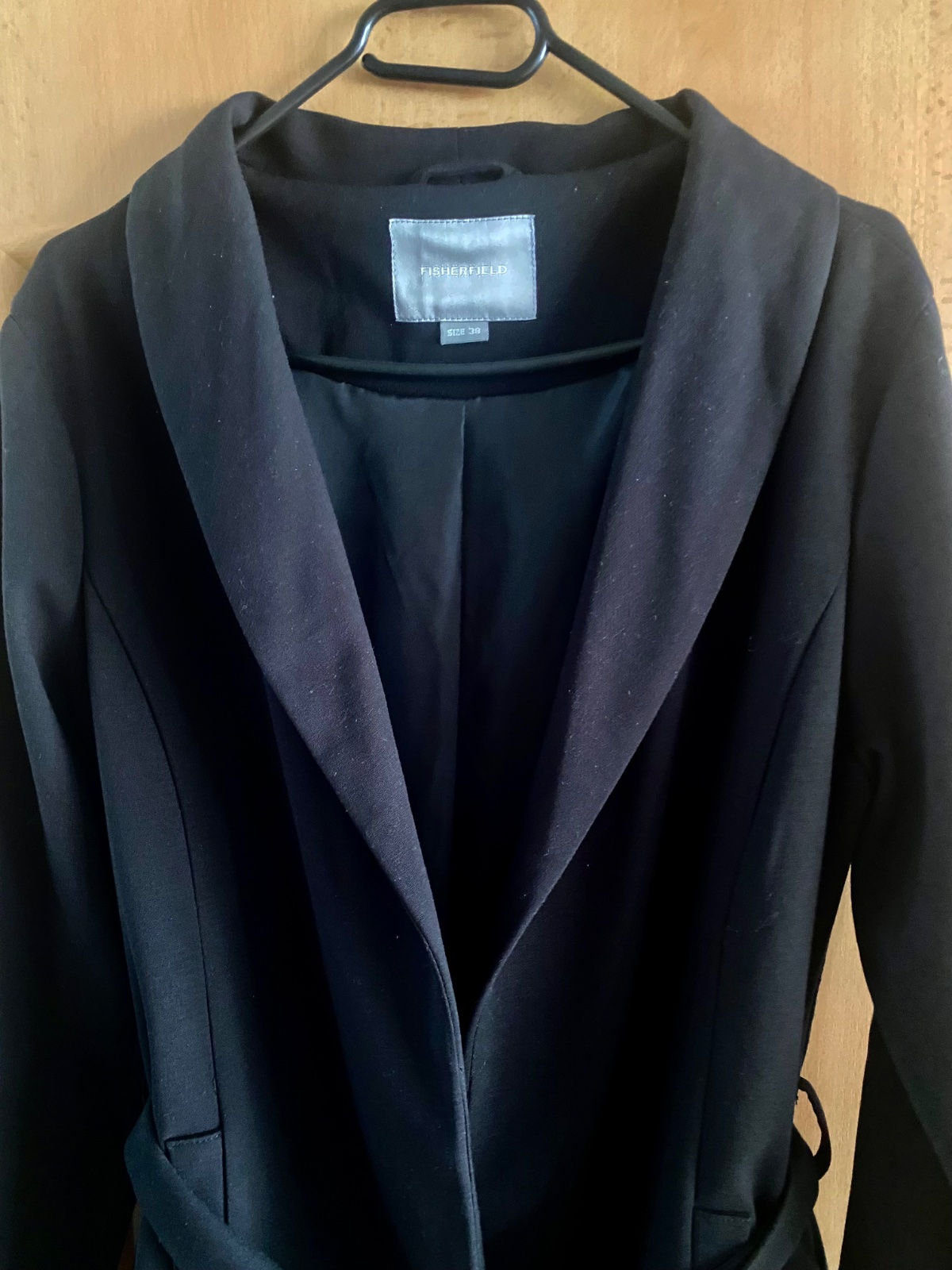 nenosené čierne predĺžené sako bez gombíkov Fisherfield, s opaskom, s podšívkou, top stav