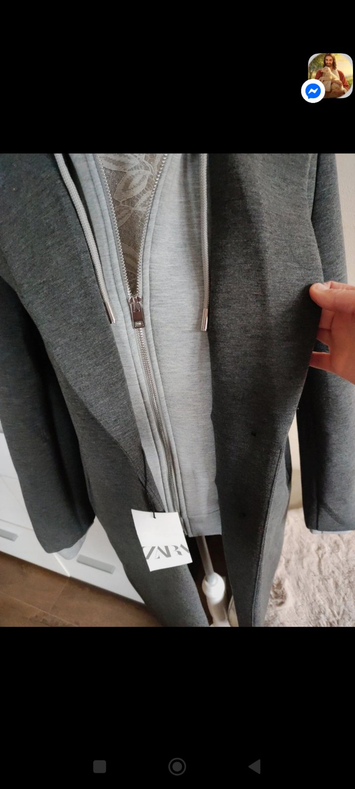 Ponúkam krásny nový,mne úzky.... veľkosť S,aj sadne na S.... kapucňa aj sivé časti sa dajú odňať..... dĺžka 94, šírka cez hrudník 48