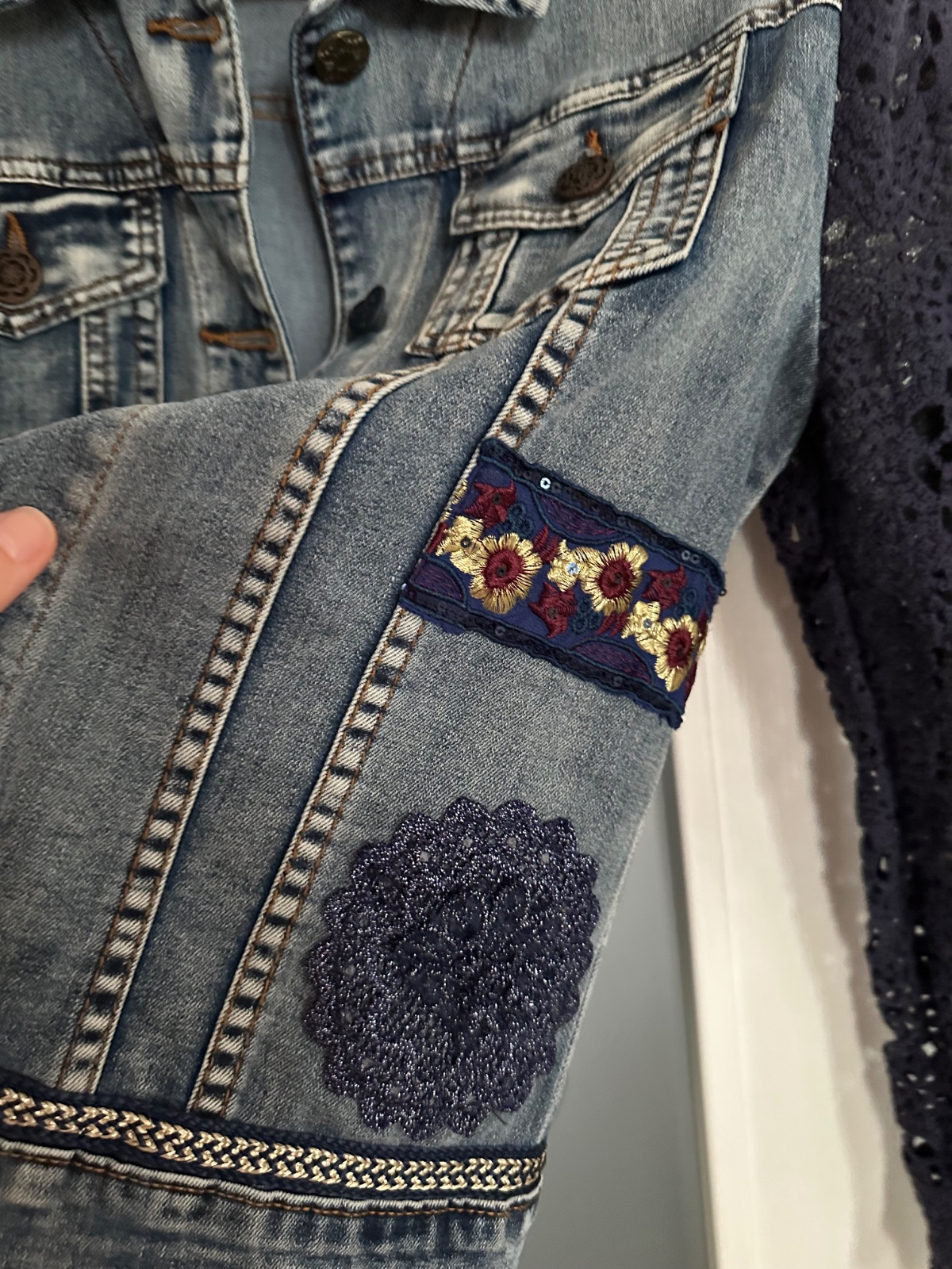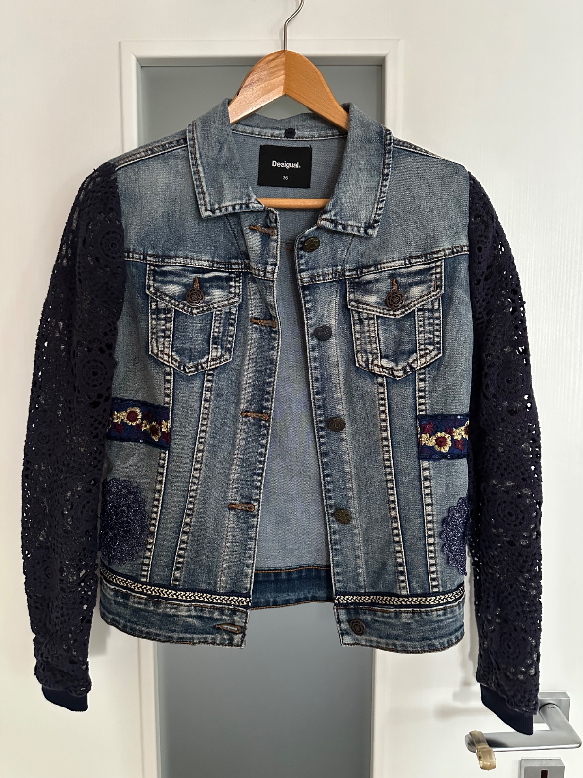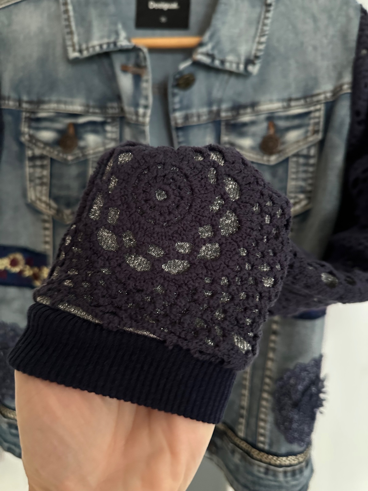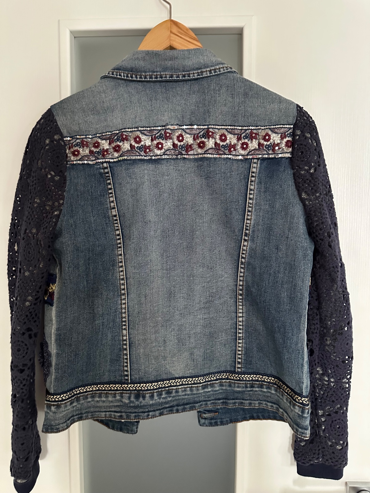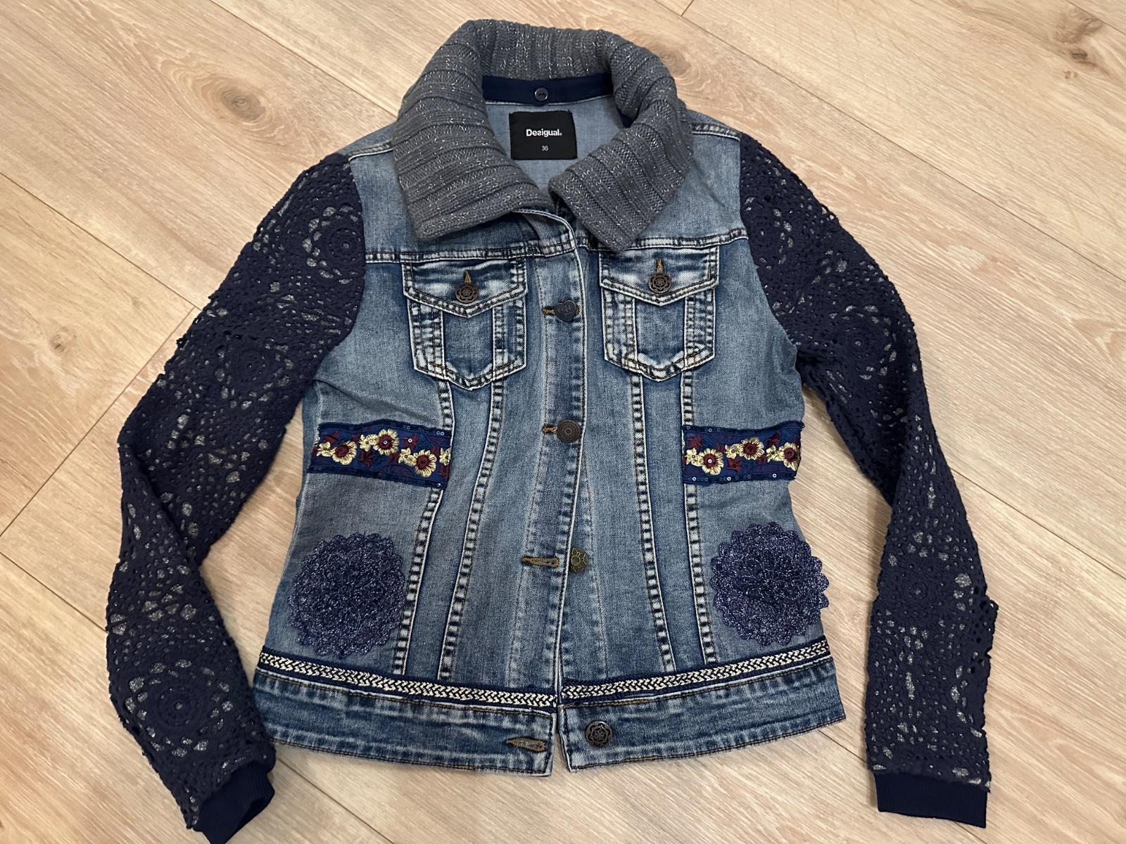 Krásna riflová bunda s nádhernými detailami. Rukáv má elastický-akoby bavlna a obkolesený hačkovinou, je to krásny detail bundy. Bunda je ako nová, top stav, naozaj krásna.