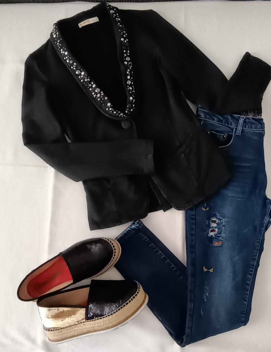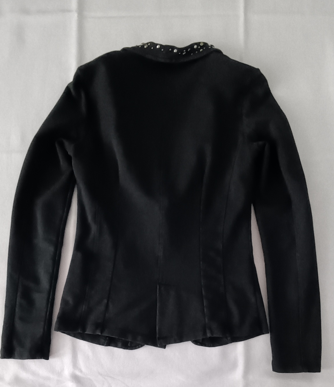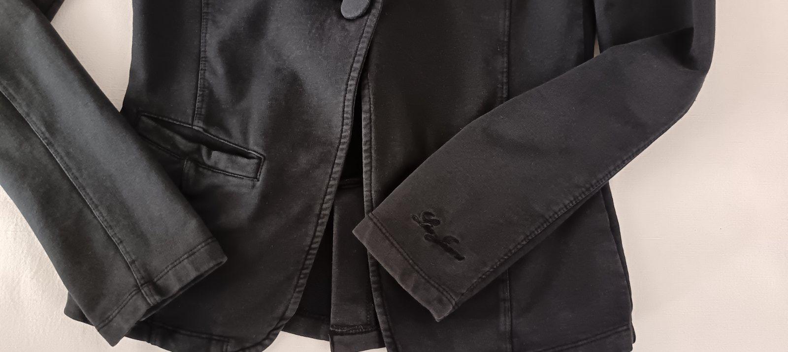 Krásne sexi obtiahnuté sako, farba nie je celkom čierna, skôr veľmi tmavošedá - odtieň antracit, hrubý elastický úplet, logo vyšité vo farbe na rukáve, vnútro cvernové, 97% bavlna, 3% elastan, v super stave, chýba len jeden kamienok, zohľadnené v cene.