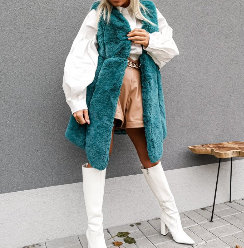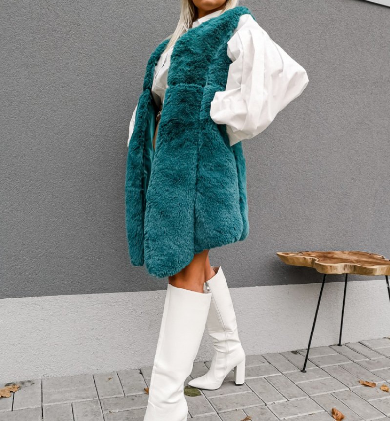 Trendy zateplená vesta kožušinou s vreckami.Nádherná tyrkysová farba.Veĺ.UNI
