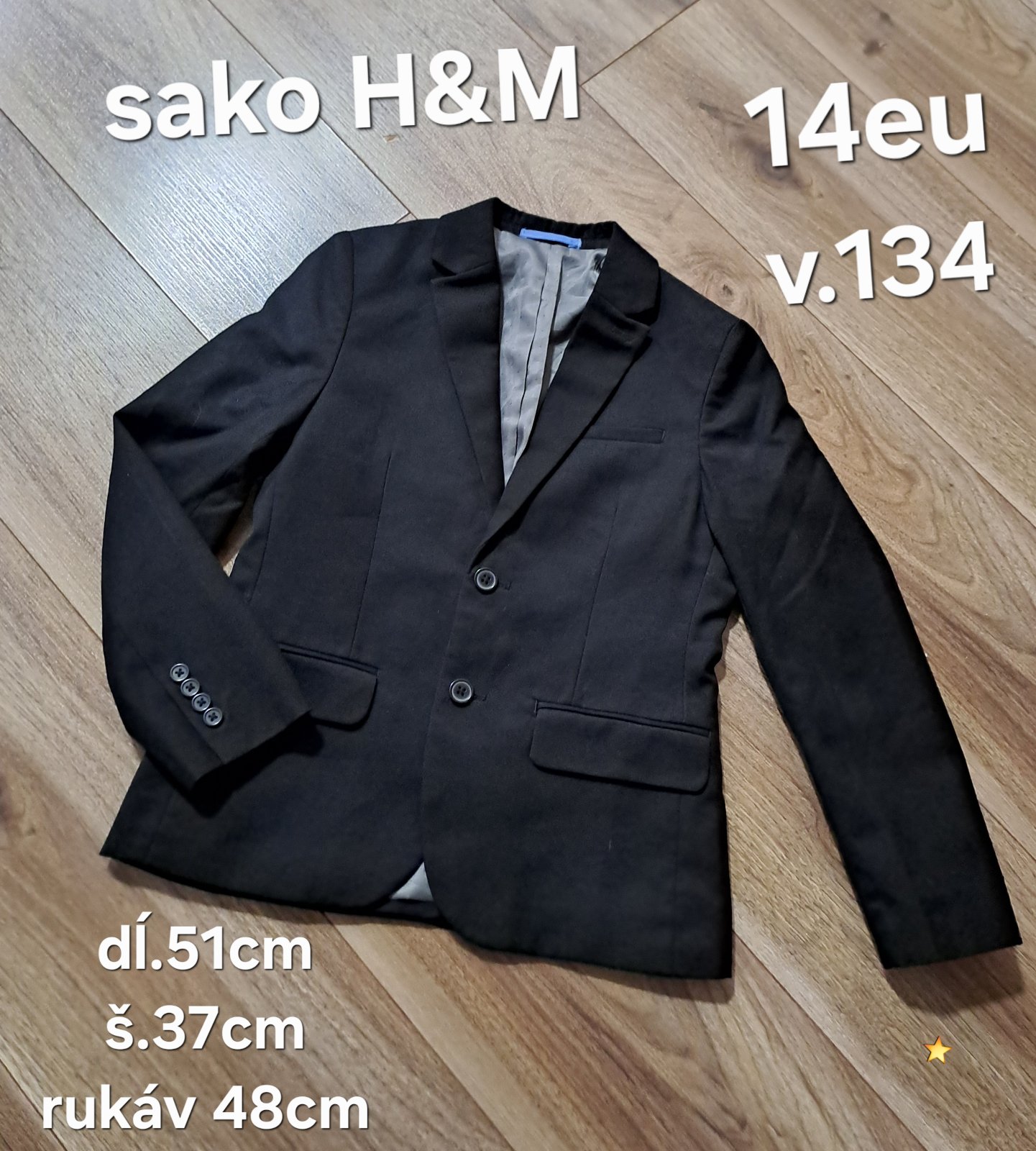 Predám veľmi zachovalé elegantné, párkrát oblečené sako známej značky H&M. Saténová chlopňa, aj detaily okolo vreciek. Uvedená veľkosť 134. Rozmery: dĺžka 58 cm , šírka pod pazuchami 37 cm, rukáv o...
