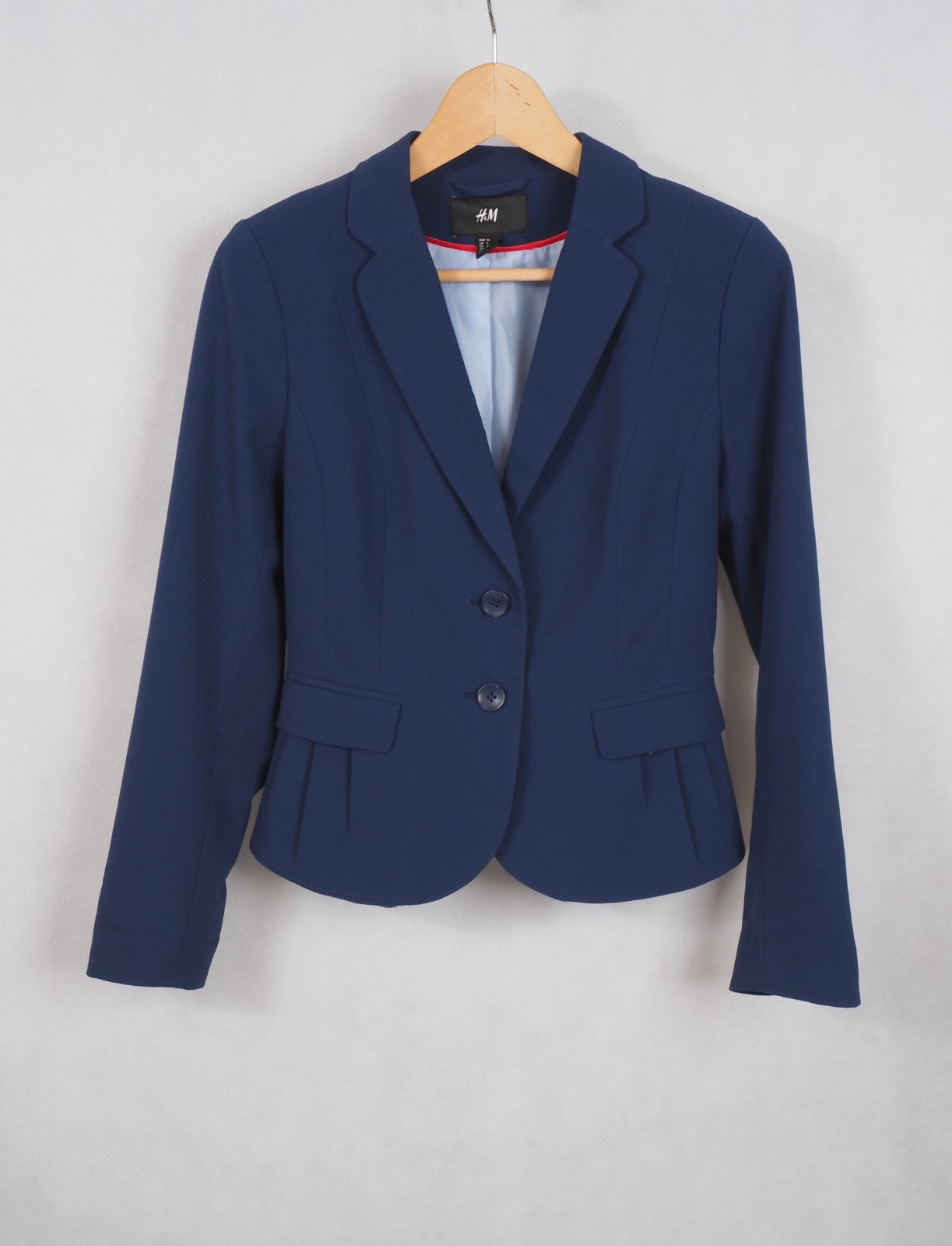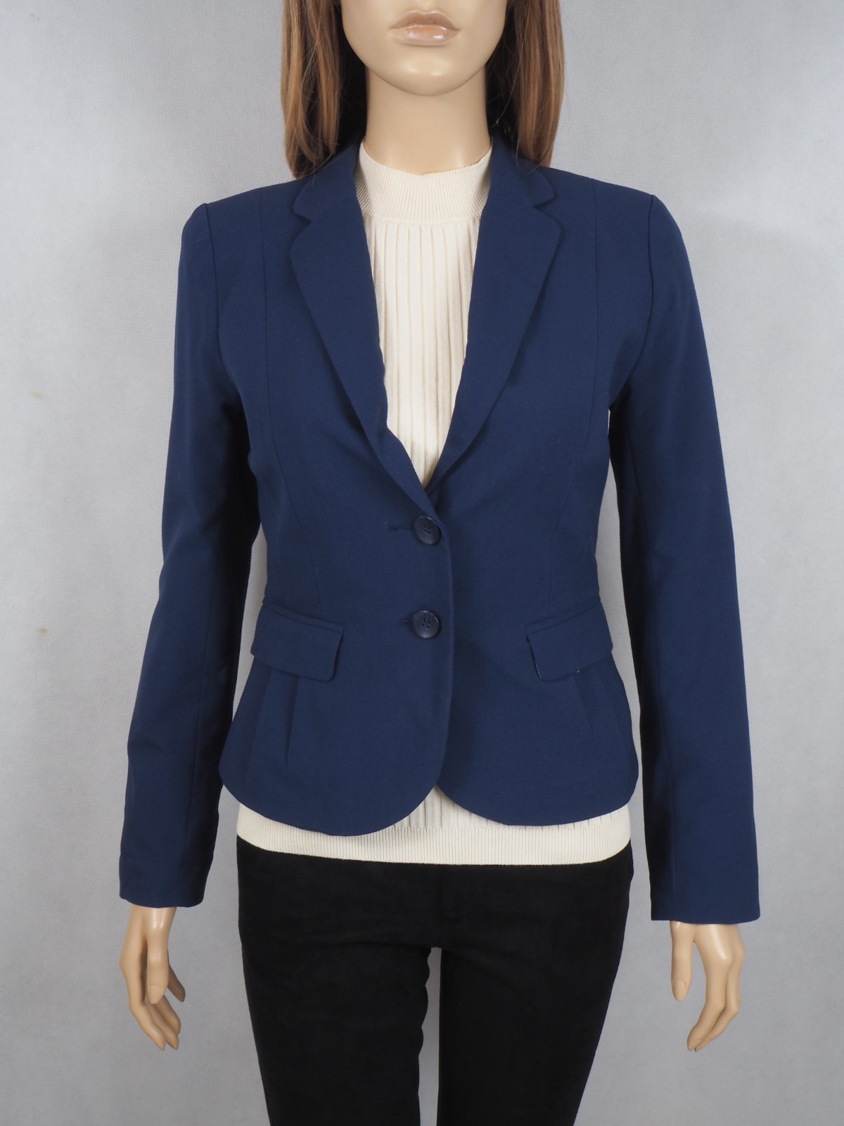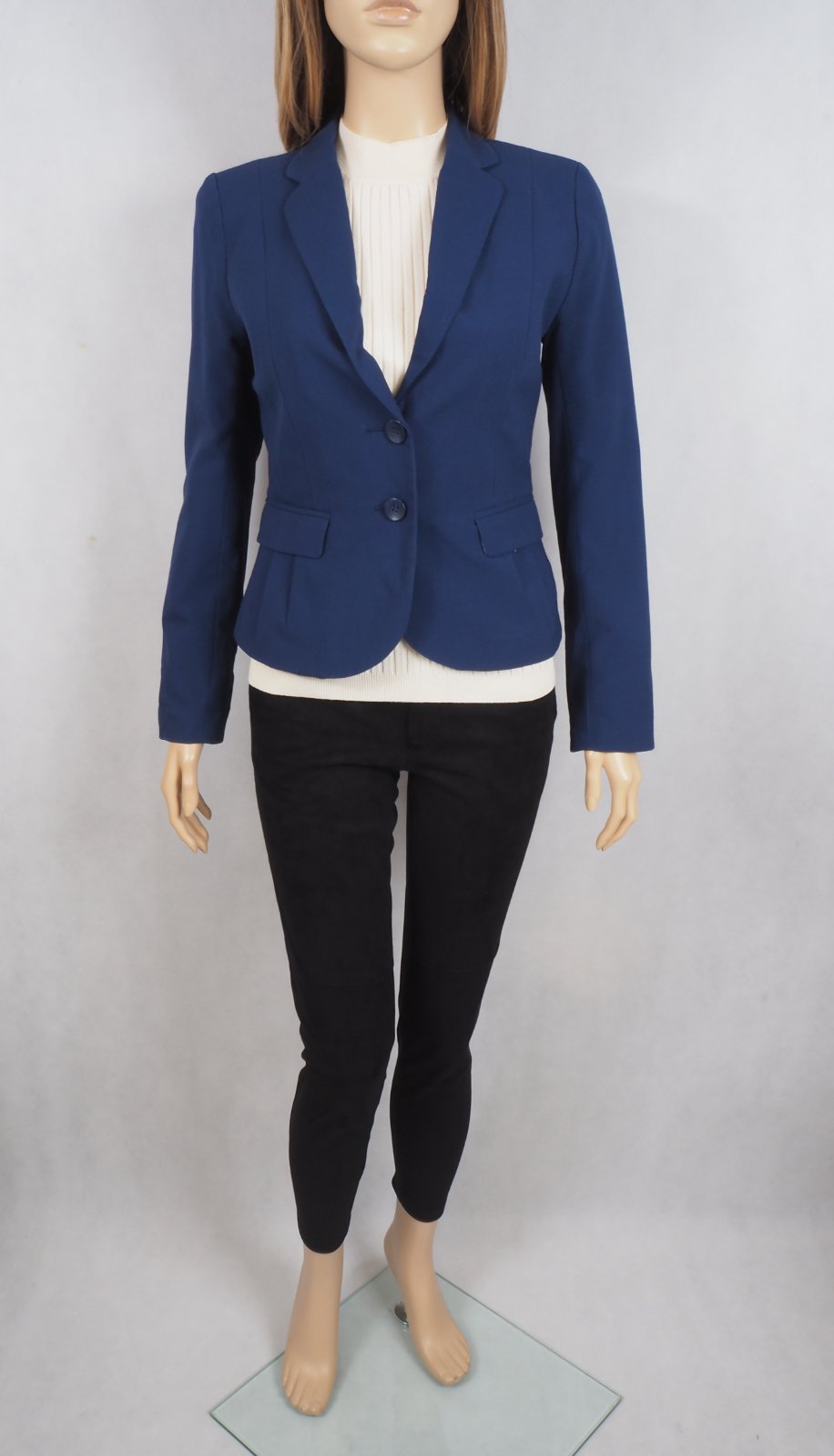 Kvalitné tmavomodré sako, zapínanie na gombíky, podšité, materiál 66% polyester, 30% viskóza, 4% elastan, super stav.