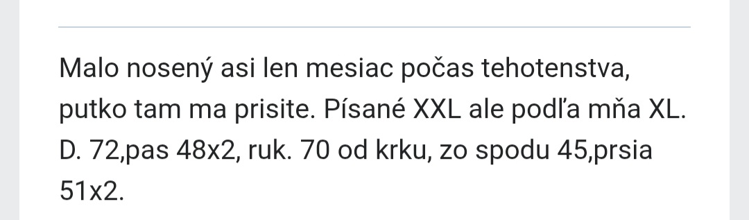 Nosený asi len mesiac počas tehotenstva. Písané XXL ale podla mňa je XL.Dlzka 72,pas 48x2,rukav 70 mer.od krku,,prsia 51x2