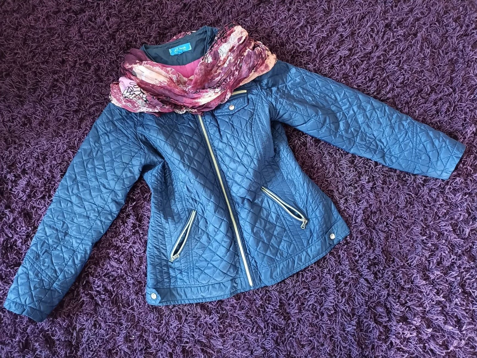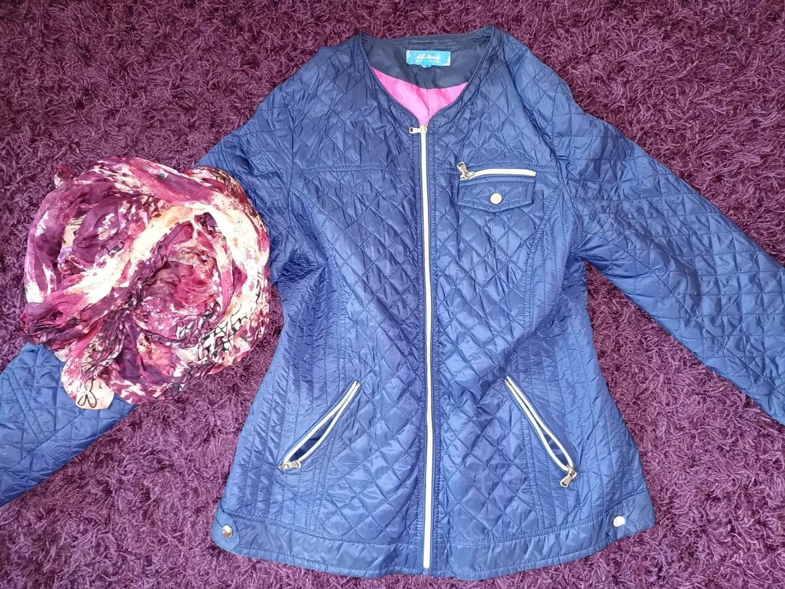*dámska prechodná bunda, farba najrealnejsia na poslednych dvoch fotkach, tmavomodra, vnutro ružove, vyborny stav, darček šatka.