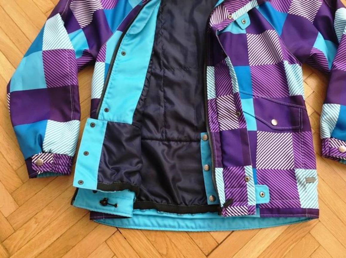 krasne vypracovaná zimná vetrovka, v super stave, málo nosená. Vetrovka je šitá na zákazku, vzor tlačený podľa vlastného návrhu- odtiene fialovej a modrej. Zapínanie na zips, prekrytý klopou na cvočky. Odopínacia kapuca so sťahovaním. Vpredu dve vrecká na zips, klopy falošné, vo vnútri jedno vrecko na zips, jedno na mobil, jedno vrecko na zips na rukáve. Dole pás proti podfukovaniu na cvočky.