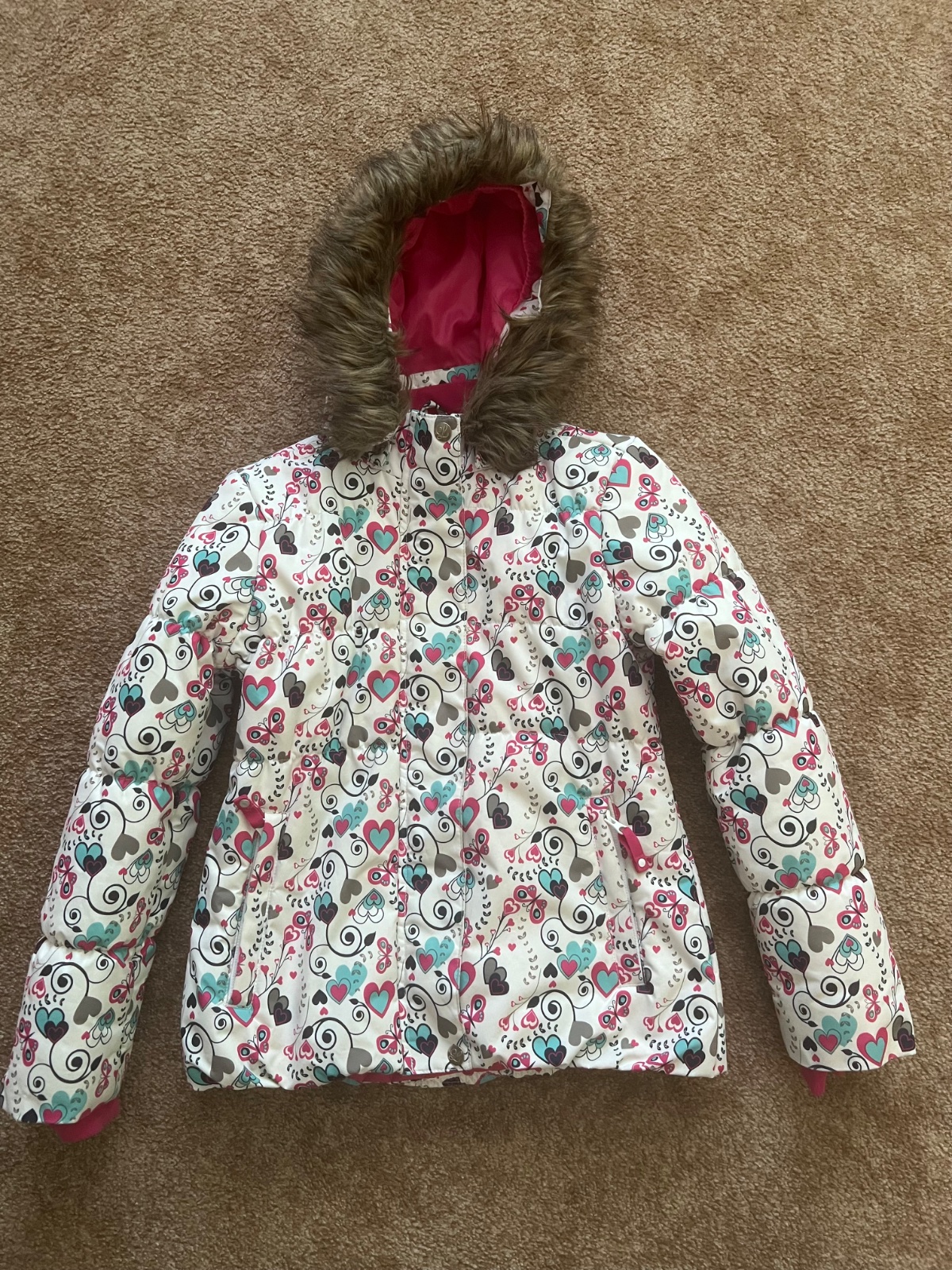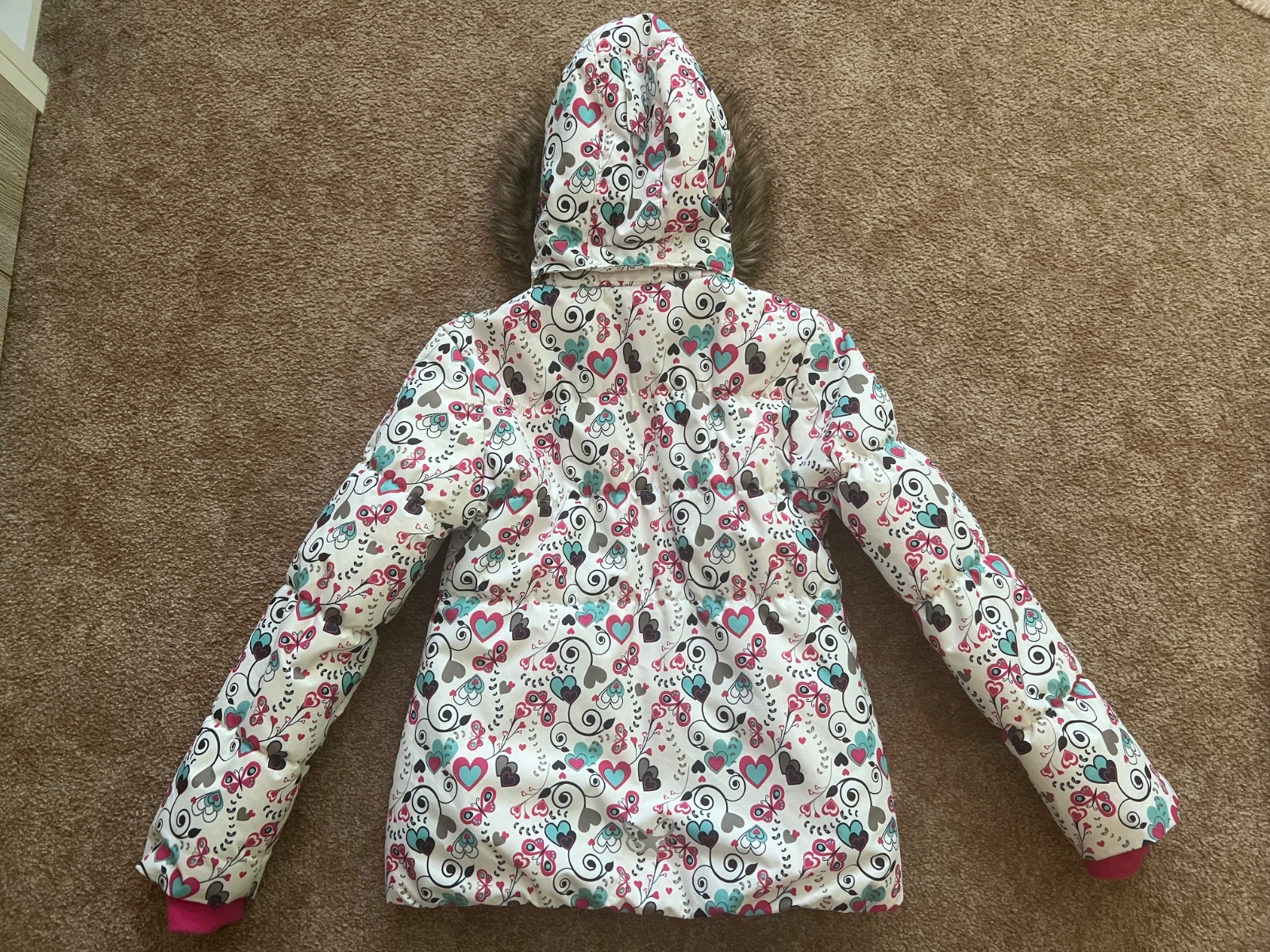 Predám krásnu a zachovalú zimnú bundu, ktorá bola používaná iba sviatočne. Veľkosť 140/146. Značka Lewro. Kapucňa sa dá dať dole. Celková dĺžka cca 57-58cm, šírka cca 43cm.