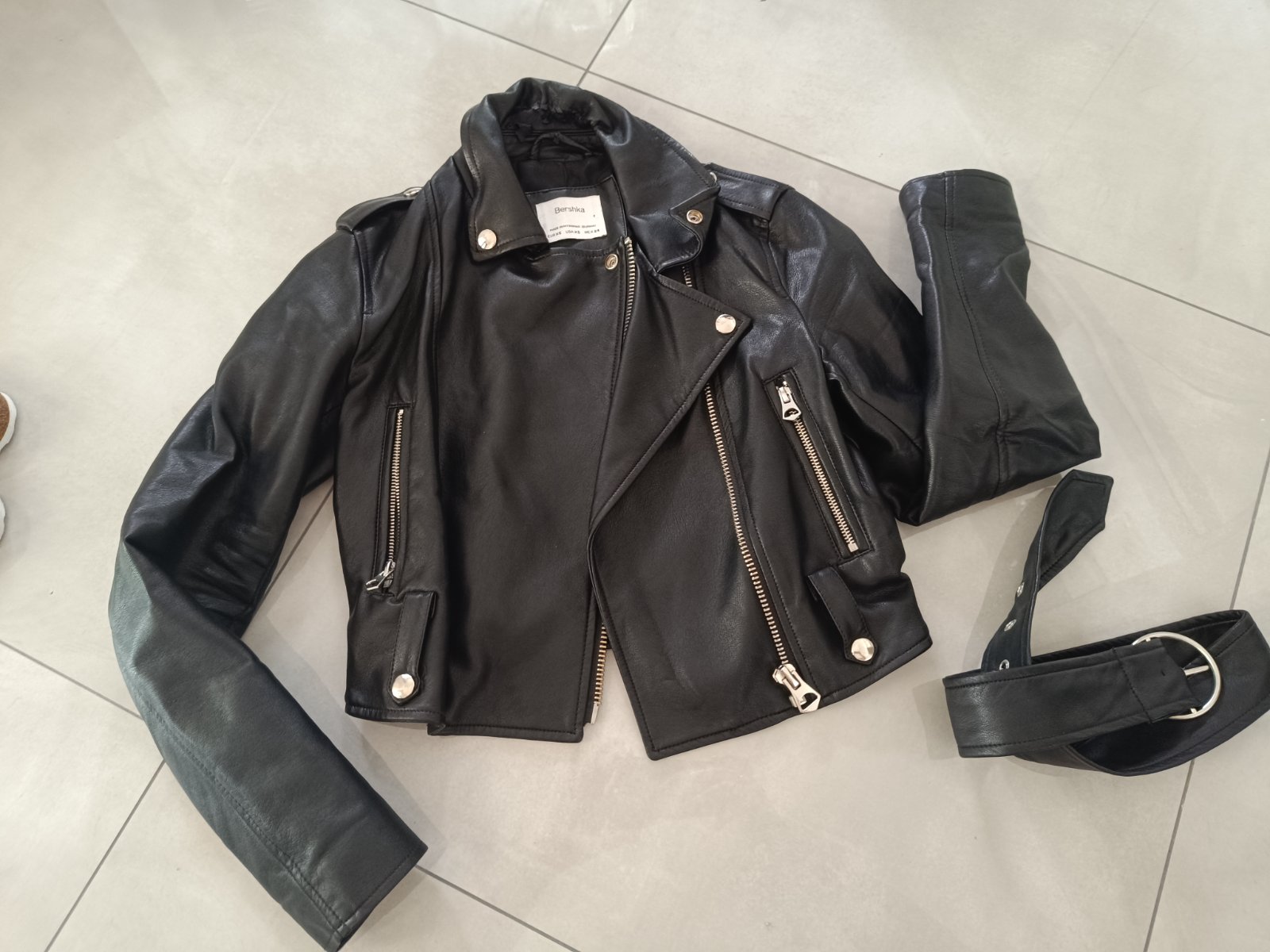 čierna koženková bunda Bershka velkost xs ako nova bez chyb a poškodeni, suknička k bundičke cena dohodou