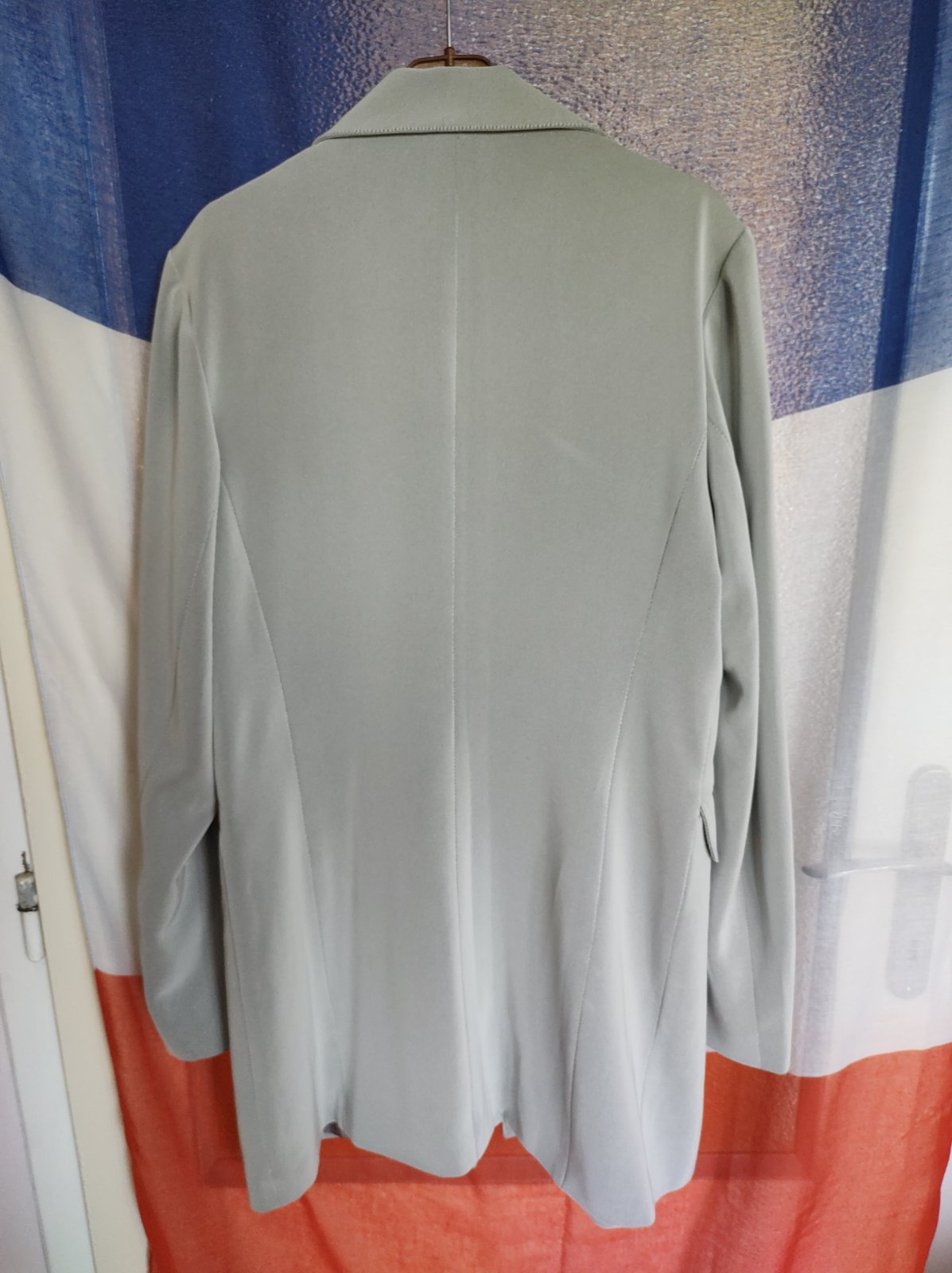 Kabát na zaväzovanie s vreckami. Vzatý párkrát, nepoškodený. Celková dĺžka 95 cm.