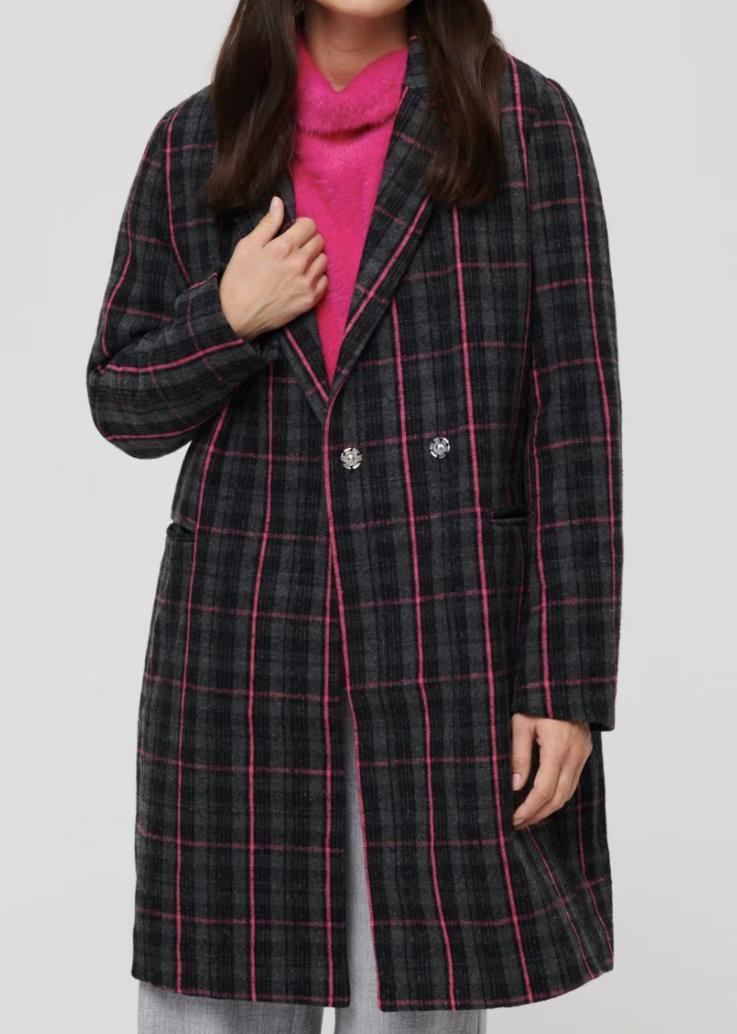 Dlhý kabát v károvanom vzhľade, tmavošedej farby doplnenej tmavoružovou. Zapínanie dvojradové, na patentku, c vreckami po bokoch, kabát je aj s podšívkou. Veľkosť M, oblečený 2x, perfektný stav. Dĺžka 91cm, šírka 2x48cm, boky 2x52cm, rukáv od ramena 63cm.