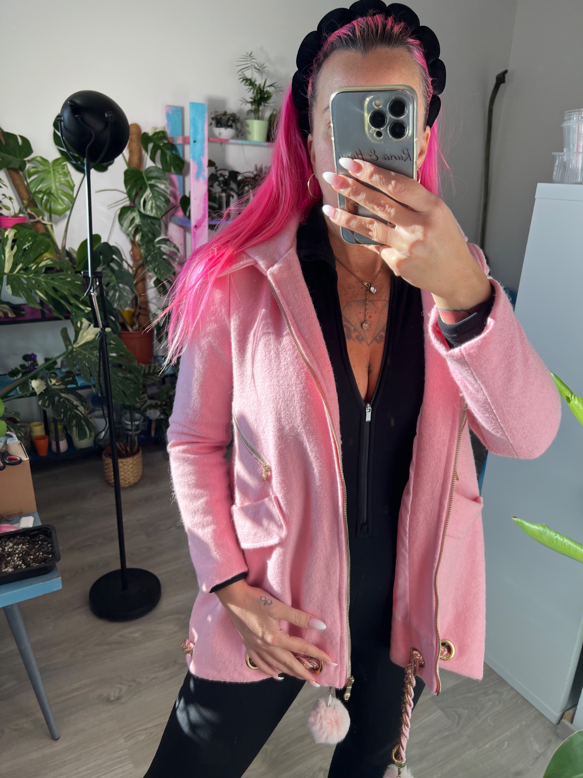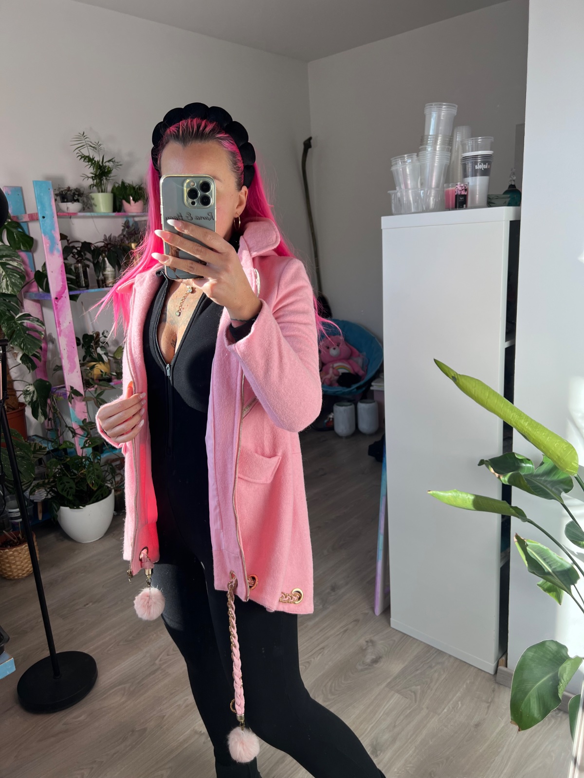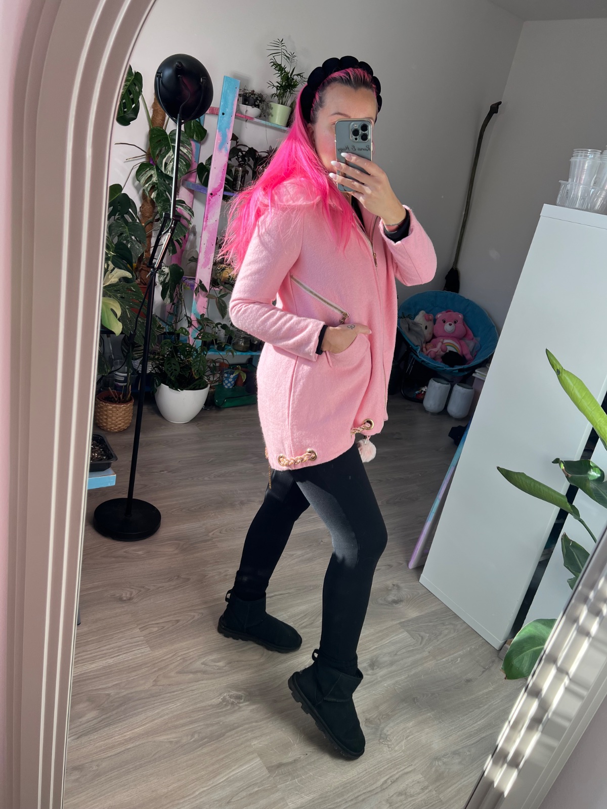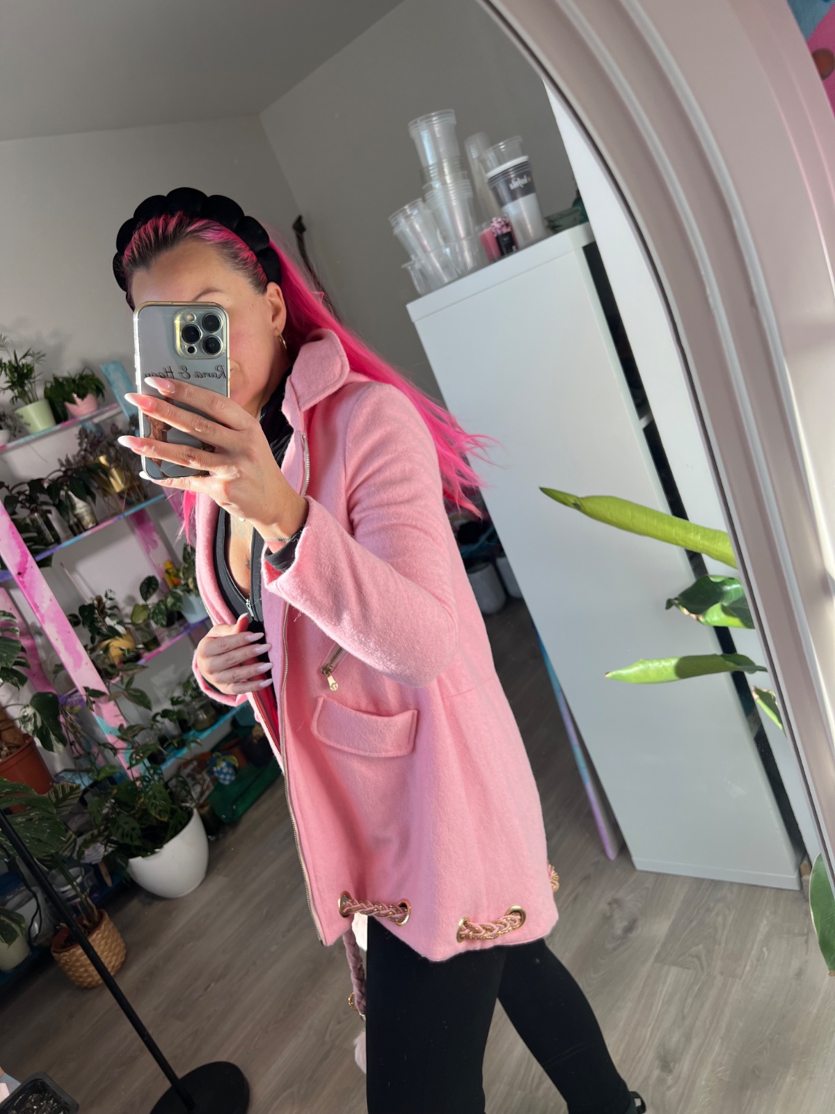 Dlhy bledo ruzovy damsky kabat na gombik. Sedi na XS.