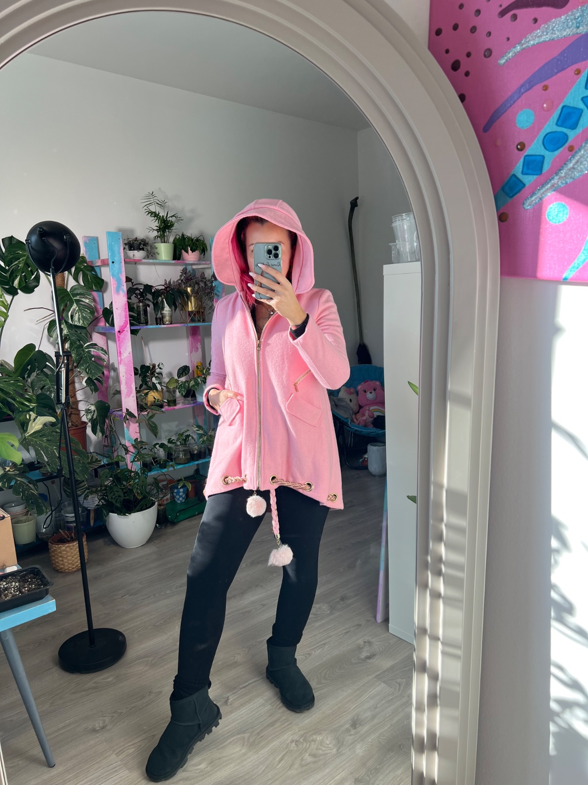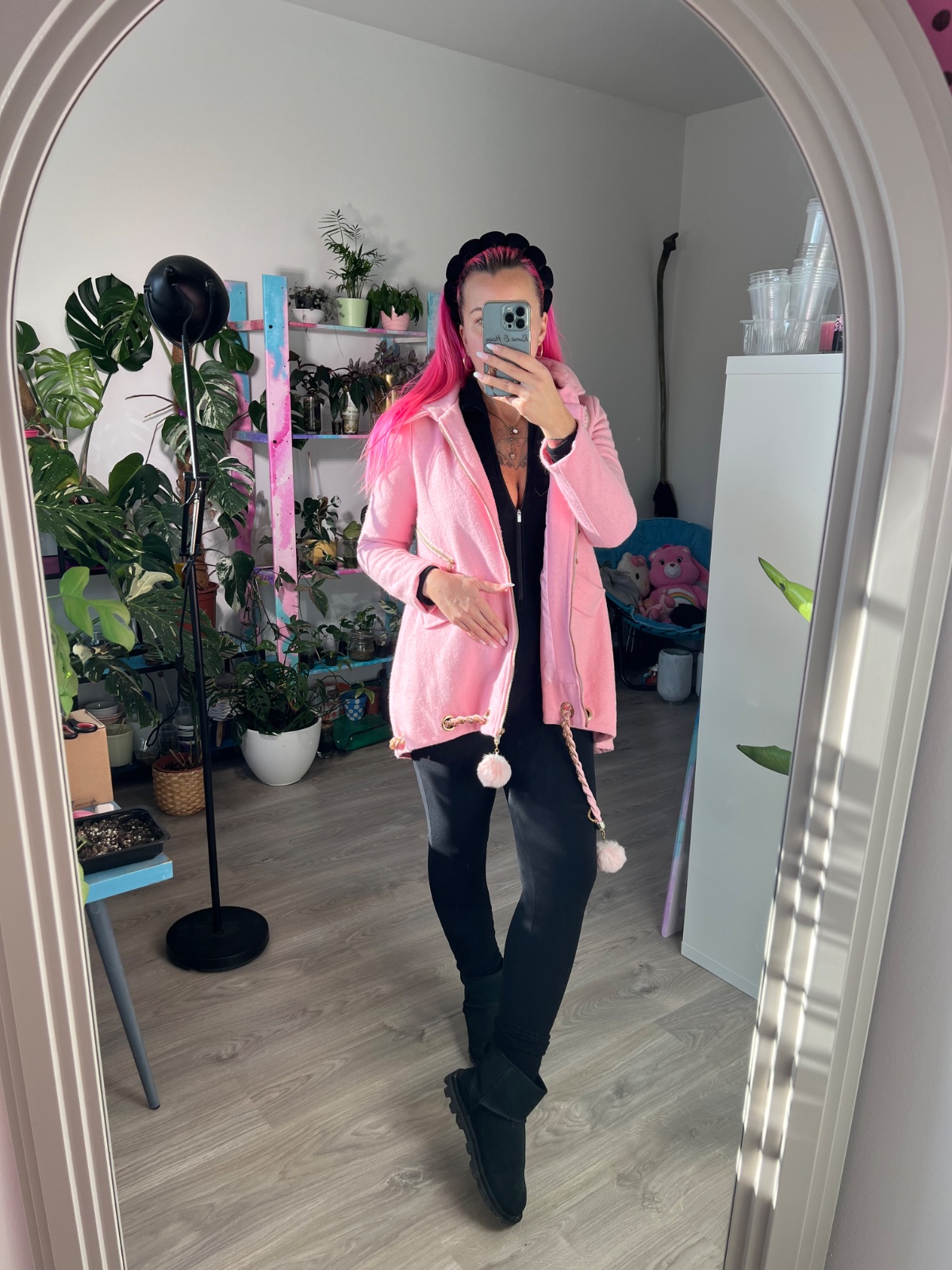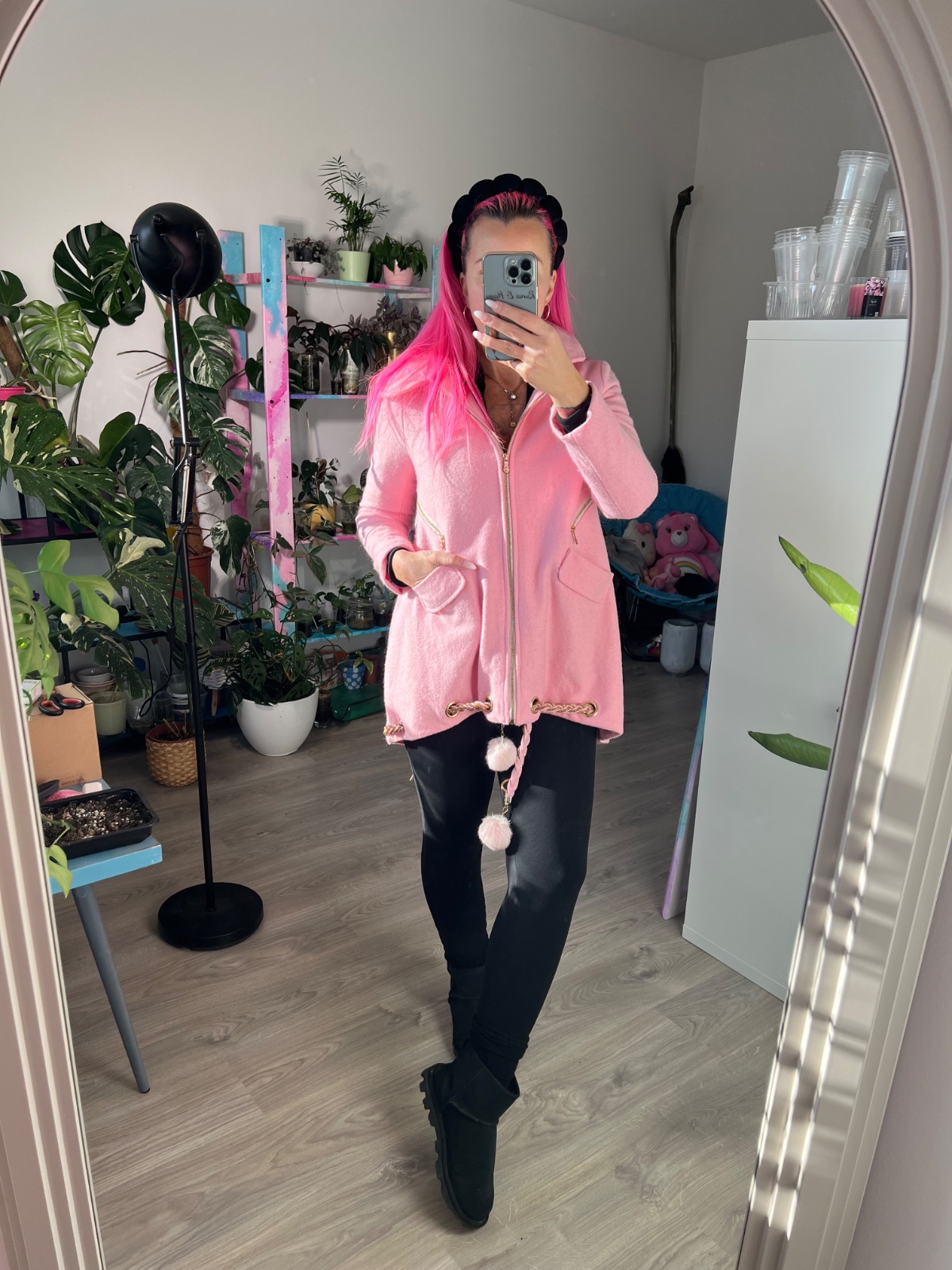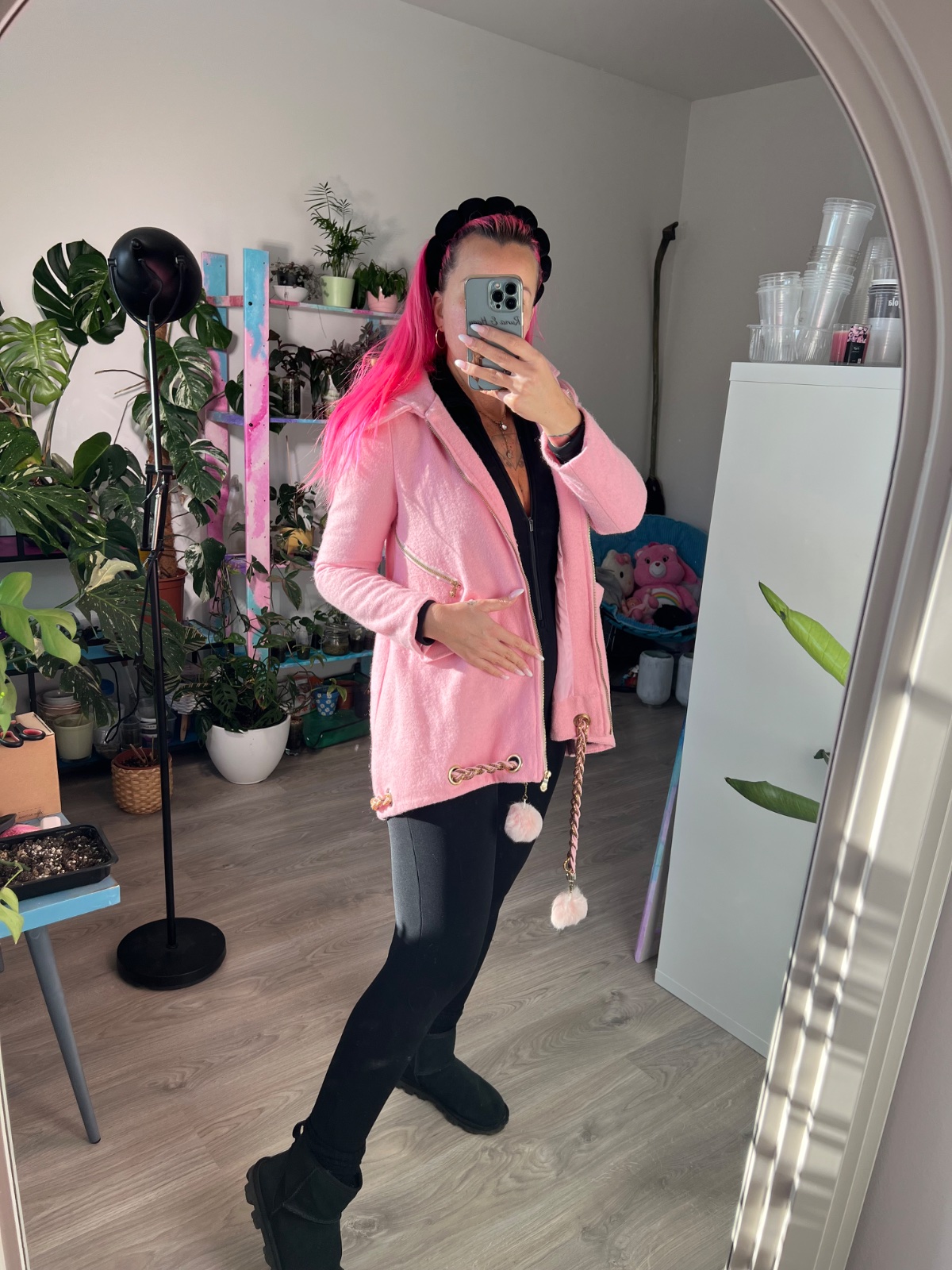 Dlhy bledo ruzovy damsky kabat na gombik. Sedi na XS.