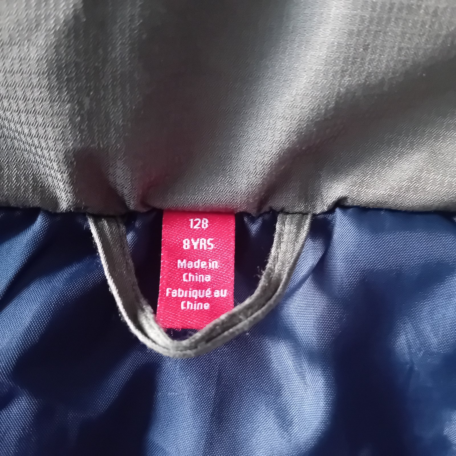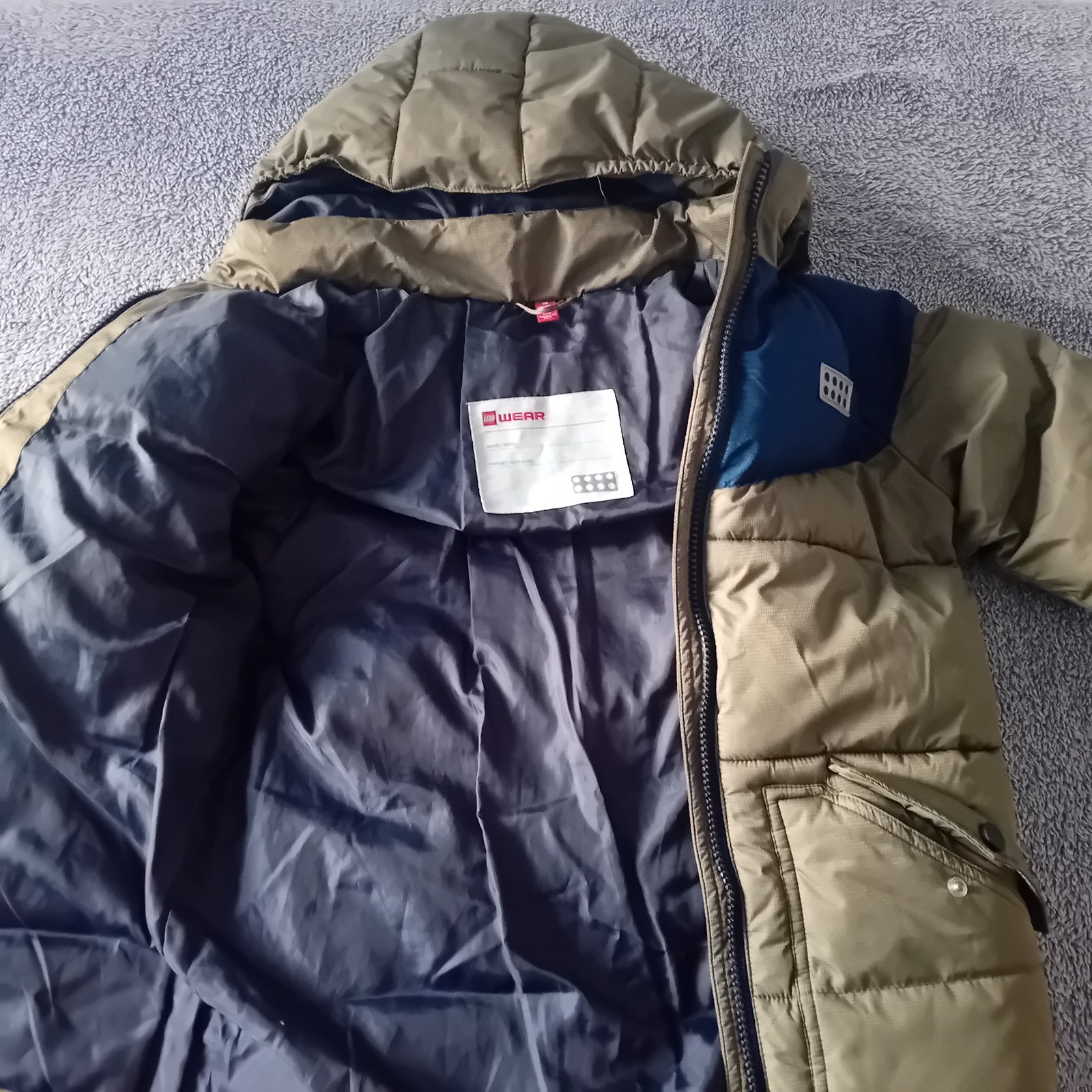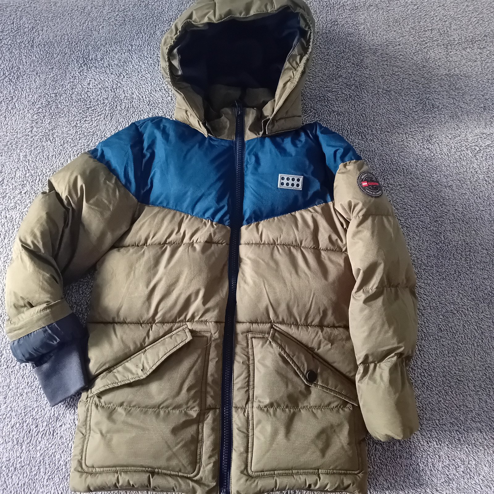 Teplá bunda. Funkčné zipsy, odnímateľná kapucňa. Reflexný prvok na zadku a na hrudi (Lego kocka). Na rukávoch trochu ošúchaná, viď. foto.