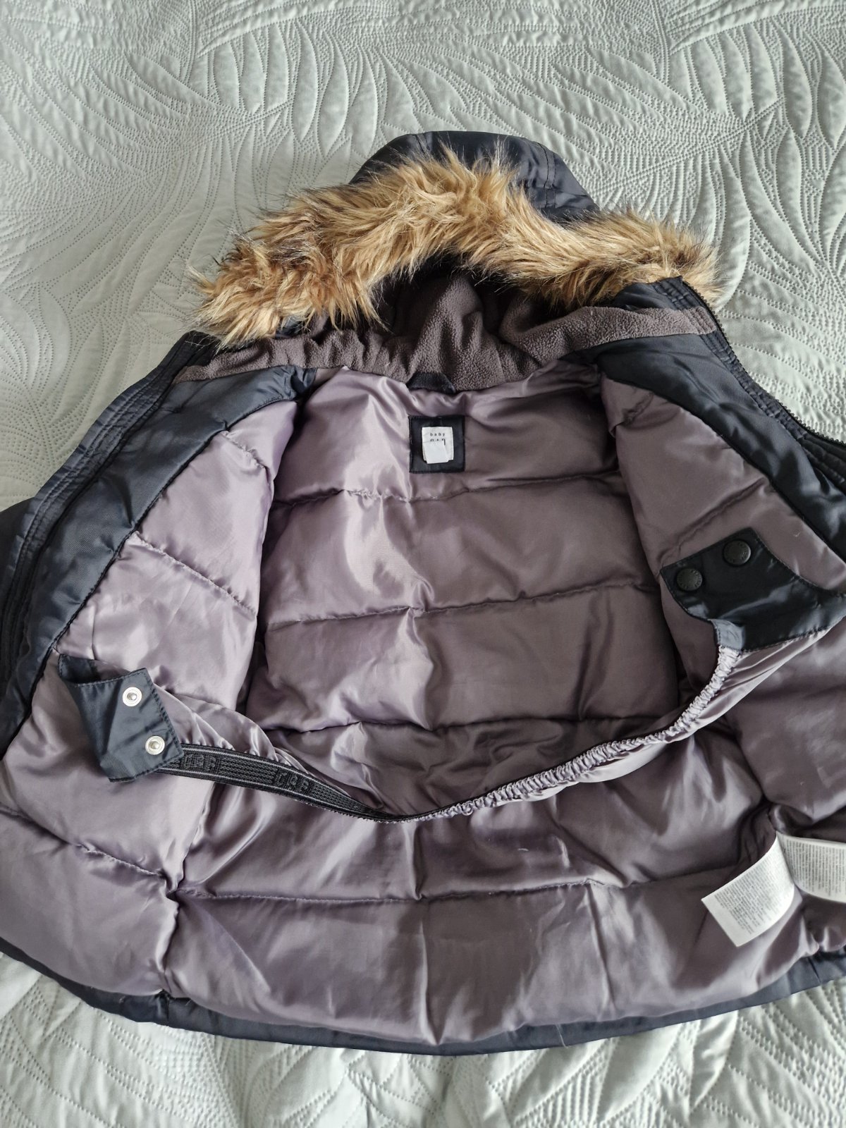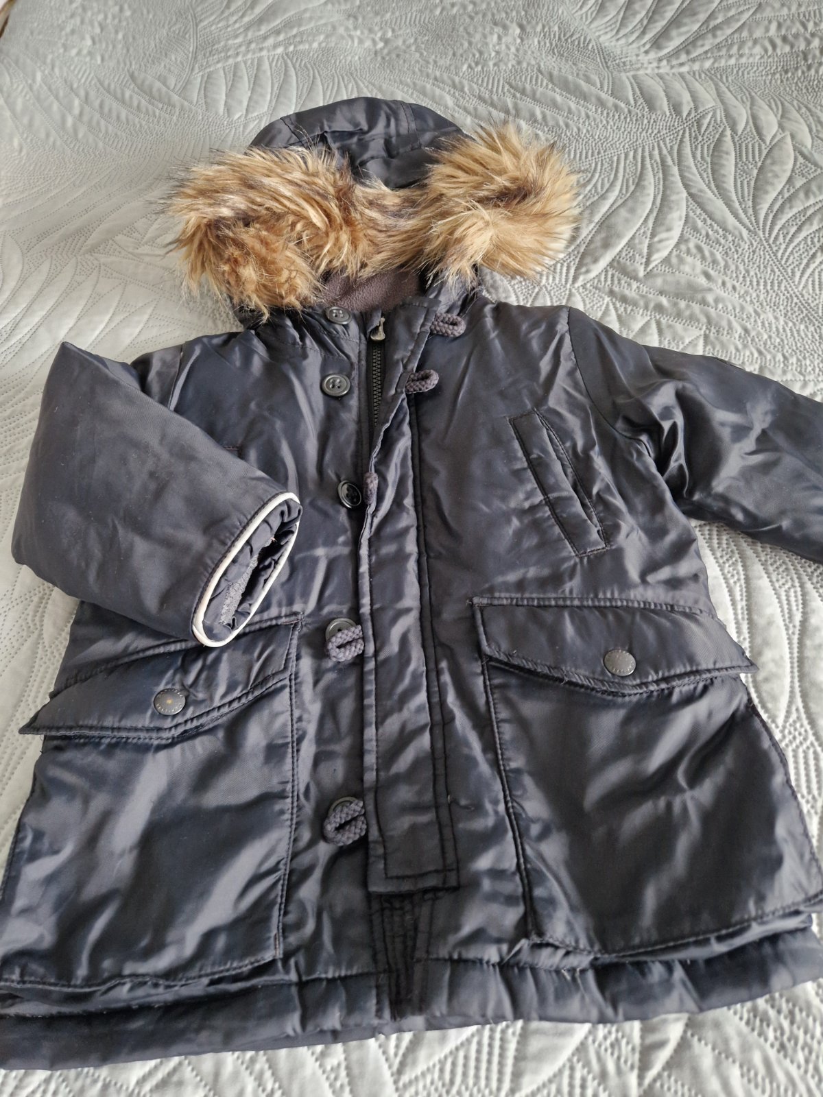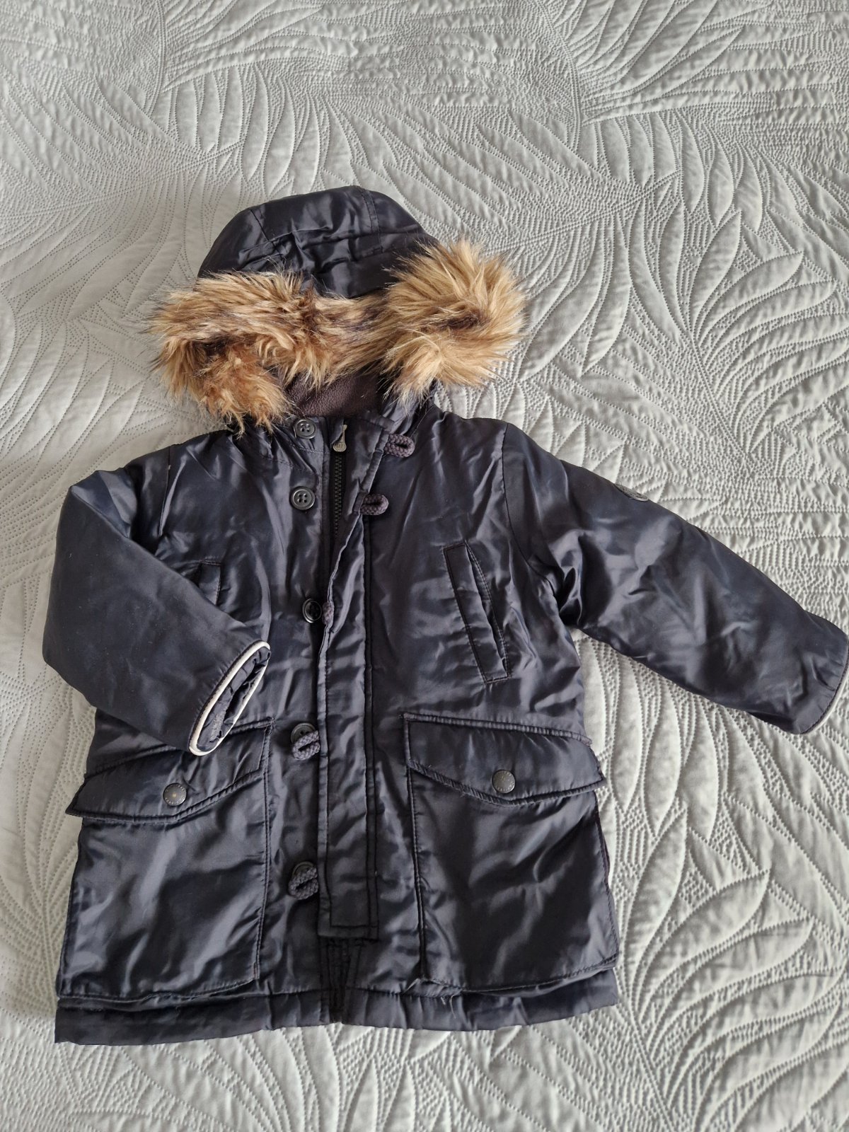 Teplá páperová zimná bunda, veľkosť 2 roky, odnímateľná kožušina na kapucni.