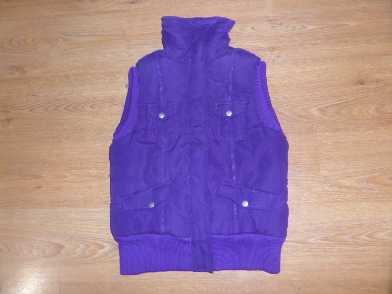 Predám krásnu zateplenú vestu, fiovej farby, po stranách má 2 vrecká na zips a vo vnútri 1 vrecko na zips. Veľkosť - medium.Dĺžka - 61 cm, šírka- 48cm×2 pod pazuchami, okolo pása 45cm×2, na spodu 4...