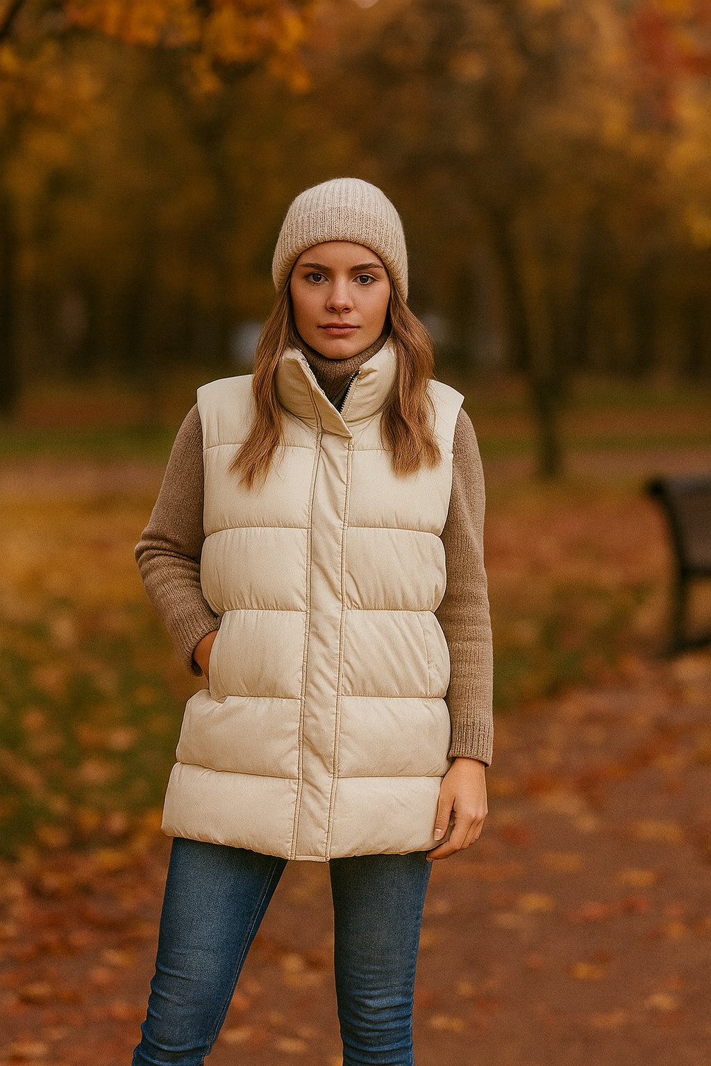 Elegantná dlhšia dámska vesta v ecru farbe . Ľahká, hrejivá a štýlová voľba pre jesenné dni. Ideálna na kombinovanie s džínsami a svetríkom.Dámska dlhšia prešívaná vesta v elegantnej ecru (svetlo krémovej) farbe je ideálnou voľbou pre prechodné obdobie. Vďaka predĺženému strihu do polovice stehien jemne predĺži postavu a postará sa o teplo počas chladnejších jesenných dní.