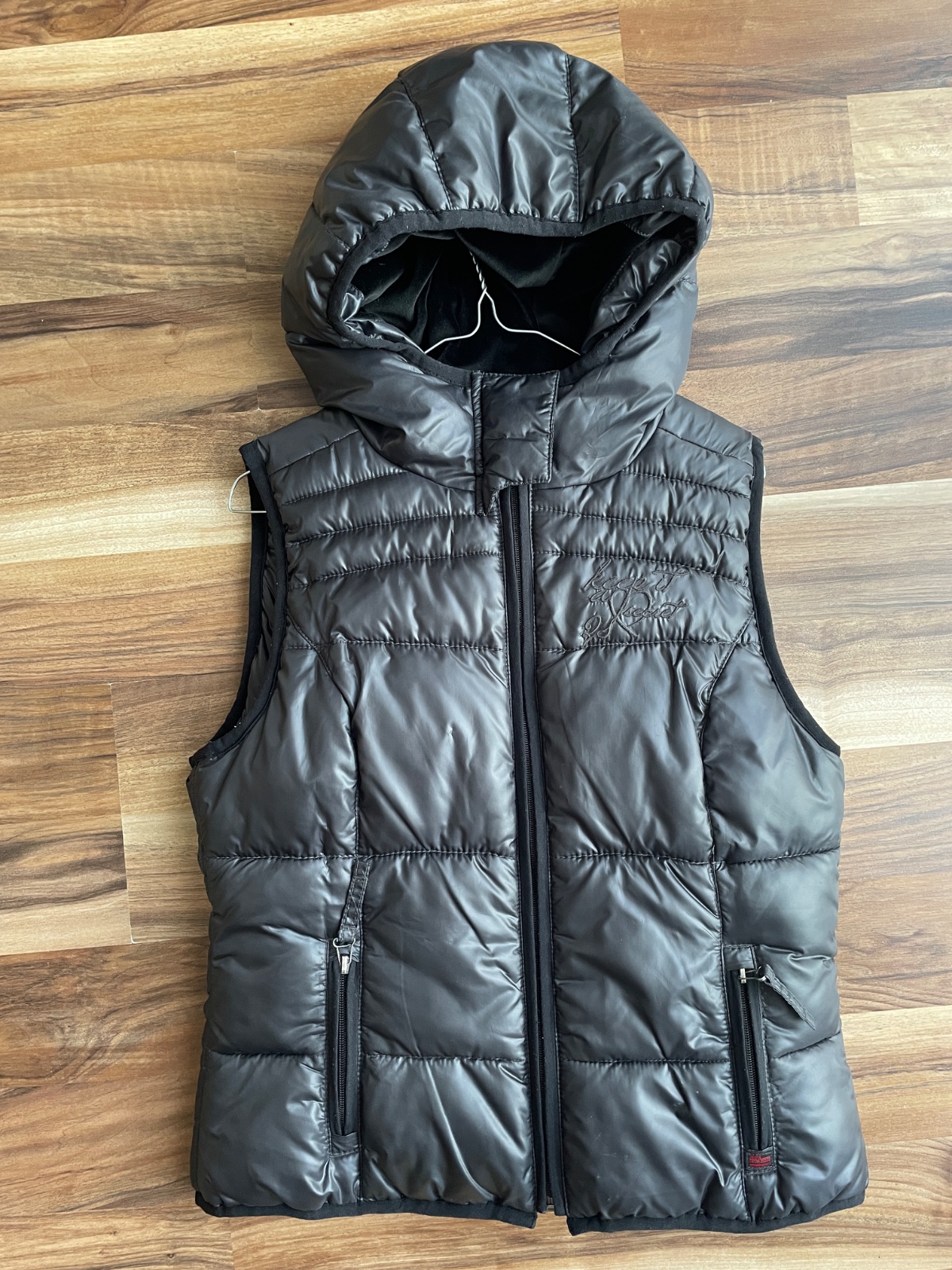 Predám hrubšiu zateplenú vestu s kapucňou antracitovej farby, veľkosť M (zodpovedá 38), výborný stav