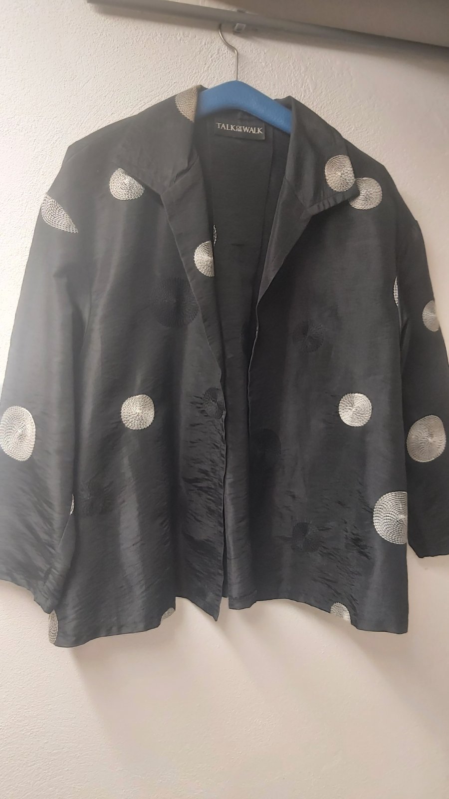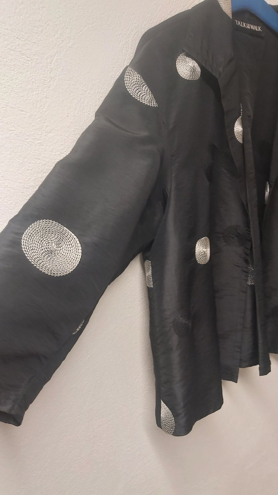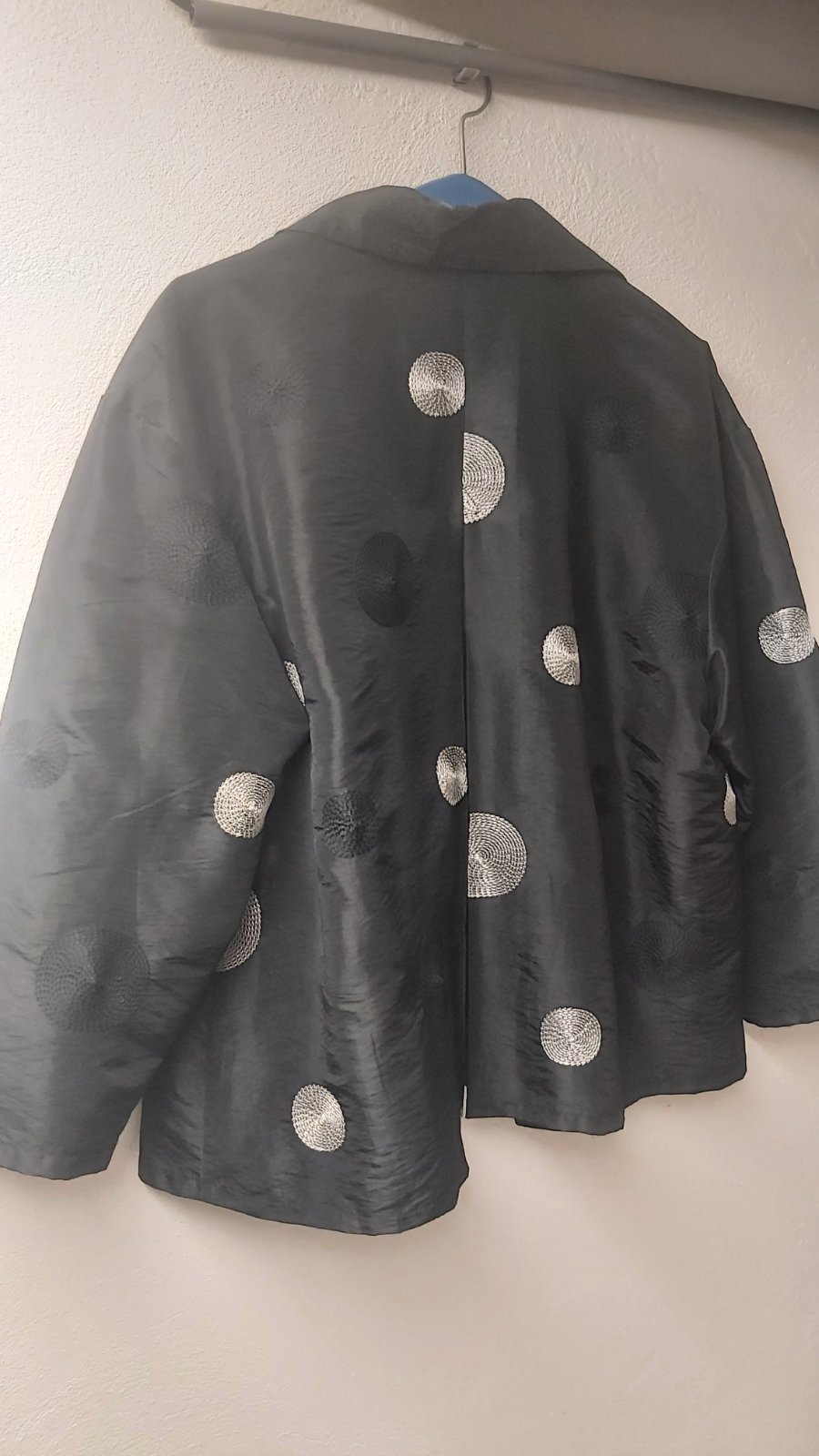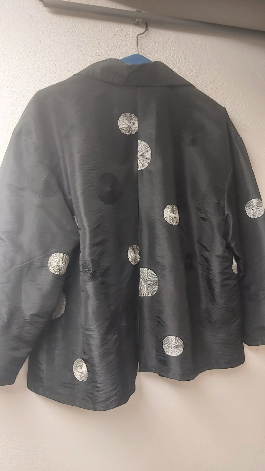 predám krásne nadčasové dámske sako čiernej farby s 3/4 rukávmi, kratšie - tesne nad boky. Vzadu je strih saka s klinom, t.j. krásne sa pri zdvihnutí ruky roztvorí do tvaru A. Materiál satén? (neviem presne definovať) ale má istý lesk, čo som sa snažila zachytiť na fotkách + má strojové výšivky z čiernej aj bielej nite v tvaroch kruhov. Je veľmi decentné a veľmi elegantné pre dámu čo si potrpí na štýlovosť. Kúpené v zahraničí, moja nákupná cena bola veľmi vysoká, kupovala som pred 2-mi rokmi, ale tým že som ho minulý rok ani raz nemala na sebe, predávam. Osobný odber alebo pošlem poštou, ktorú hradí kupujúci.