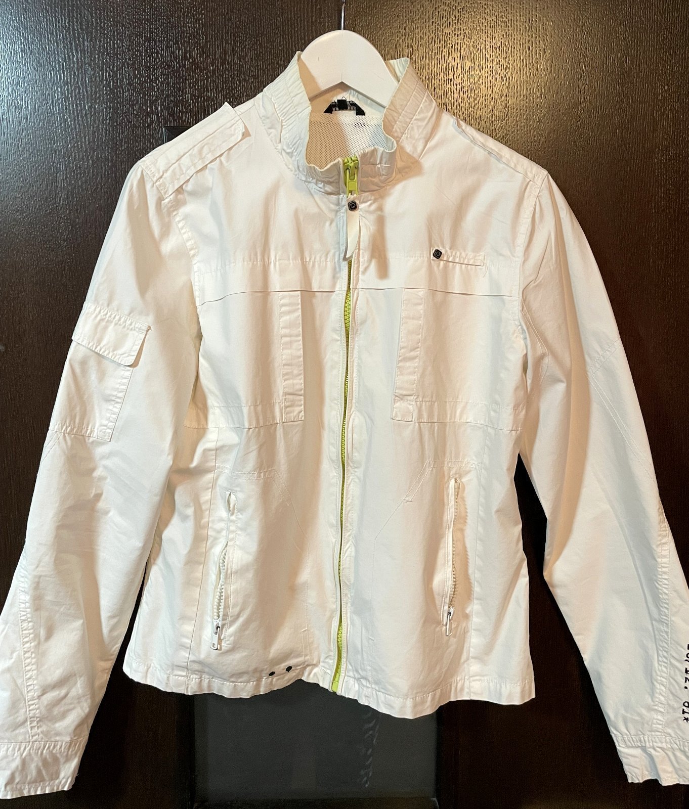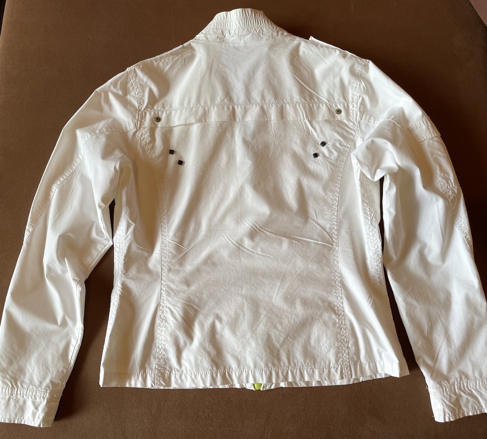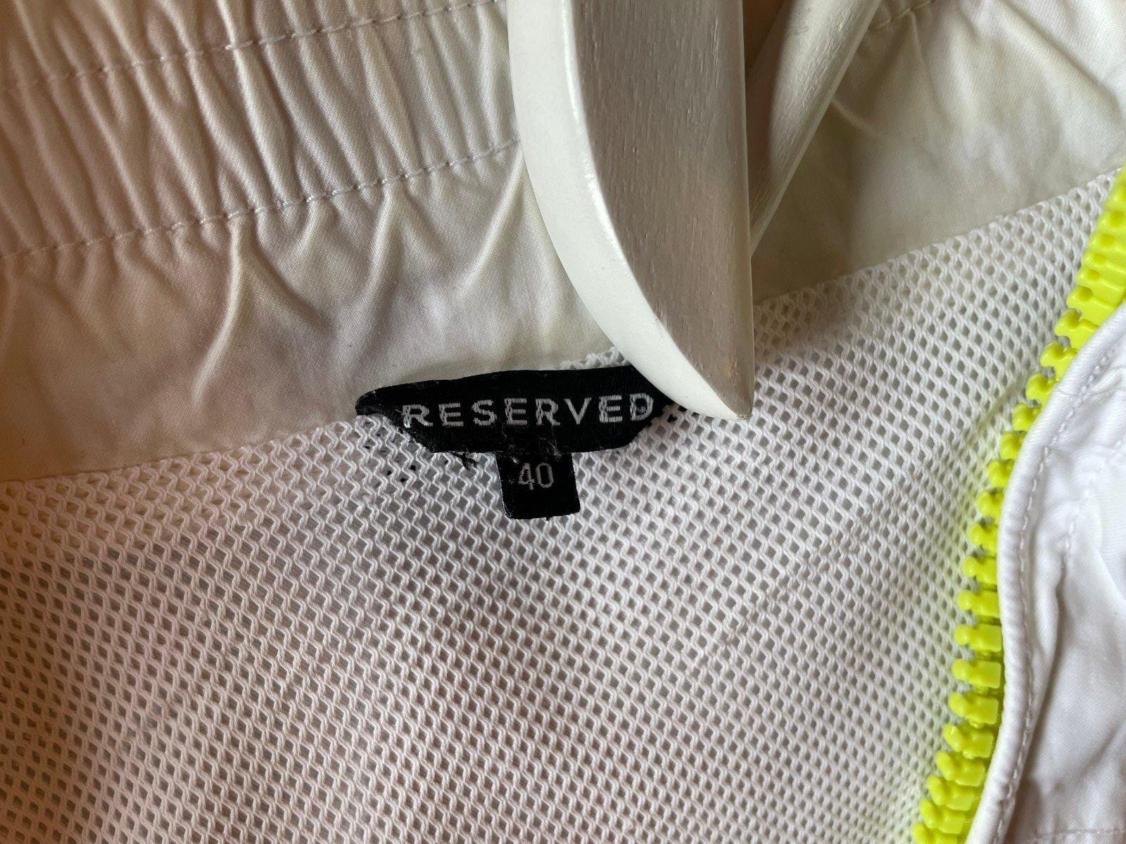 Štýlová prechodná jesenná/jarná bunda bielej farby s pastelovo žltým zipsom, so štýlovými vreckami a ozdobnými cvokmi. Značka RESERVED. Veľokosť 40. Dĺžka 58 cm, šírka v podpazuší 2x51 cm, dĺžka rukáva od podpazušia 44 cm, od ramena 62 cm.