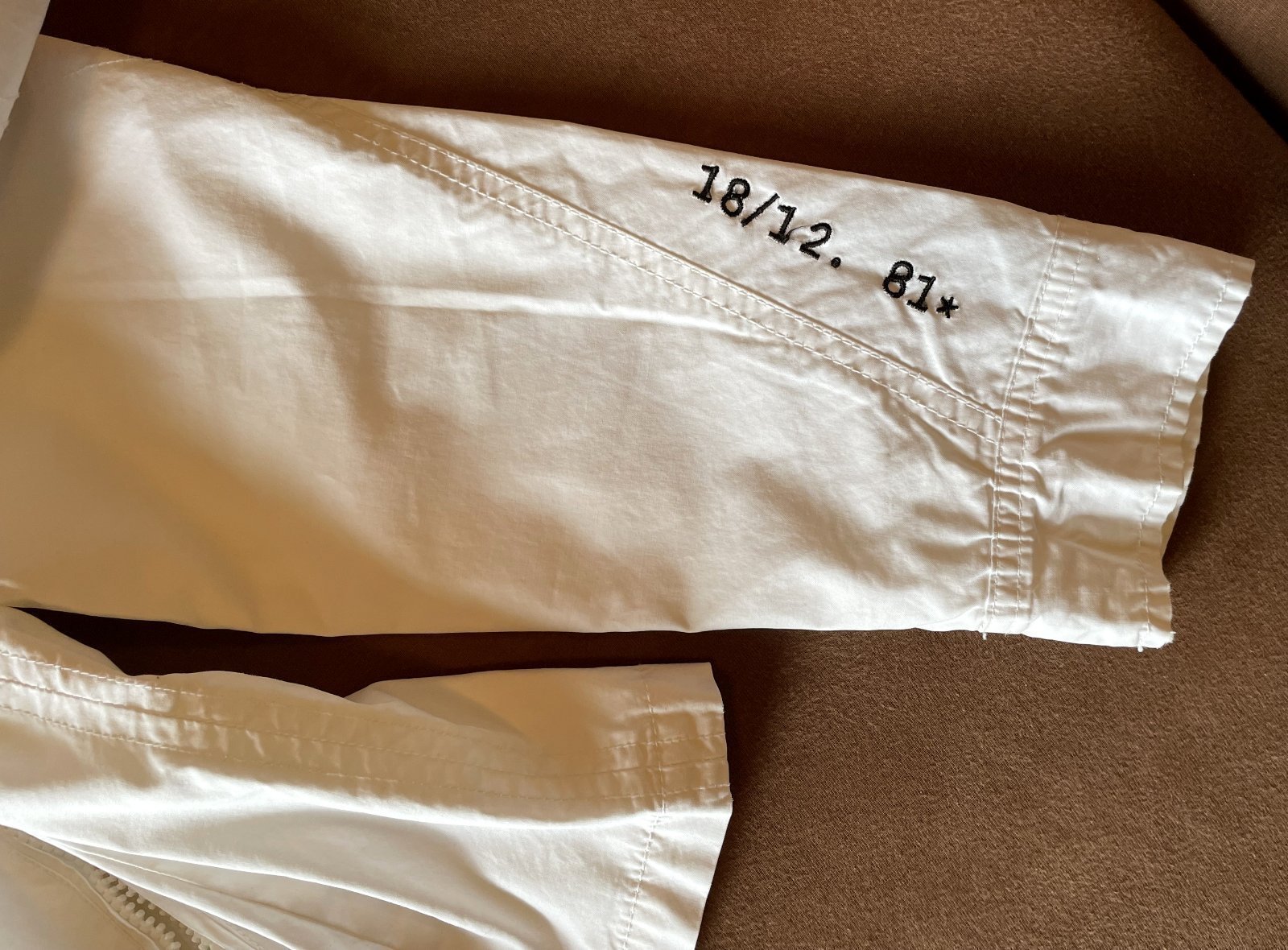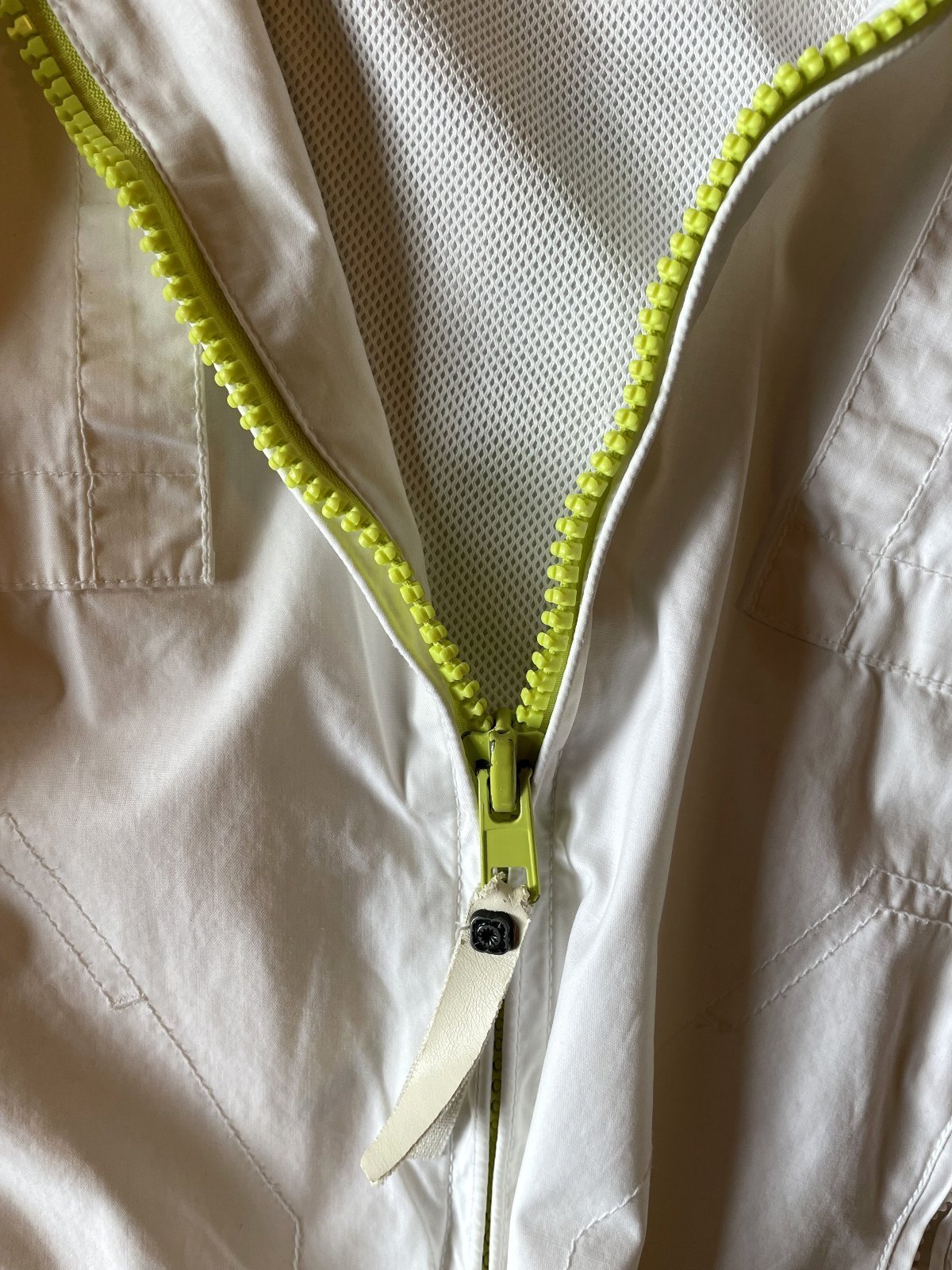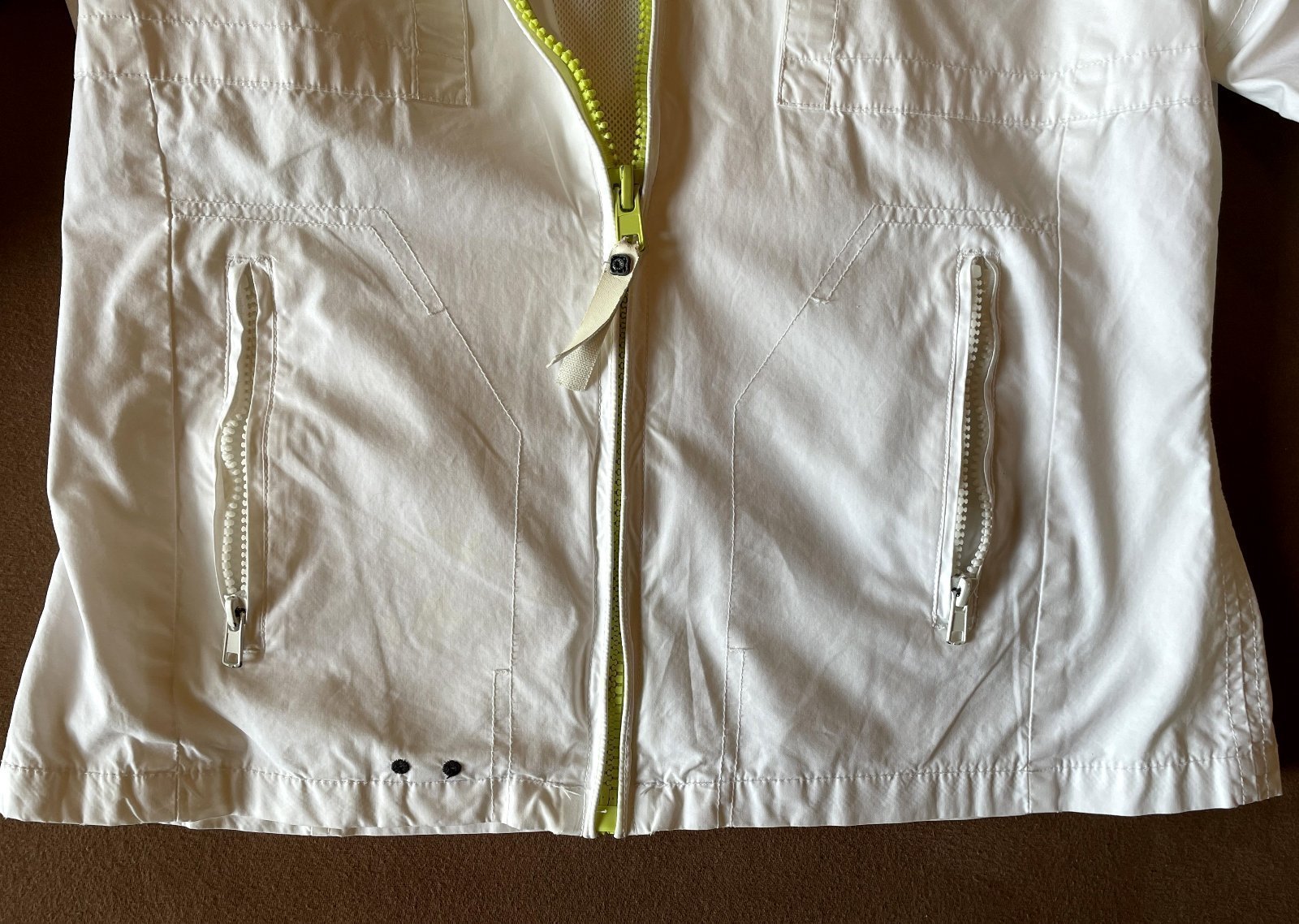 Štýlová prechodná jesenná/jarná bunda bielej farby s pastelovo žltým zipsom, so štýlovými vreckami a ozdobnými cvokmi. Značka RESERVED. Veľokosť 40. Dĺžka 58 cm, šírka v podpazuší 2x51 cm, dĺžka rukáva od podpazušia 44 cm, od ramena 62 cm.