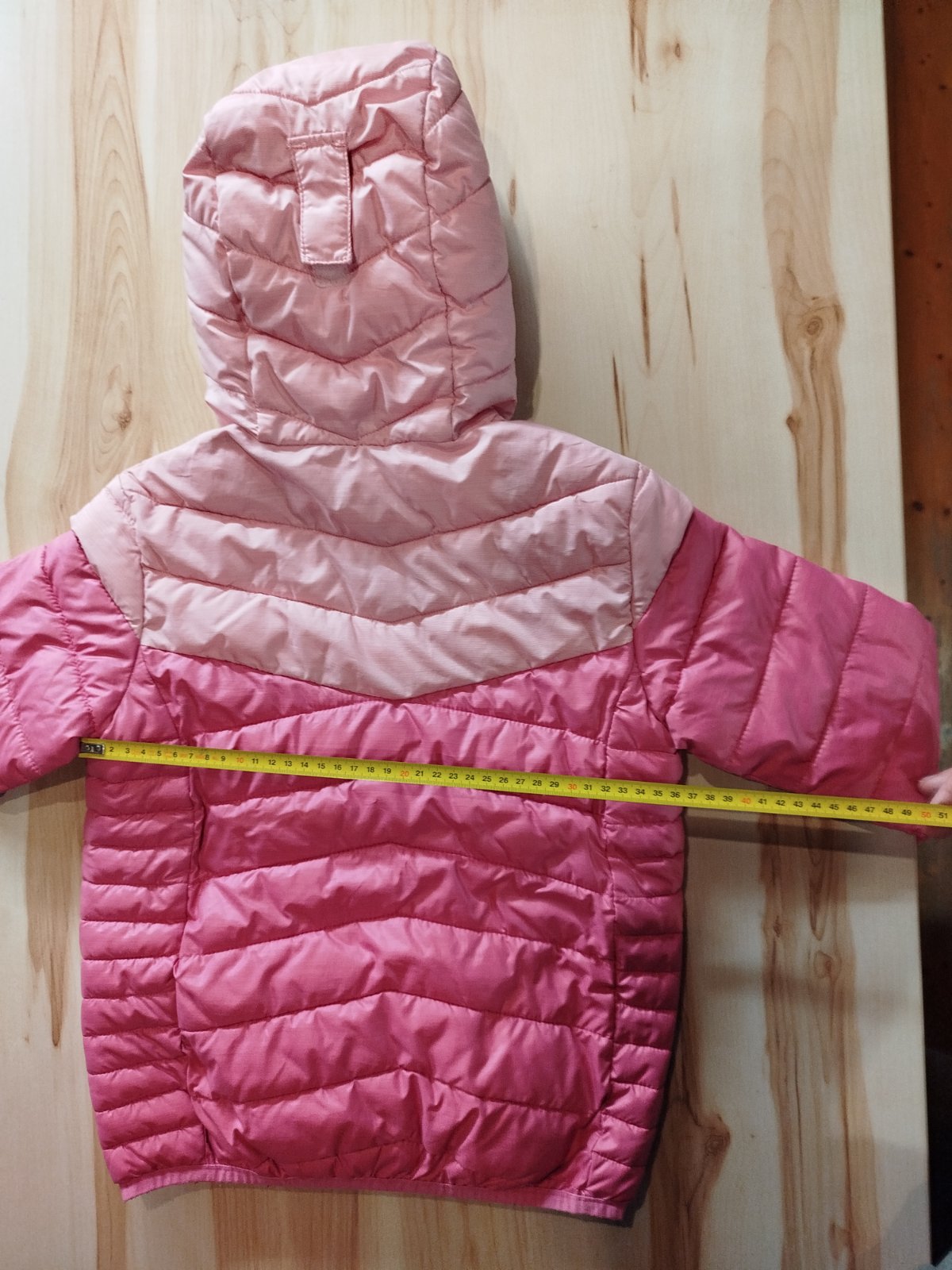 Prechodna bundicka,bez poskodenia.Farba krajsia ako na foto,vyraznejsia,kombi s tyrkys.farbou.Velkost na stitku 134/140 ale nositelna uz od c.122 preto som ju dala uz pid mensiu velkost. Dlžka -51...