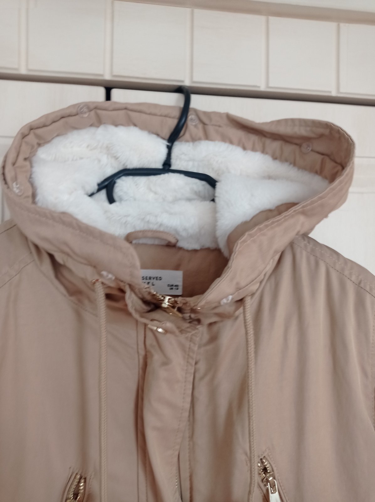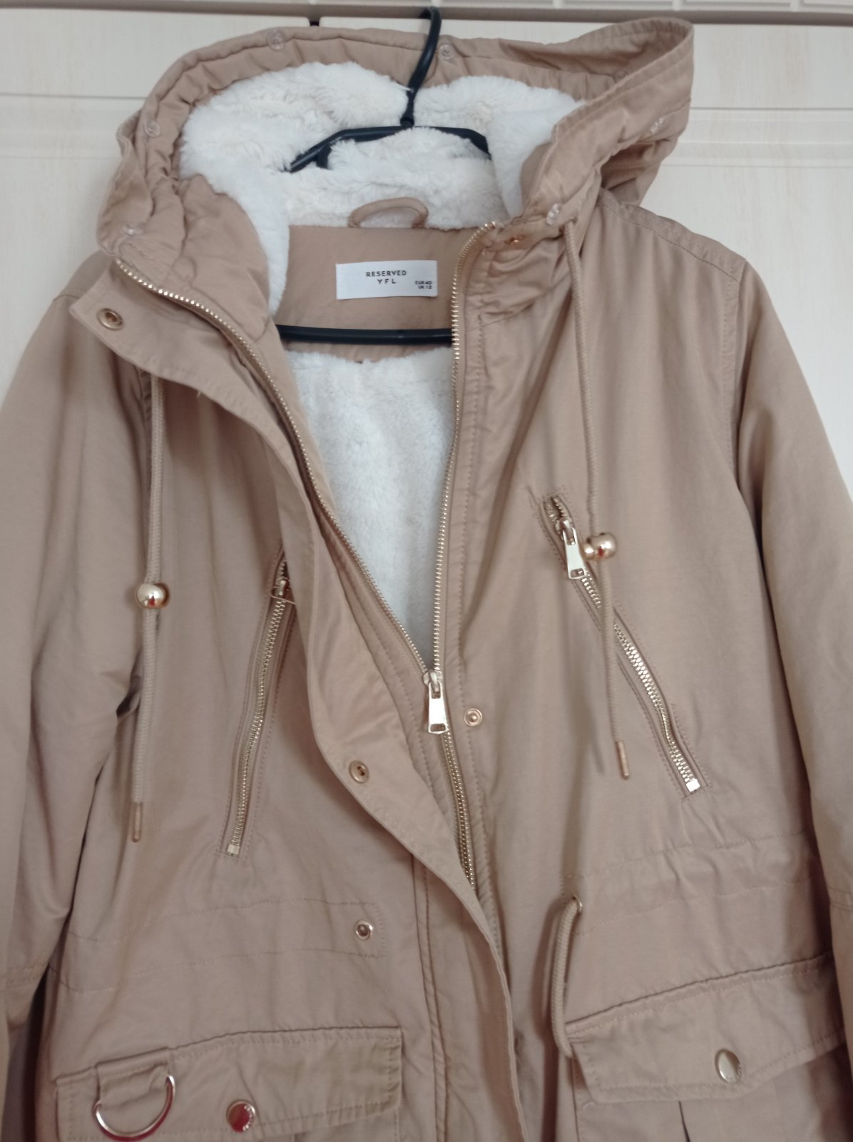 Nepoškodena ako nová. Je teplá,zvnútra teplý flis aj na kapucni,čo je v zime veľke plus. V páse na šnúrku.,aj dole je šnúrka. Kapucňa sa dá dať dole.