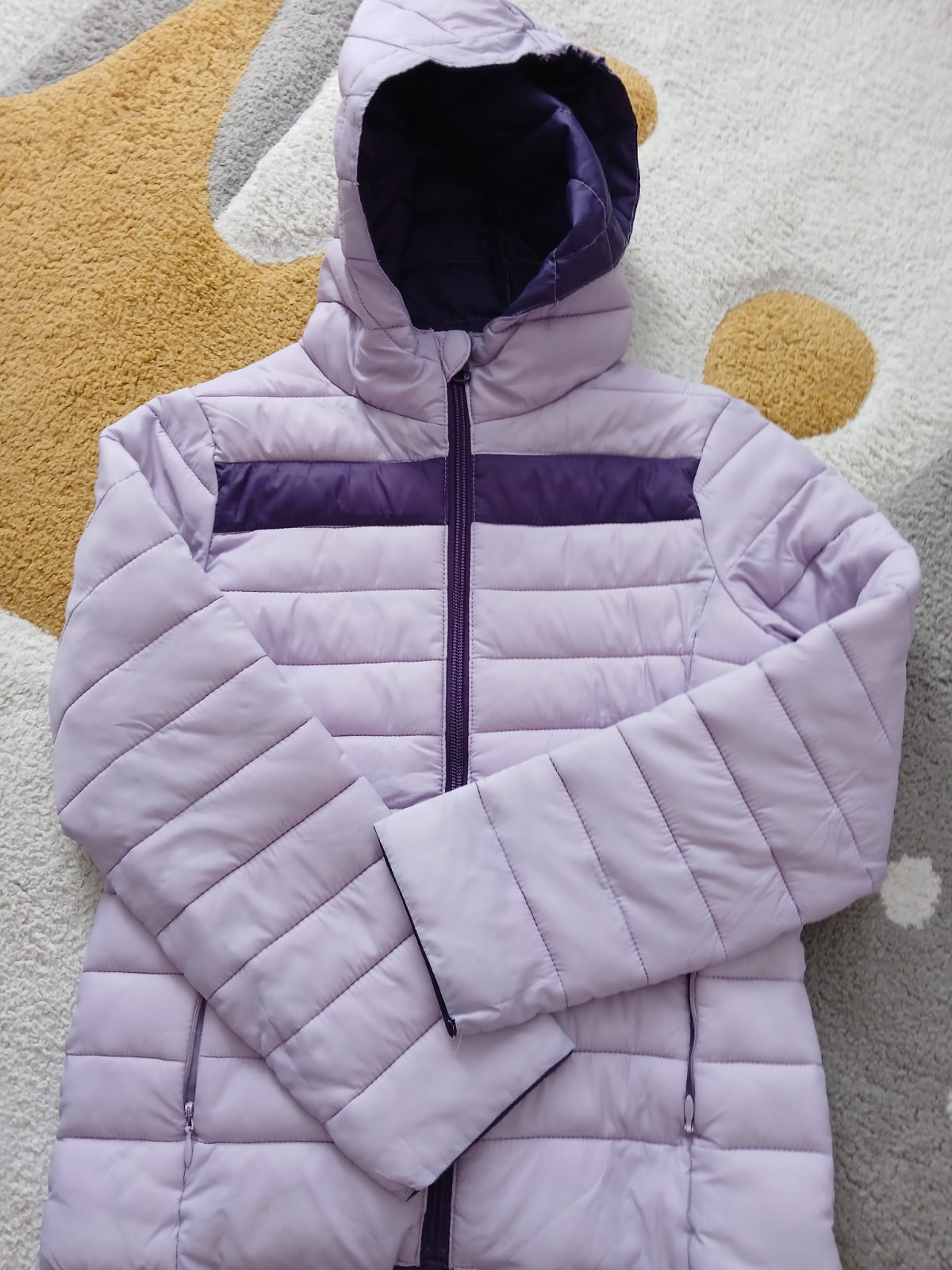 Ľahká prešívaná bundička na prechod. Má kapucňu a kontrastné svetlé lemovanie s trblietavým odrazom. Bundičká má 2 funkčné vrecká. Je vo veľmi dobrom stave. Rozmery - celková dĺžka bez kapucne: 44 ...