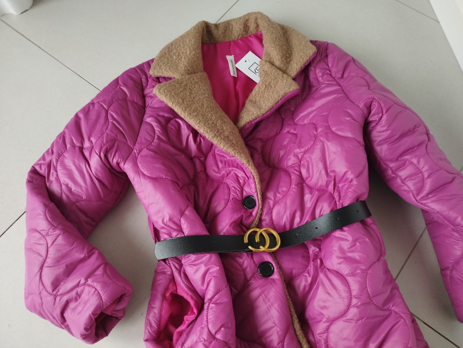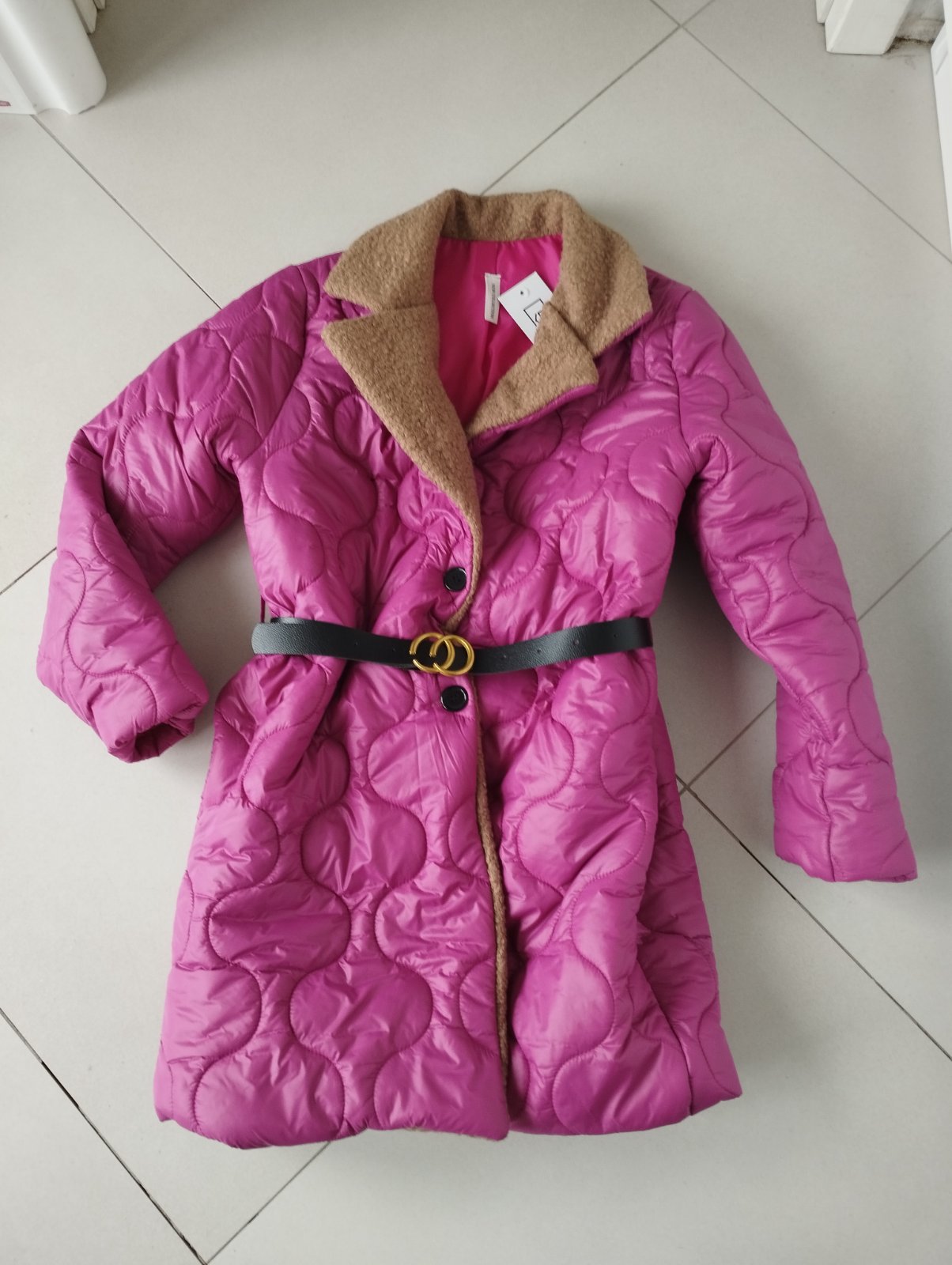 Veľmi pekná farba, dá sa nosiť aj bez opaska, veľkosť S-M