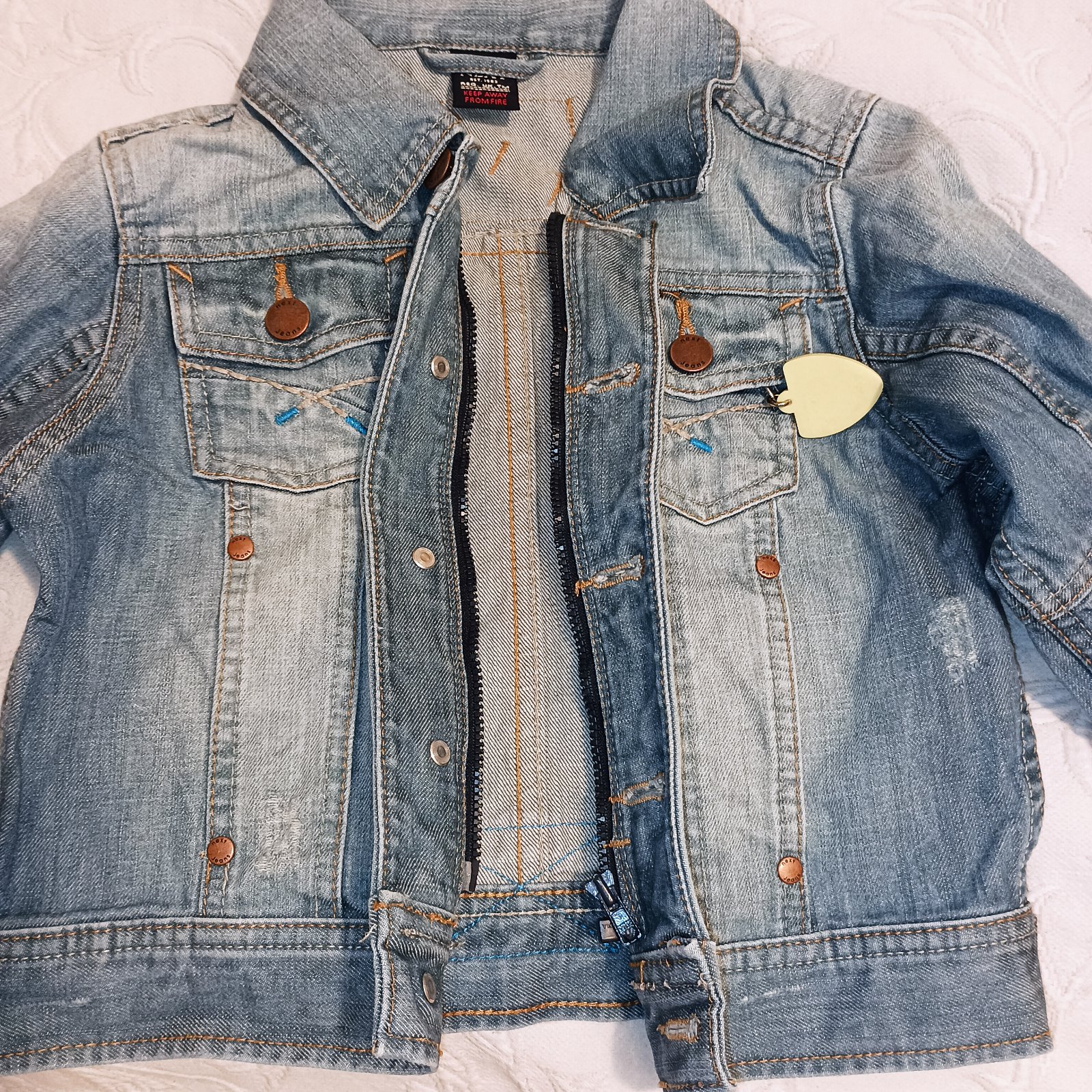 Perfektná riflovka, zapínanie na zips aj na gombíky, na vrecku odznak (dá sa odopnúť), žiadne poškodenia.