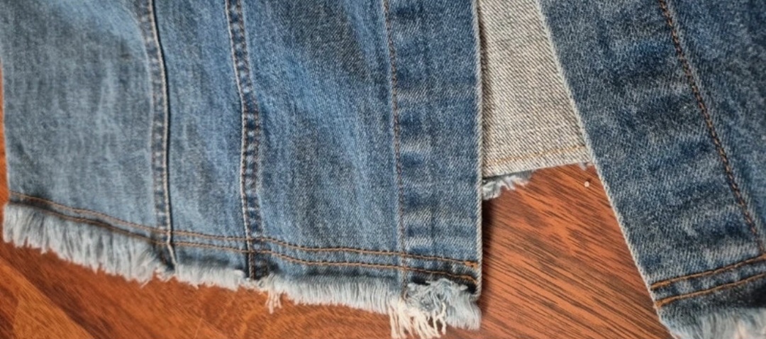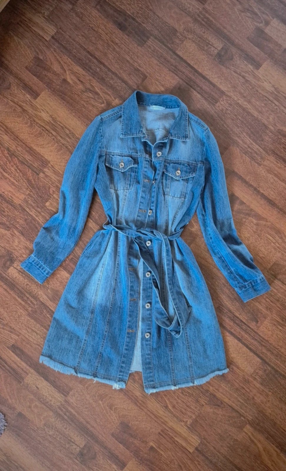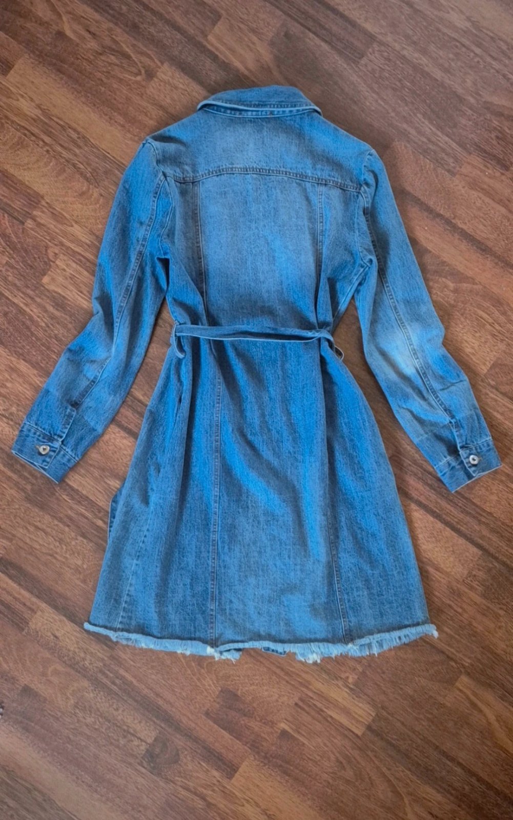Štýlový riflový plášť, tenší, prijemný mäkučký nateriál, vps páse opasok, dolu naschvál rozstrapkaný, je vyskúšaný, top stav, pis S,no sedí na M, dÍžka 97, prsia 49x2 cm.