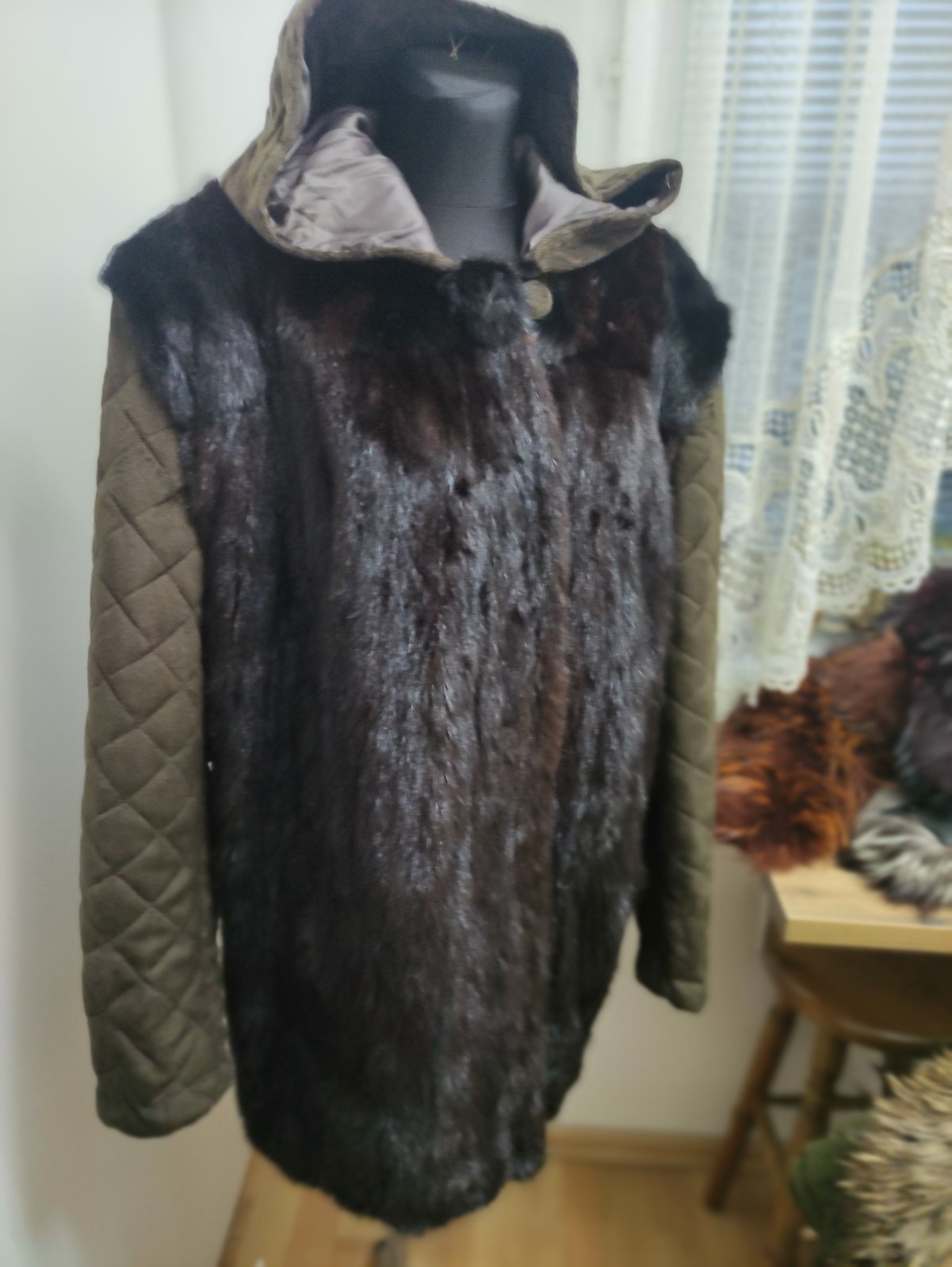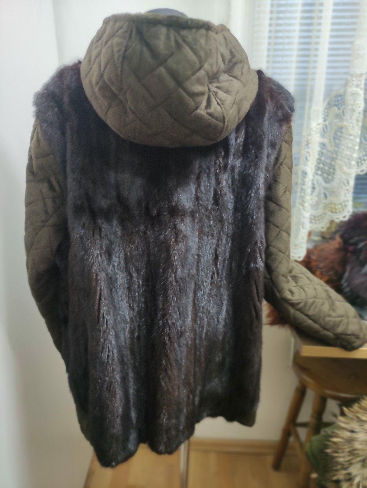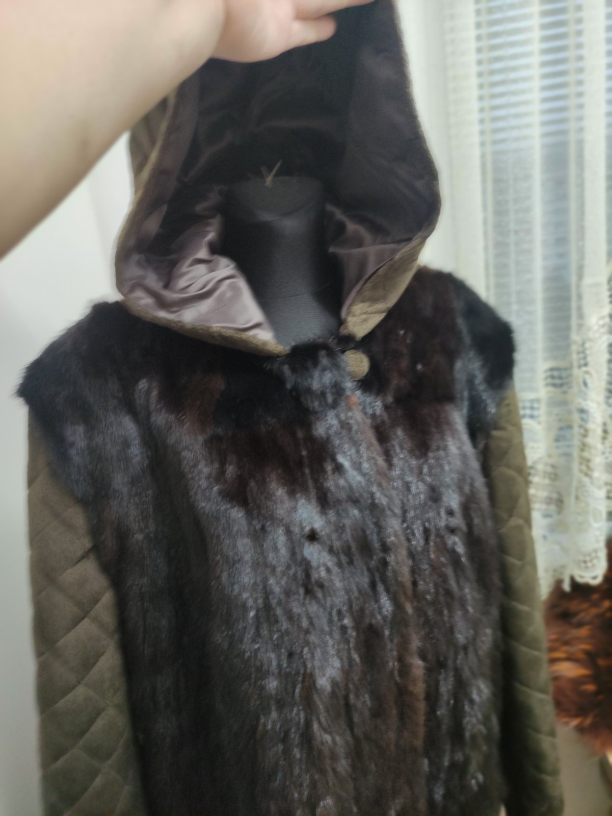 Ako novy...bol šitý na mieru...( len práca stala 200€)Kvalitná norka,hnedá farba..vesticka pravá kožušinka norka,rukávy,kapucňa materiál..veľkosť 50-56, šírka 140 -150 CM( je tam dva rady na zakapcovanie,dĺžka 77,rukav 66cm..vrelo odporúčam...