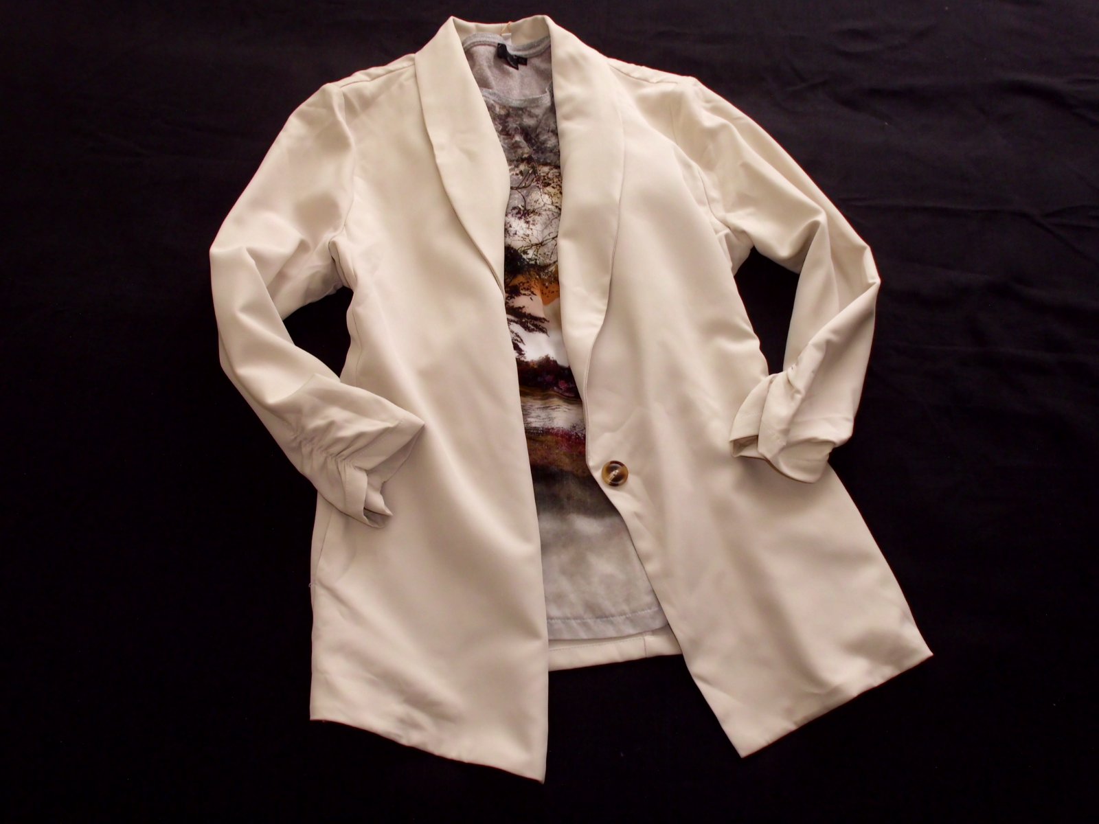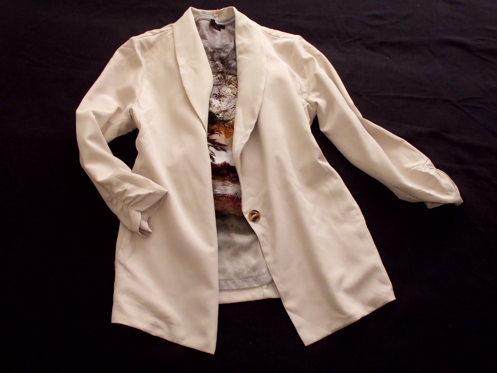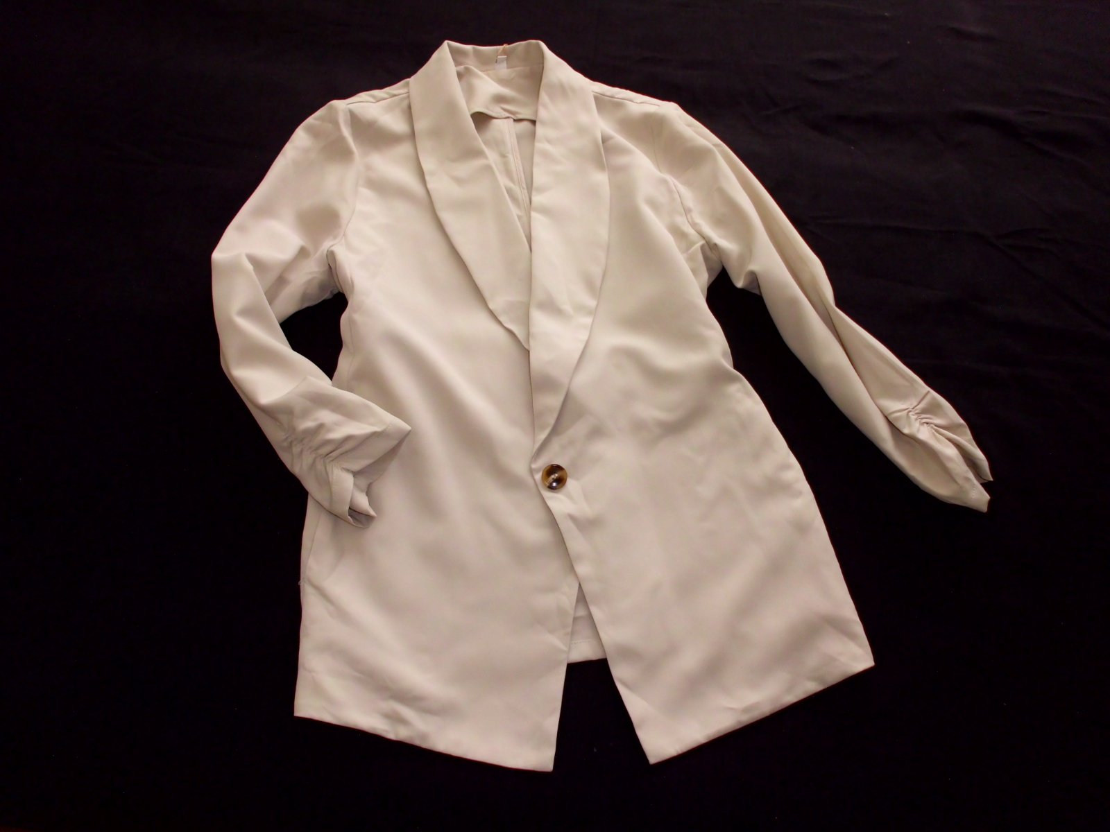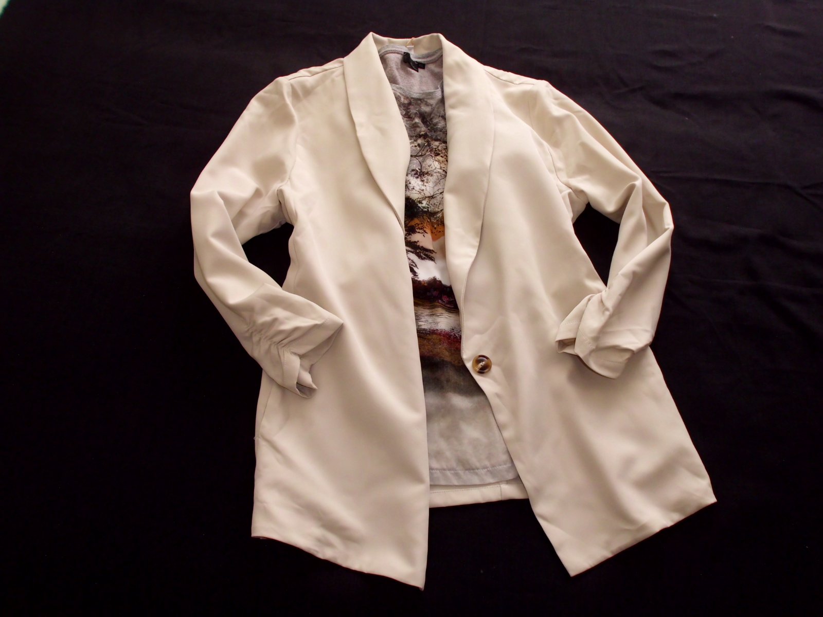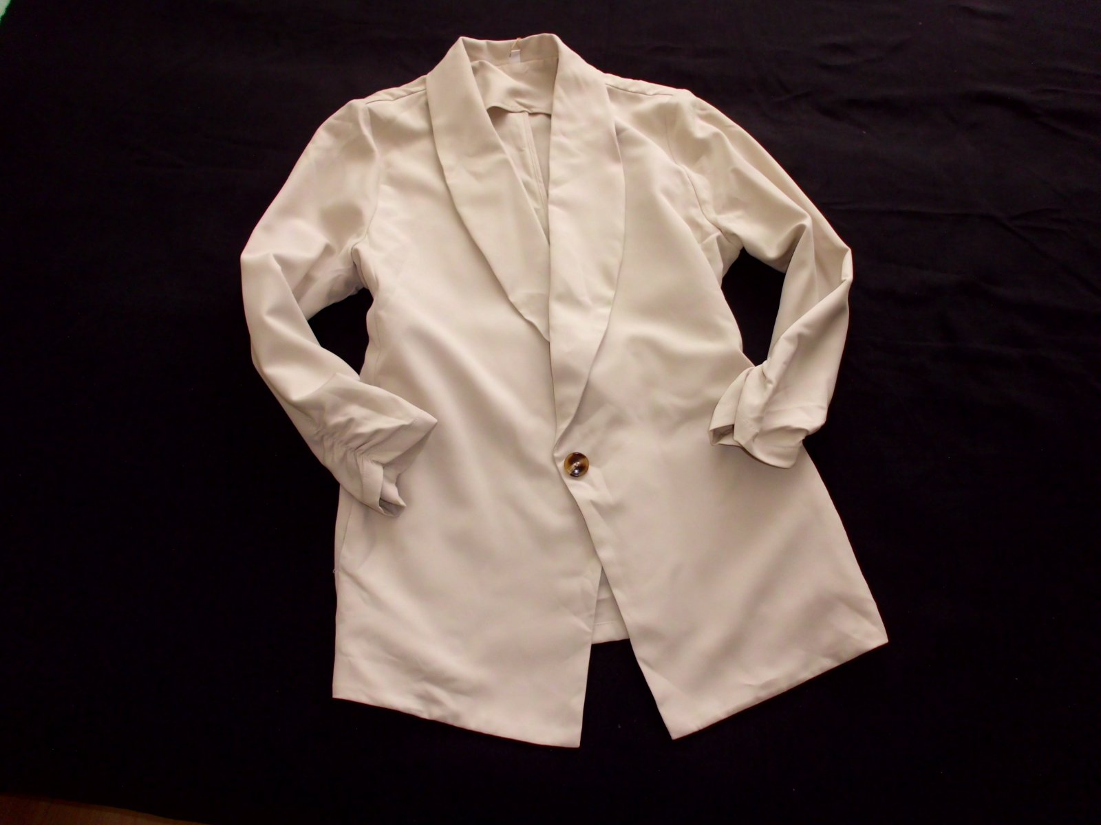 Predám dámske sako vel. M-L , šírka 53 cm, dĺžka 69 cm ,rukáv 57 cm riasenie ,2 vrecká zboku , rovnejší oversize strih, príjemná látka celé bez podšívky ale kvalitný materiál , béžová bledá farba ,1 x oblečené, 100% stav