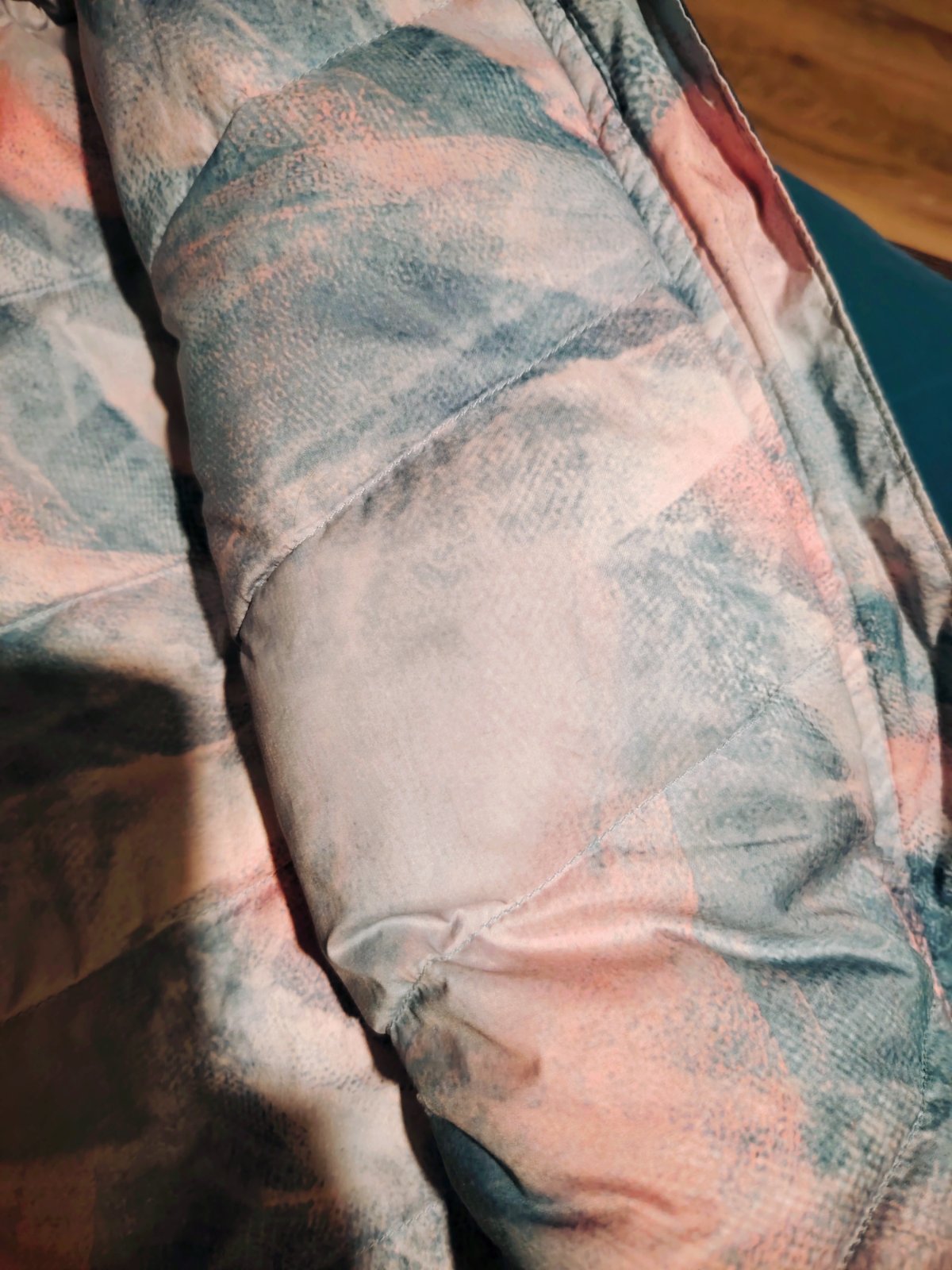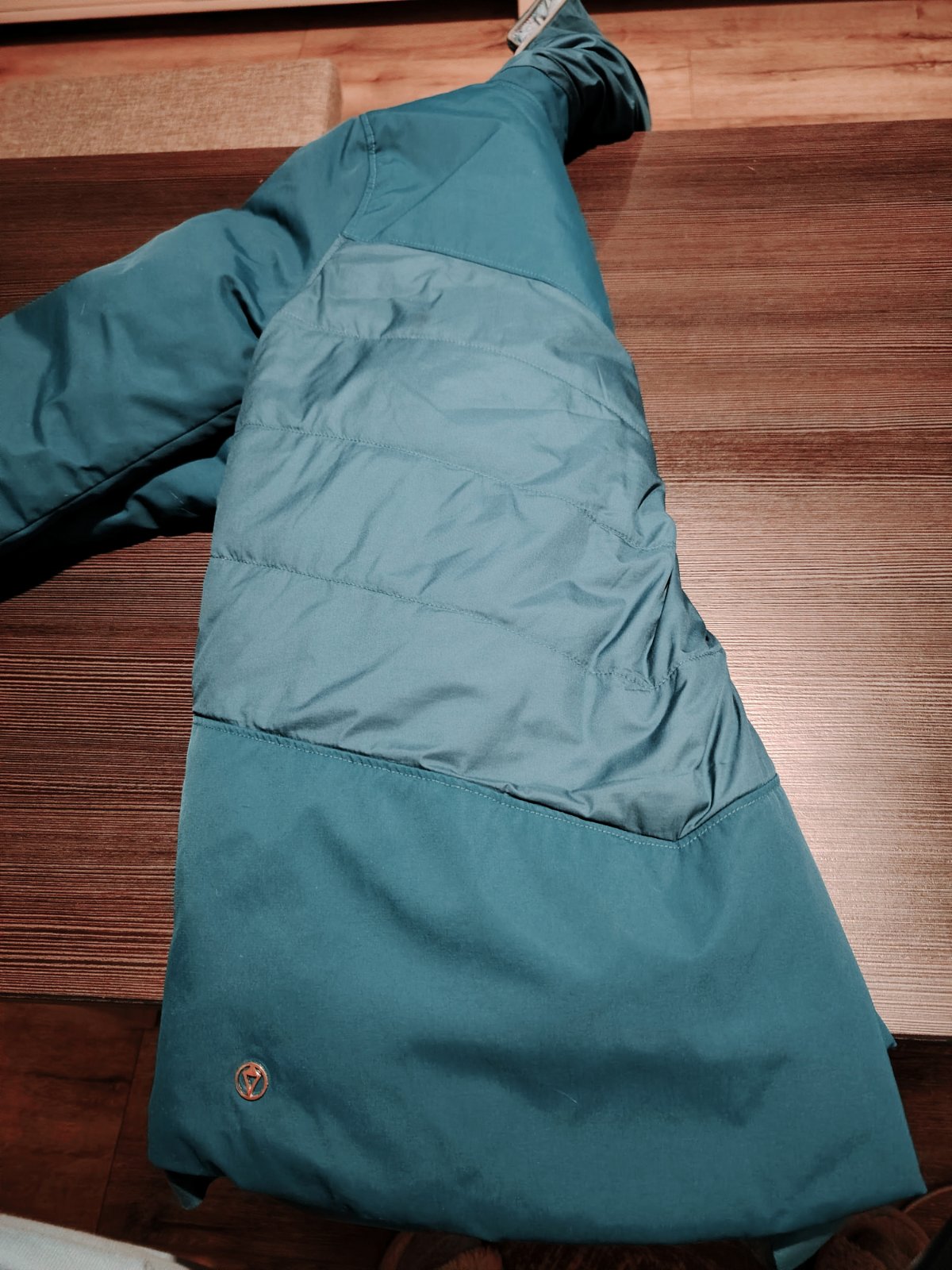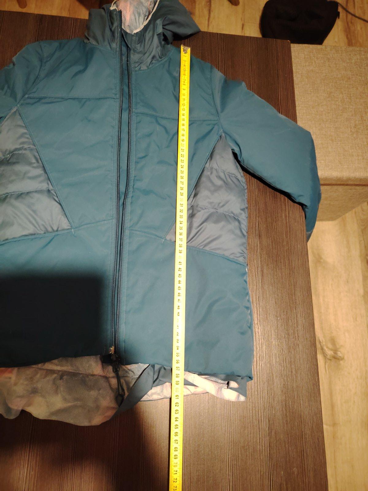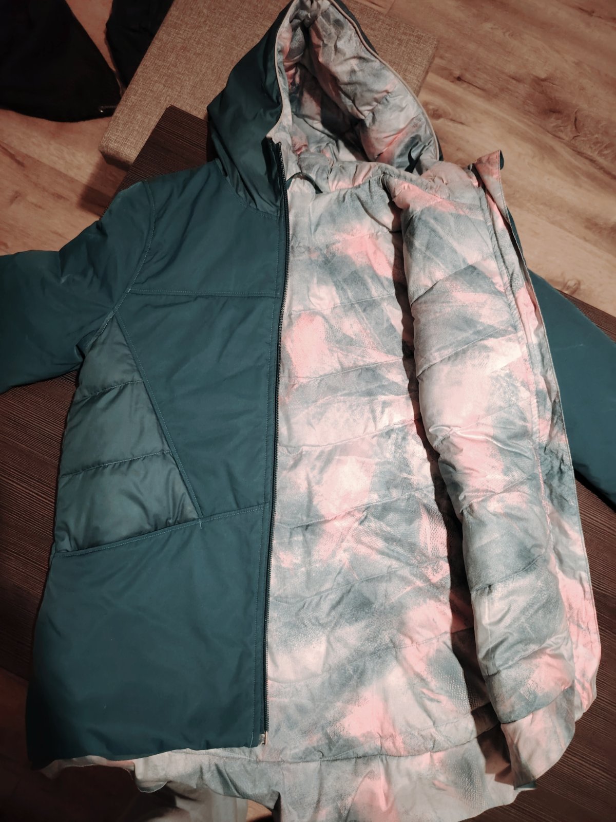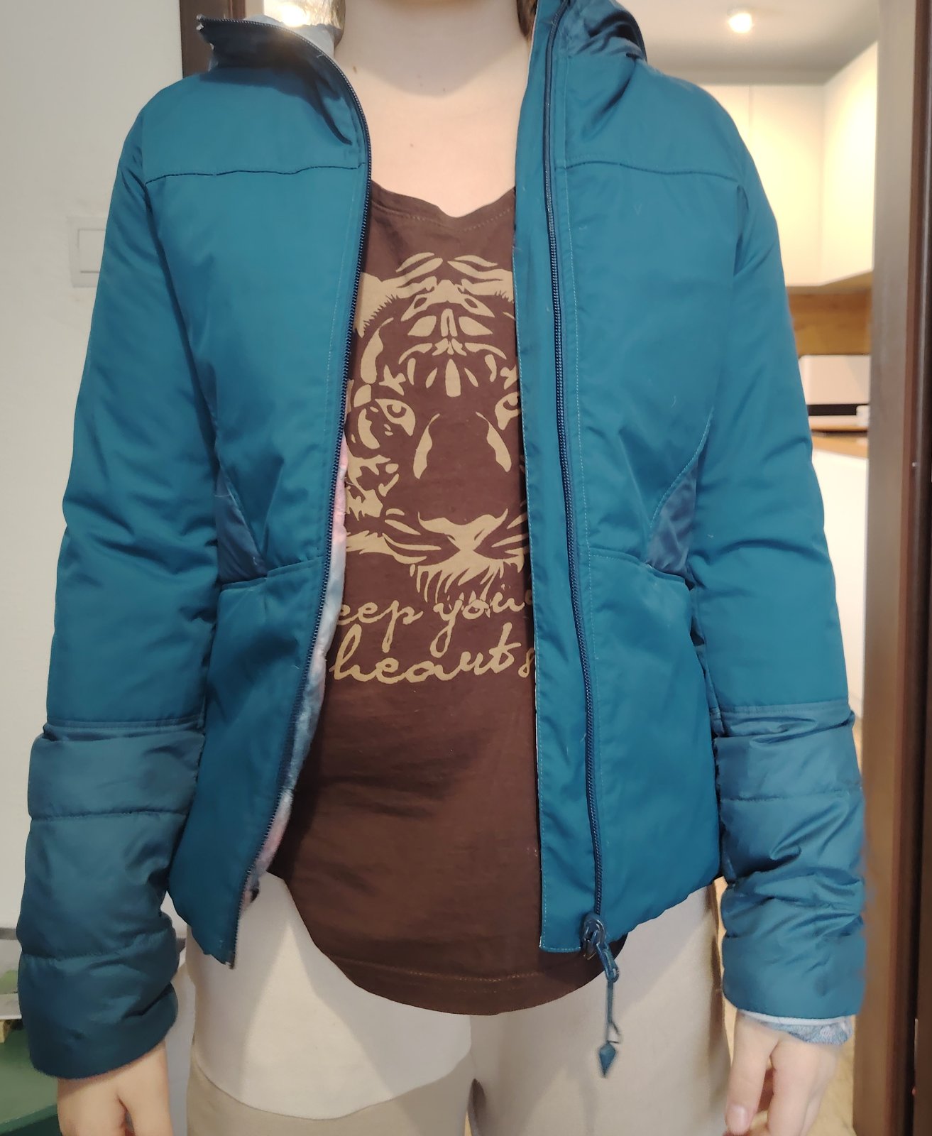 Ľahká bunda s ozdobným lemom na spodu, značku neviem, bola kupovaná v Kanade a podla znaku som vyhľadala značku Mercari. Podľa dcéry odhadujem veľkosť 152 aby bola voľnejšia, na fotke už nosí dcéra velkost 158.farby sú sýte z dvoch druhov látok. Tmavšia je pevnejšia a bledsia modrá s ružovým vnútrom je jemná. Vhodná na chladnejšiu jar a jeseň. Cena už s poštou 3.50