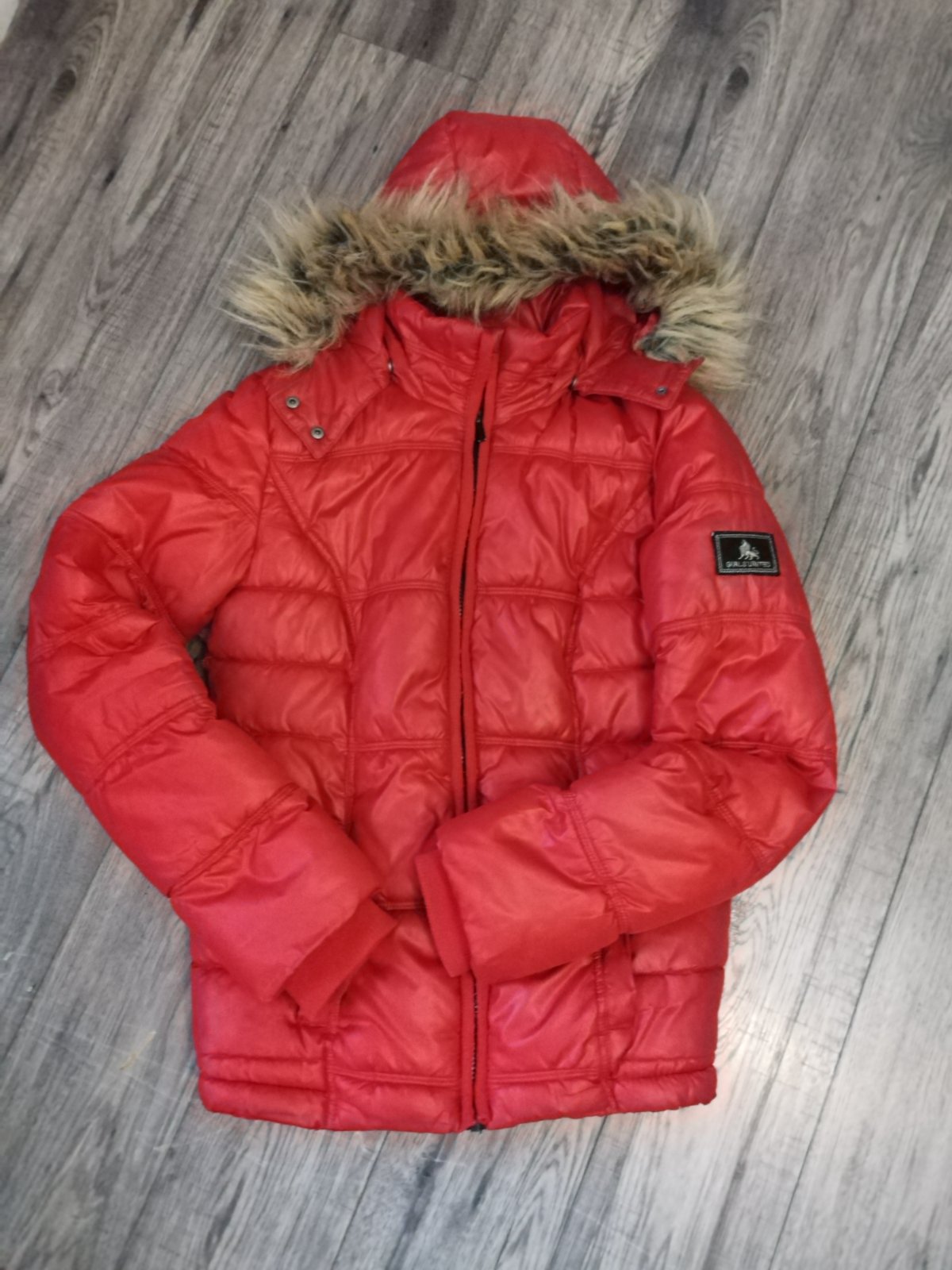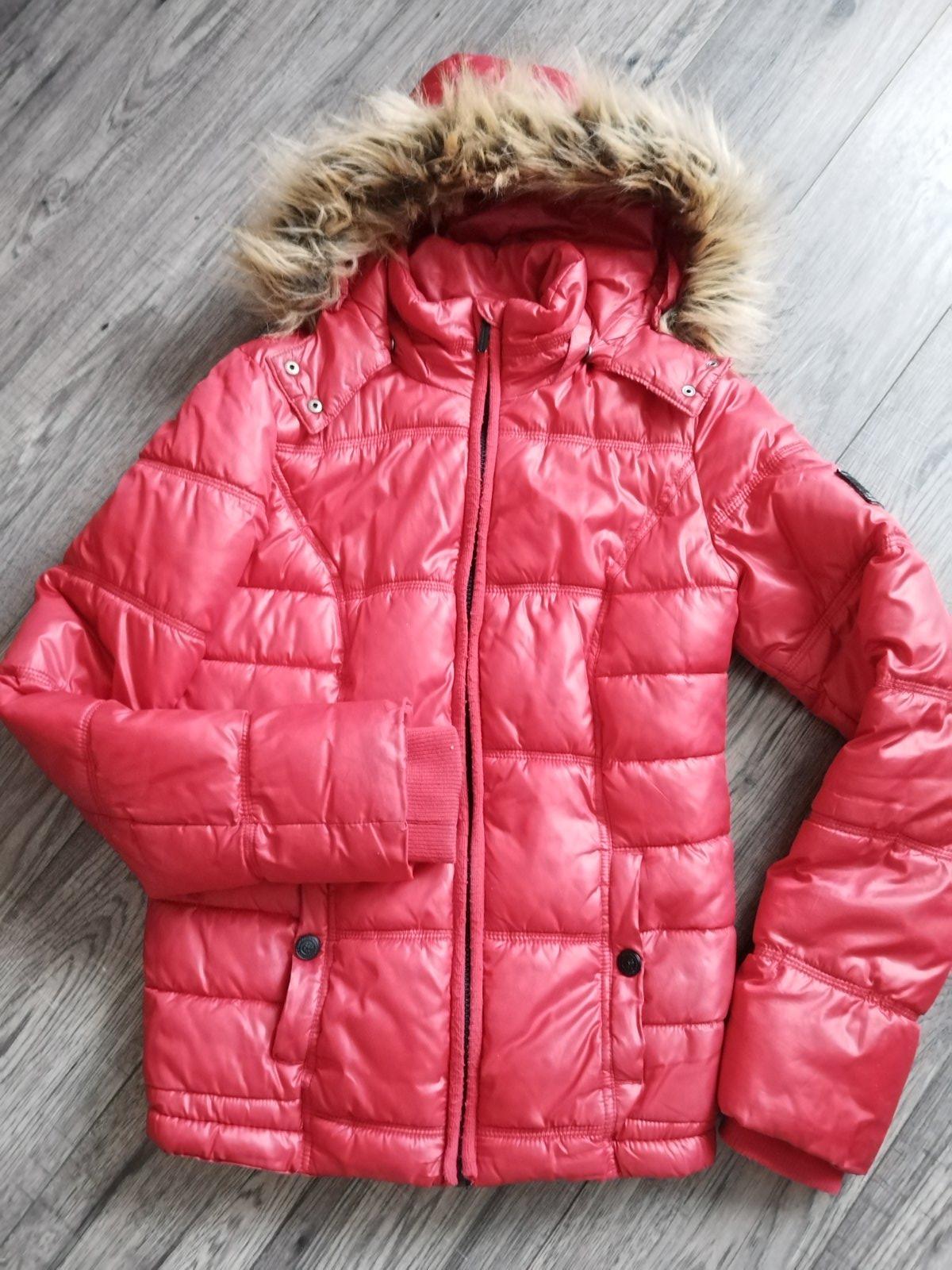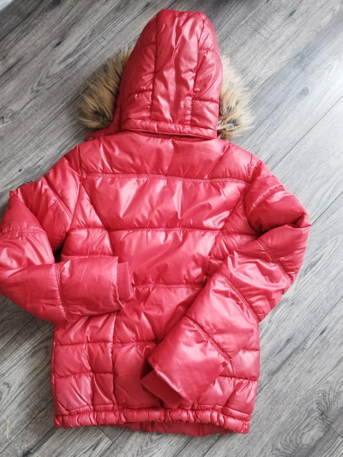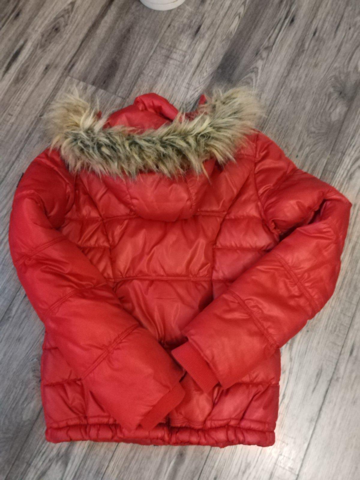Zimná prešívaná bunda zn. Crashone, výrazne červenej farby, veľkosť 170/176,, kapucňa s kožušinou sa dá odopnúť, vrecká na cvoky, výborný stav bez poškodenia.