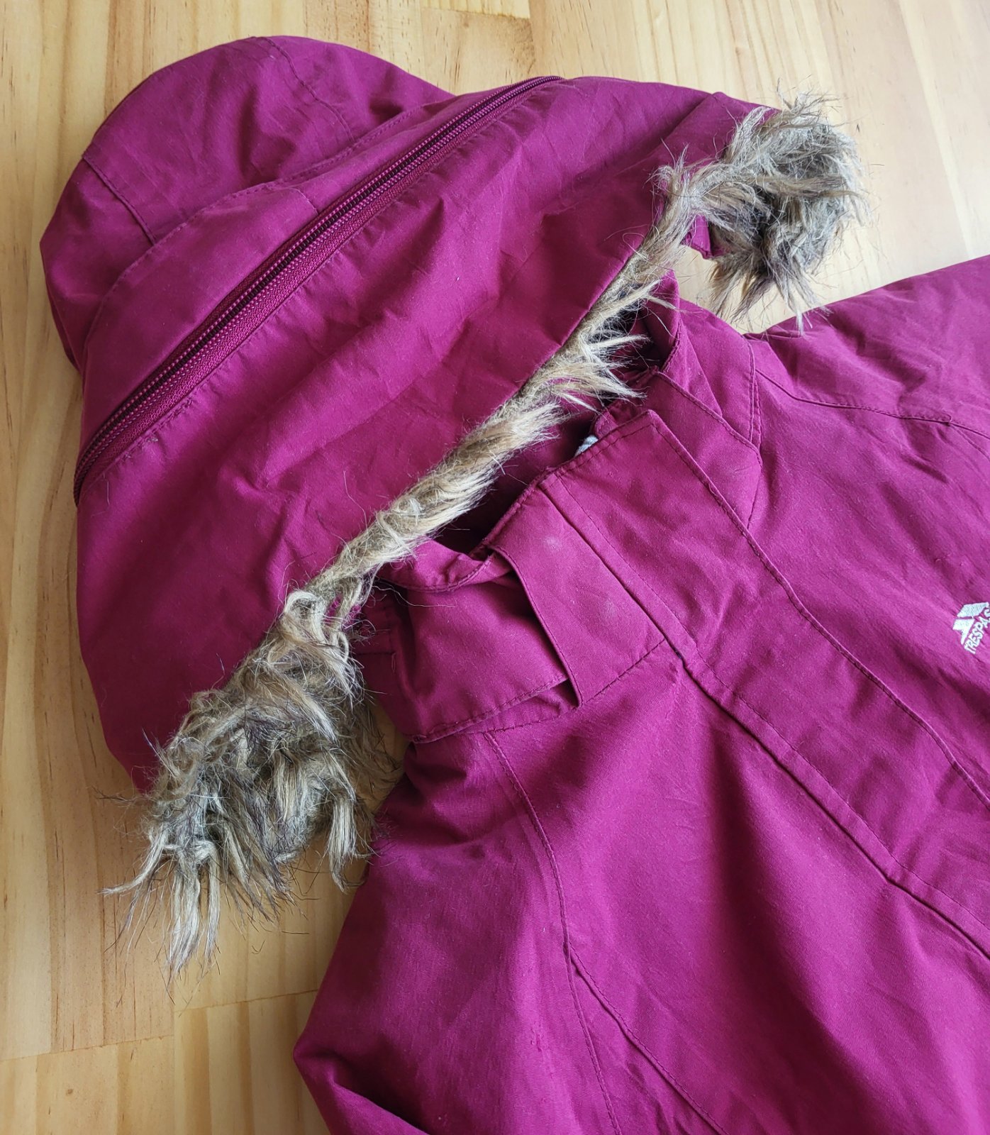 dobrý stav, vzhľadovo pekná, bez vyblednutia, má však predratia na koncoch rukávov, na spodku bundy, hore na kapucni, funkčná, vodný stĺpec 5000mm, vetruvzdorná, lepené švy, prepracovaná, predĺžená, kapucňa aj kožušinka na kapucni odnímateľná, bočné vačky, pošlem ako balík