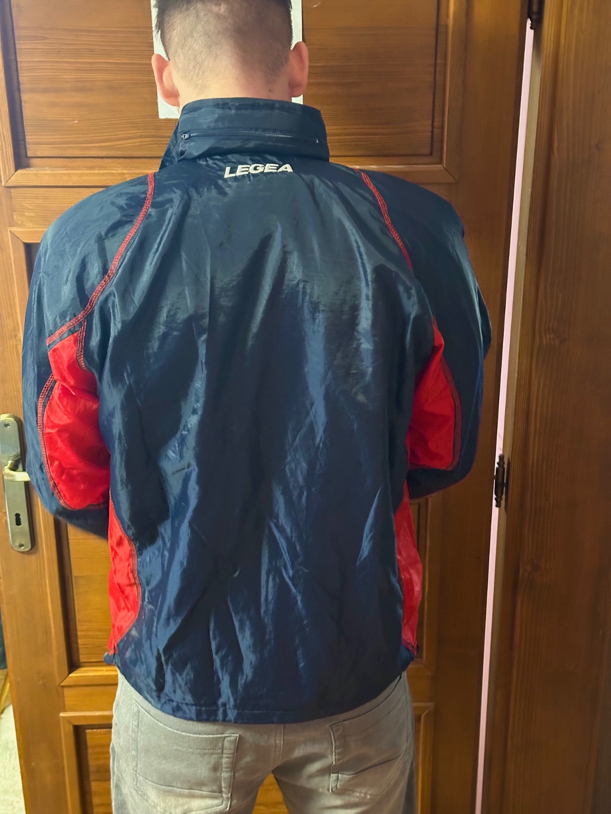 Šuštiaková bunda značky Legea vo veľkosti S, no vďaka svojmu strihu sadne pohodlne aj na postavu veľkosti M. Je ideálna na šport či prechádzky v nepriaznivom počasí – materiál je nepremokavý a ľahko sa udržiava. Z vnútornej strany je podšitá červenou sieťovinou pre lepšiu priedušnosť. Na chrbte v oblasti krku sa nachádza vrecko so schovanou kapucňou, ktorú si v prípade potreby jednoducho vyberiete. Bunda má funkčný zips, elastické manžety a decentné vyšité logo Legea vpredu aj vzadu. Stav je veľmi dobrý, bez poškodení, nosená minimálne.