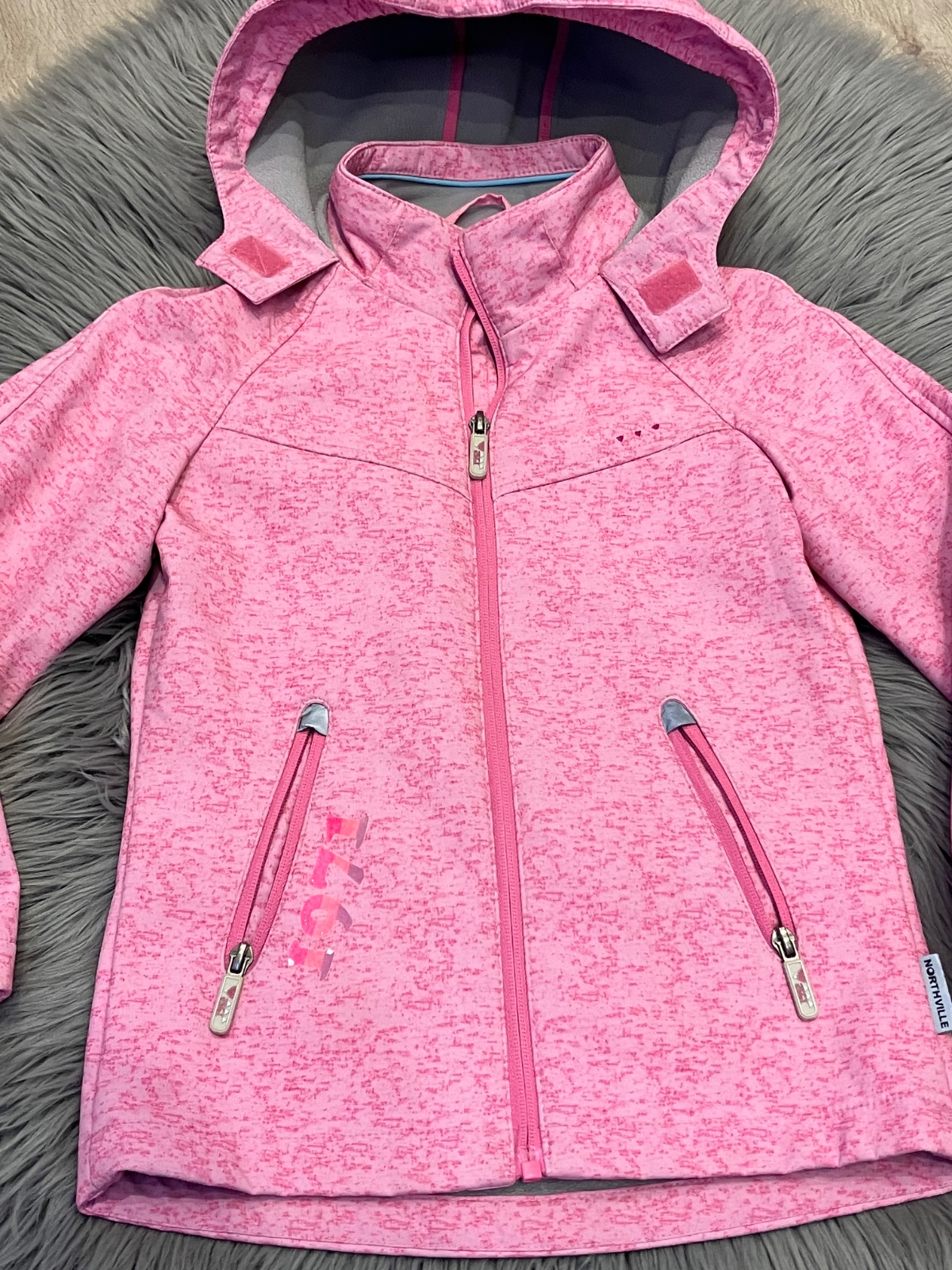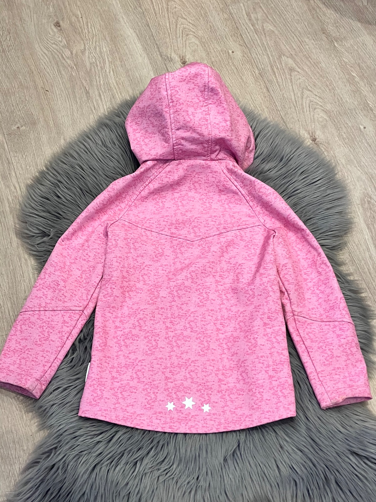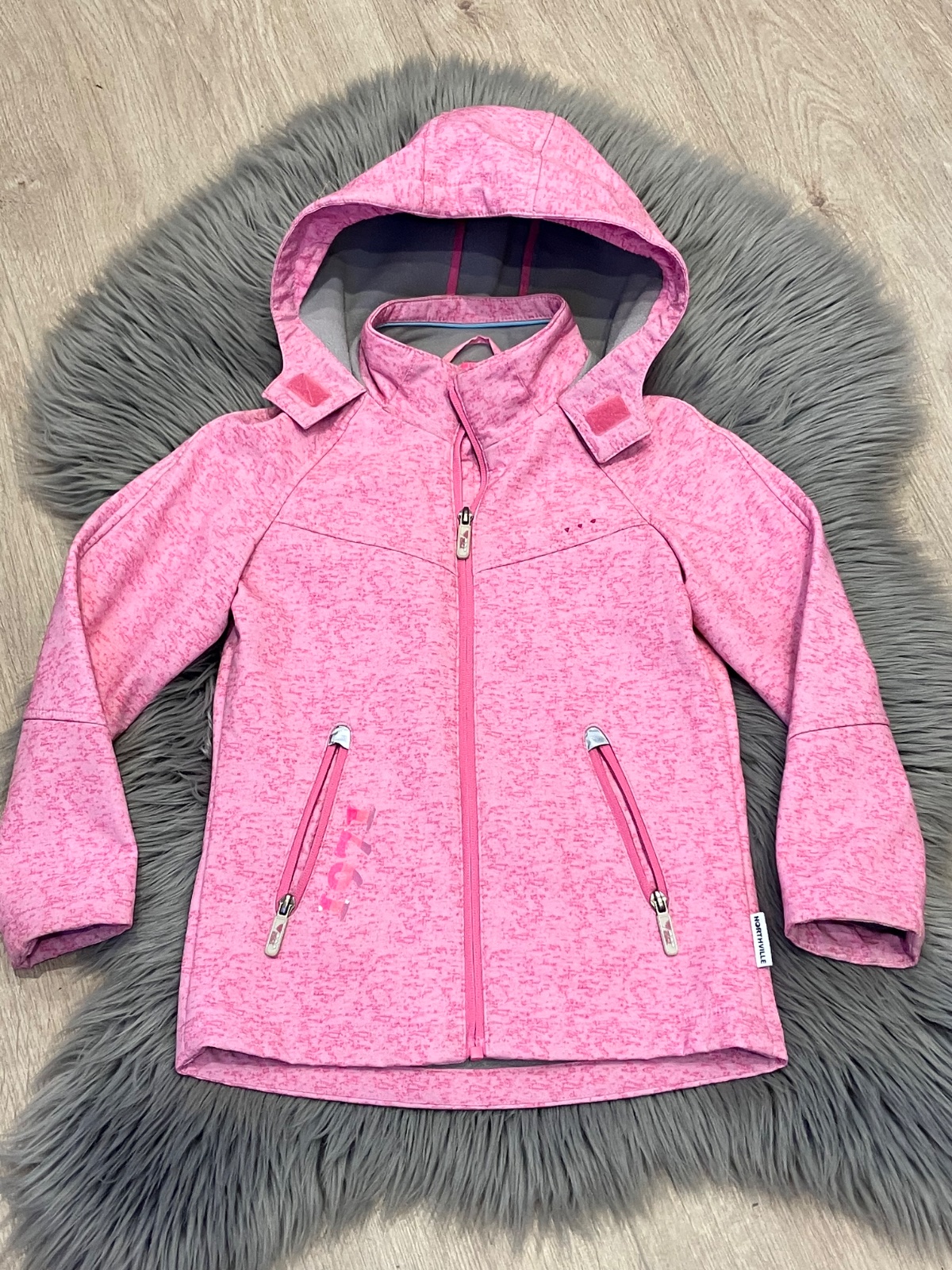 Dievčenská prechodná vetrovka s kapucňou, kapucňa nie je odnímateľná, zapínanie na zips, dve bočné vrecká, vo vnútri jemný flís. Materiál 92%polyester 8%elastan.