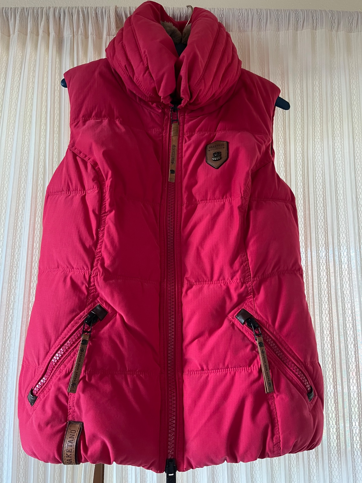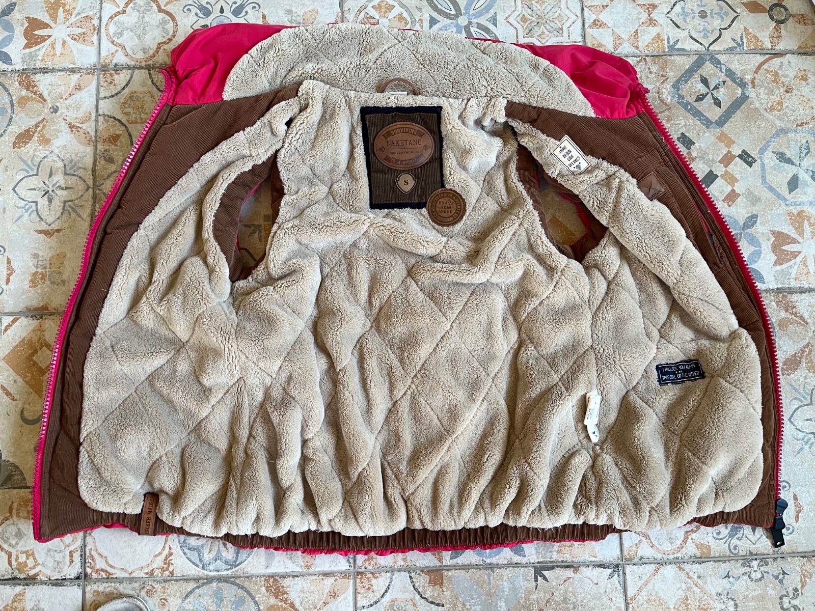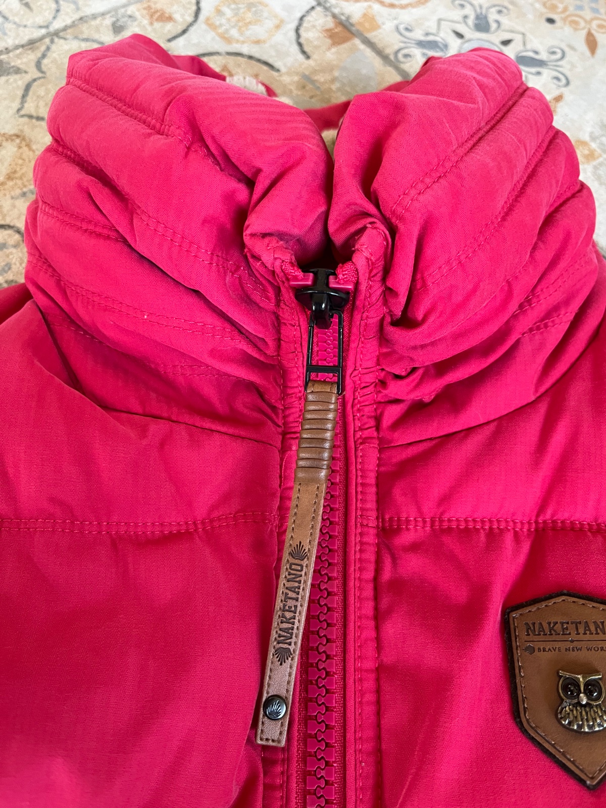 Nosená málo, top stav, bez chýb, zateplená zvnútra kožušinkou, vačky na zips, vysoký golier proti vetru, zime, na spodku je elastická, je tam guma, zipsy sú pevné, bez vád. Dĺžka vpredu 63 cm, šírka pod pazuchami 48 cm, plece merané od prišitia goliera 9 cm. Vsetko merané zvonka. Farba sa nedala dobre odfotiť, je menej krikľavá ako na fotkách, taká ružová s nádychom do červena, podľa svetla mení trochu odtieň. Najbližšie je k nej druhá fotka. Pôvidná cena vysoká.