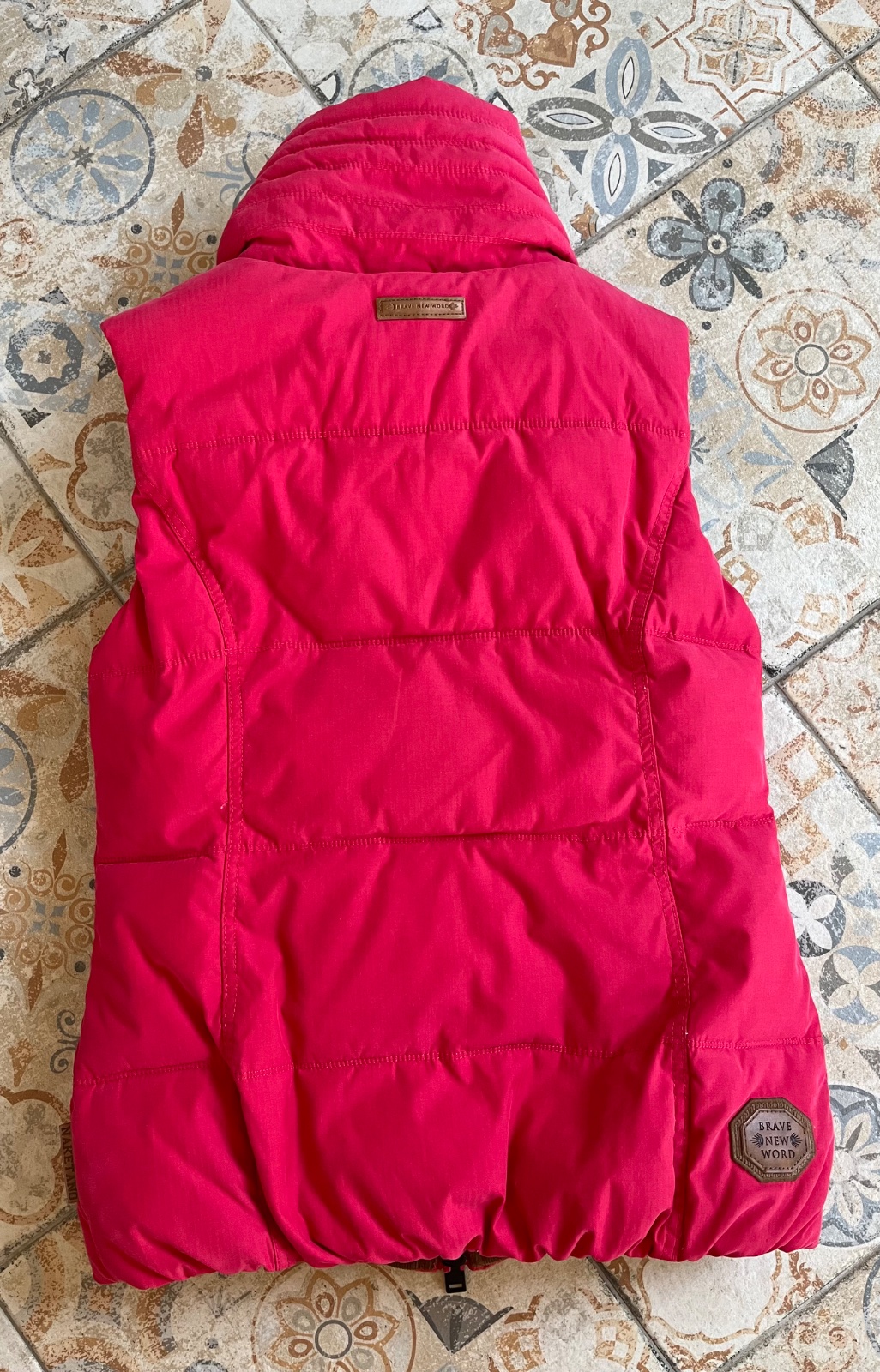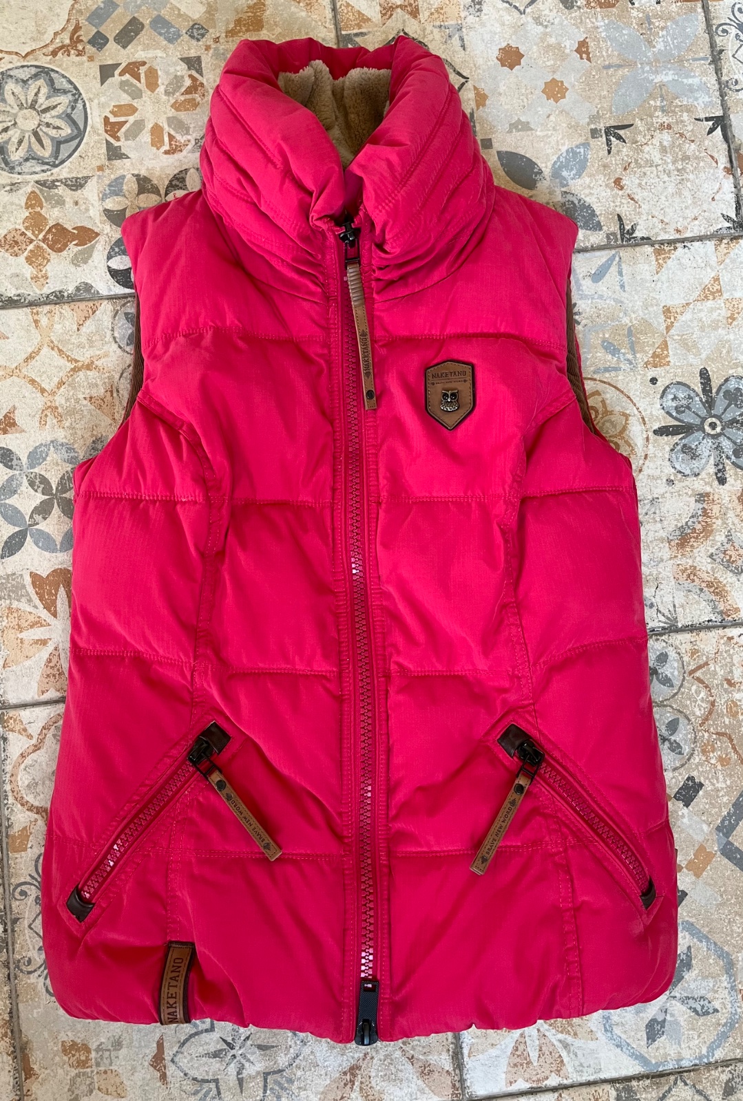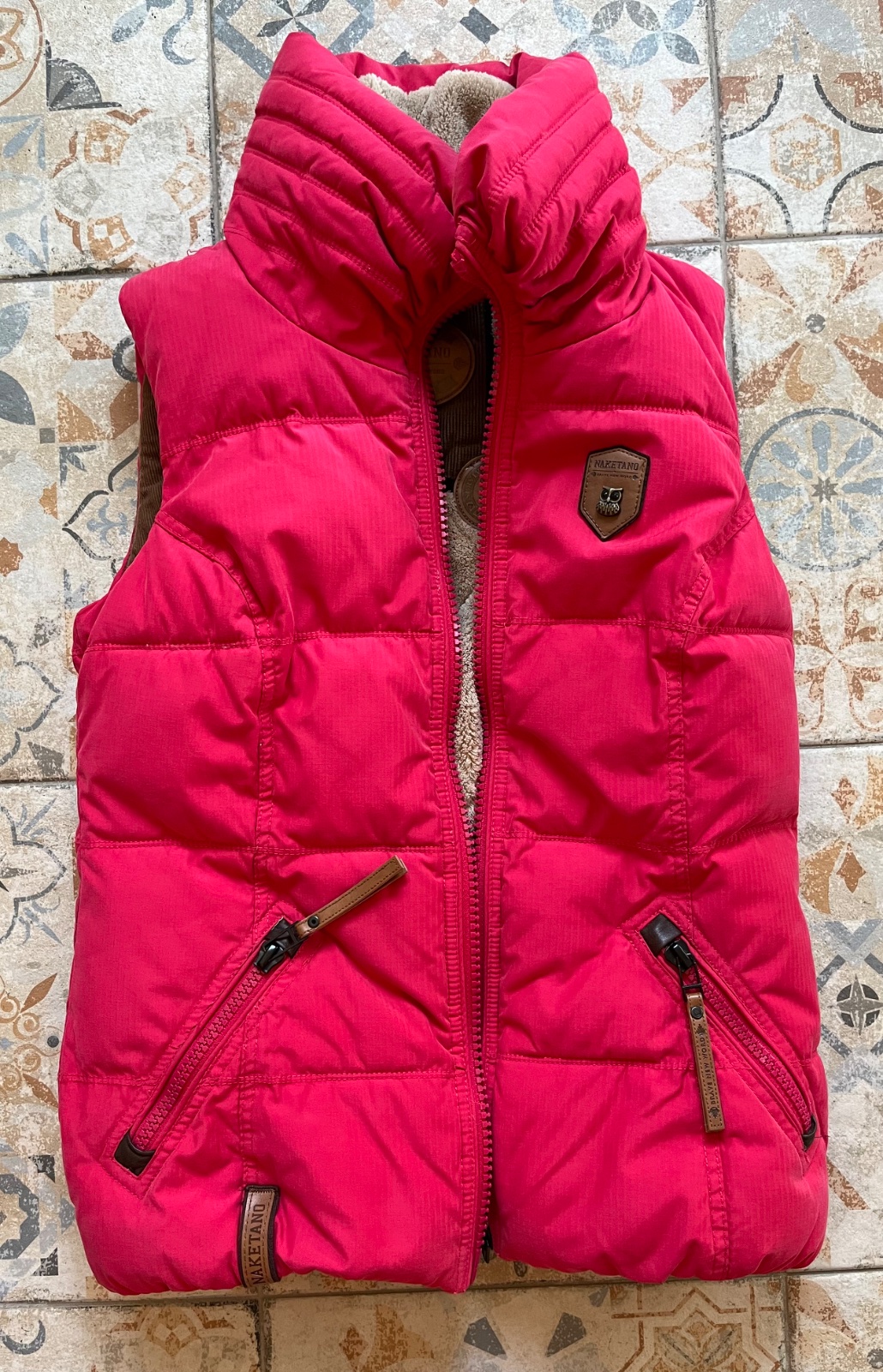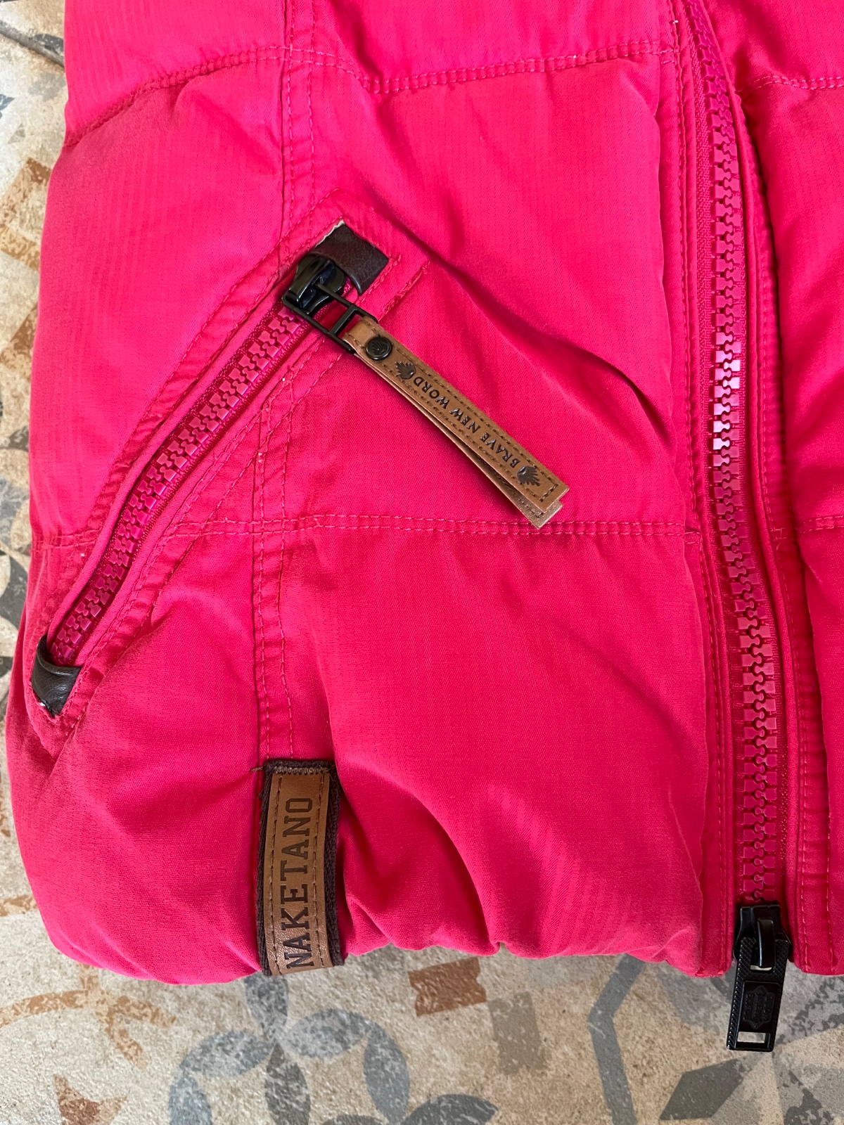 Nosená málo, top stav, bez chýb, zateplená zvnútra kožušinkou, vačky na zips, vysoký golier proti vetru, zime, na spodku je elastická, je tam guma, zipsy sú pevné, bez vád. Dĺžka vpredu 63 cm, šírka pod pazuchami 48 cm, plece merané od prišitia goliera 9 cm. Vsetko merané zvonka. Farba sa nedala dobre odfotiť, je menej krikľavá ako na fotkách, taká ružová s nádychom do červena, podľa svetla mení trochu odtieň. Najbližšie je k nej druhá fotka. Pôvidná cena vysoká.
