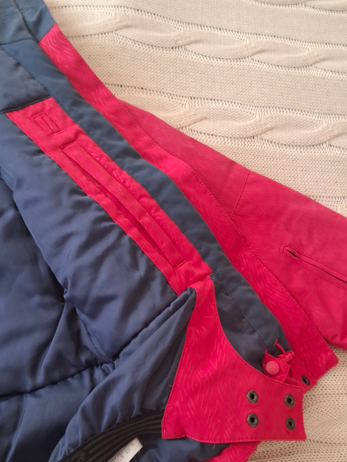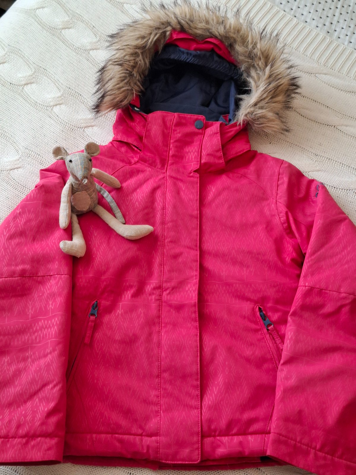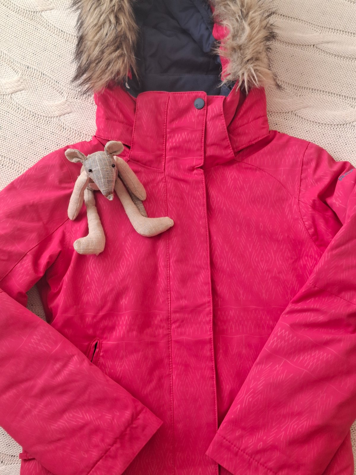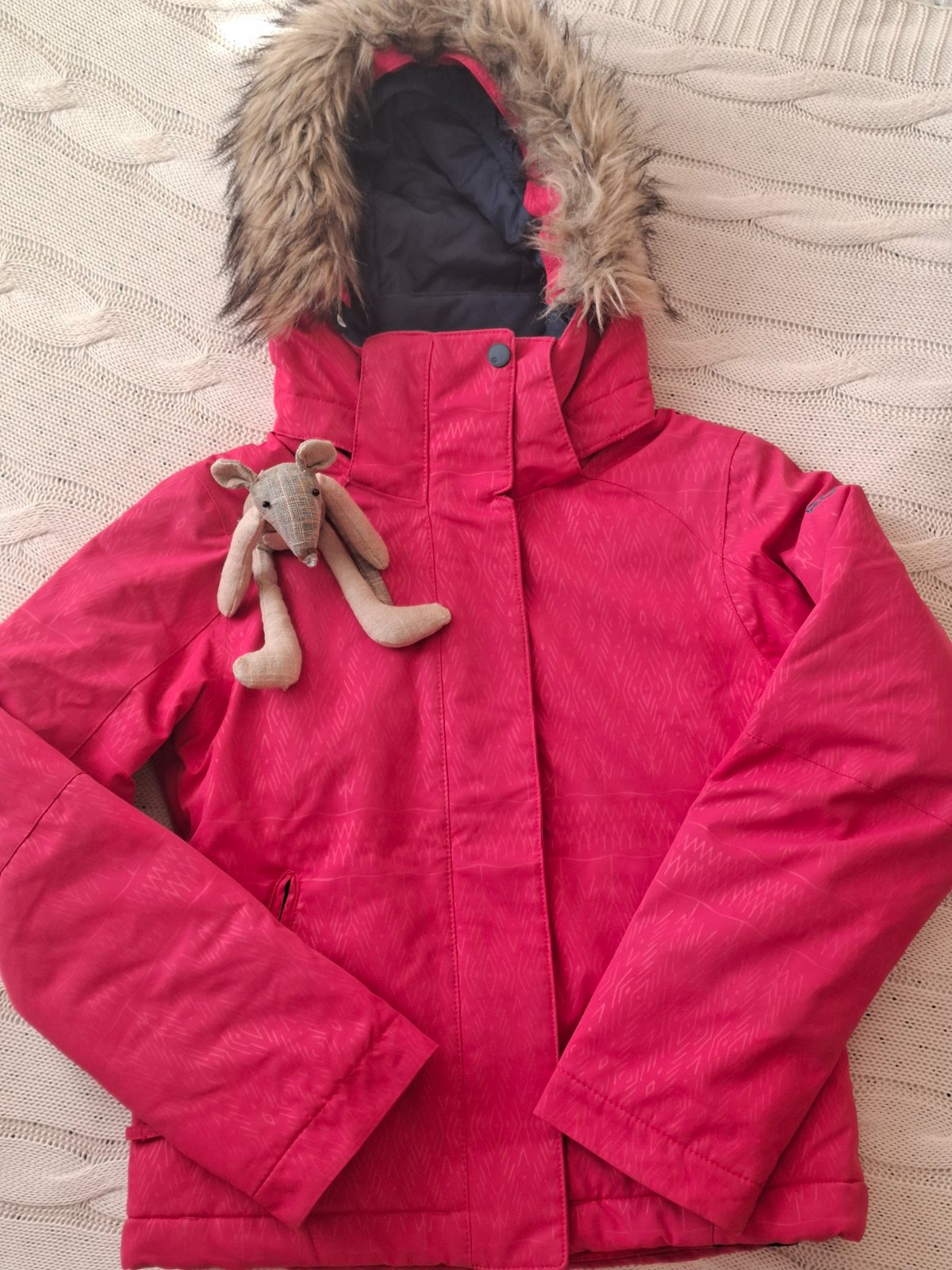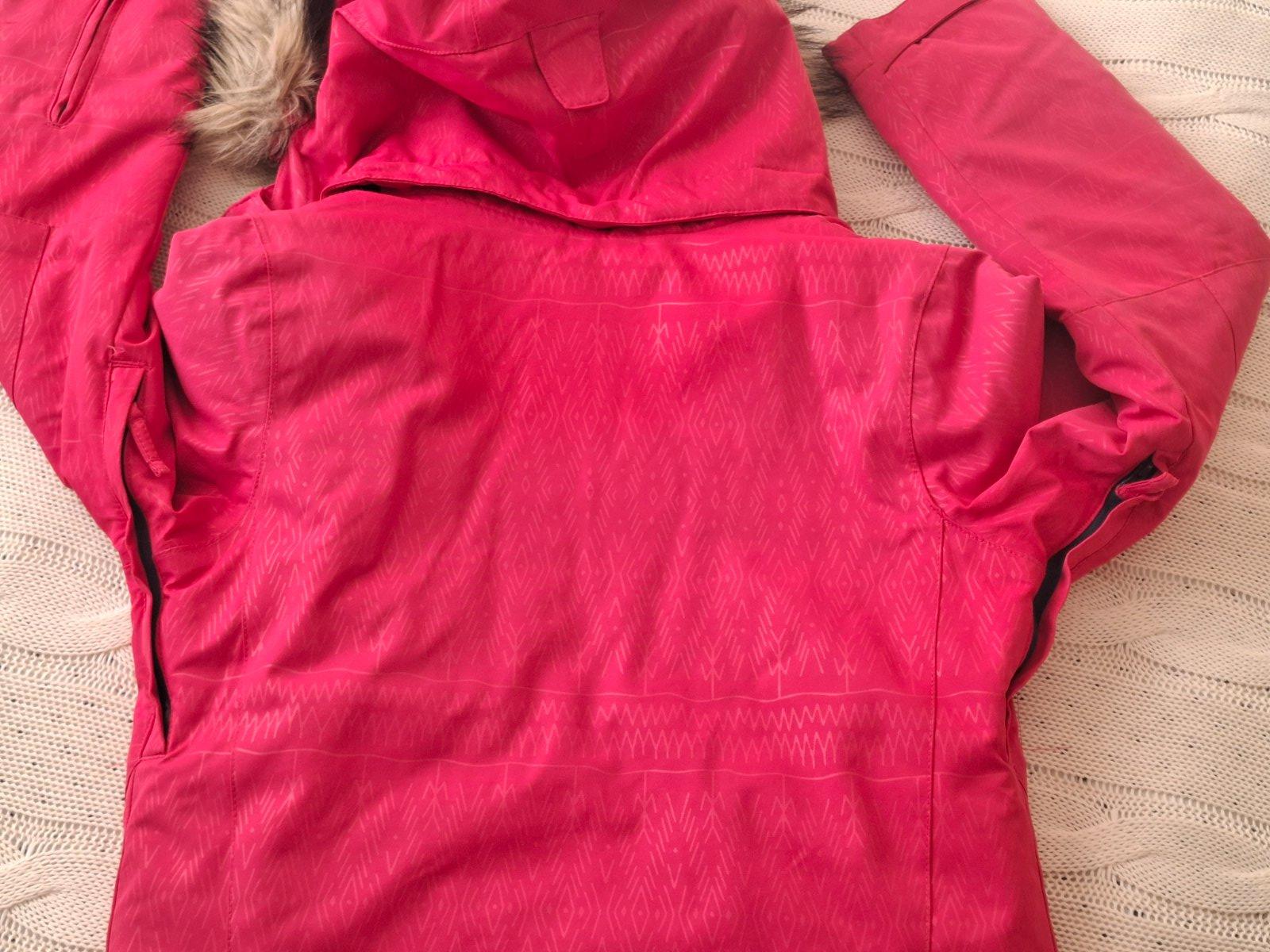 Krásna prepracovaná bunda vhodná na zimné športy vo veľmi peknom nosenom stave. Nosenie vidno na golieri zvnútra, sú tam minižmolky. Kapucňa aj kožušinka sa dá odopnúť. Má vrecko na skipas, vnútorný pás, vnútorné vrecká...farba je pekná tmavo ružová. PC vysoká
