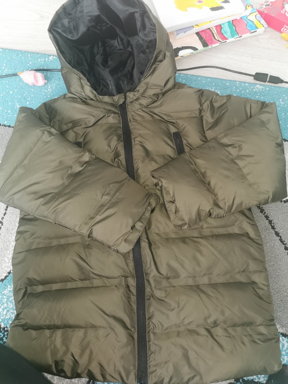 Bunda s kapucňou v top stave, 1x oblečená, ale synovi už malá, veľkosť 8-9rokov.V
