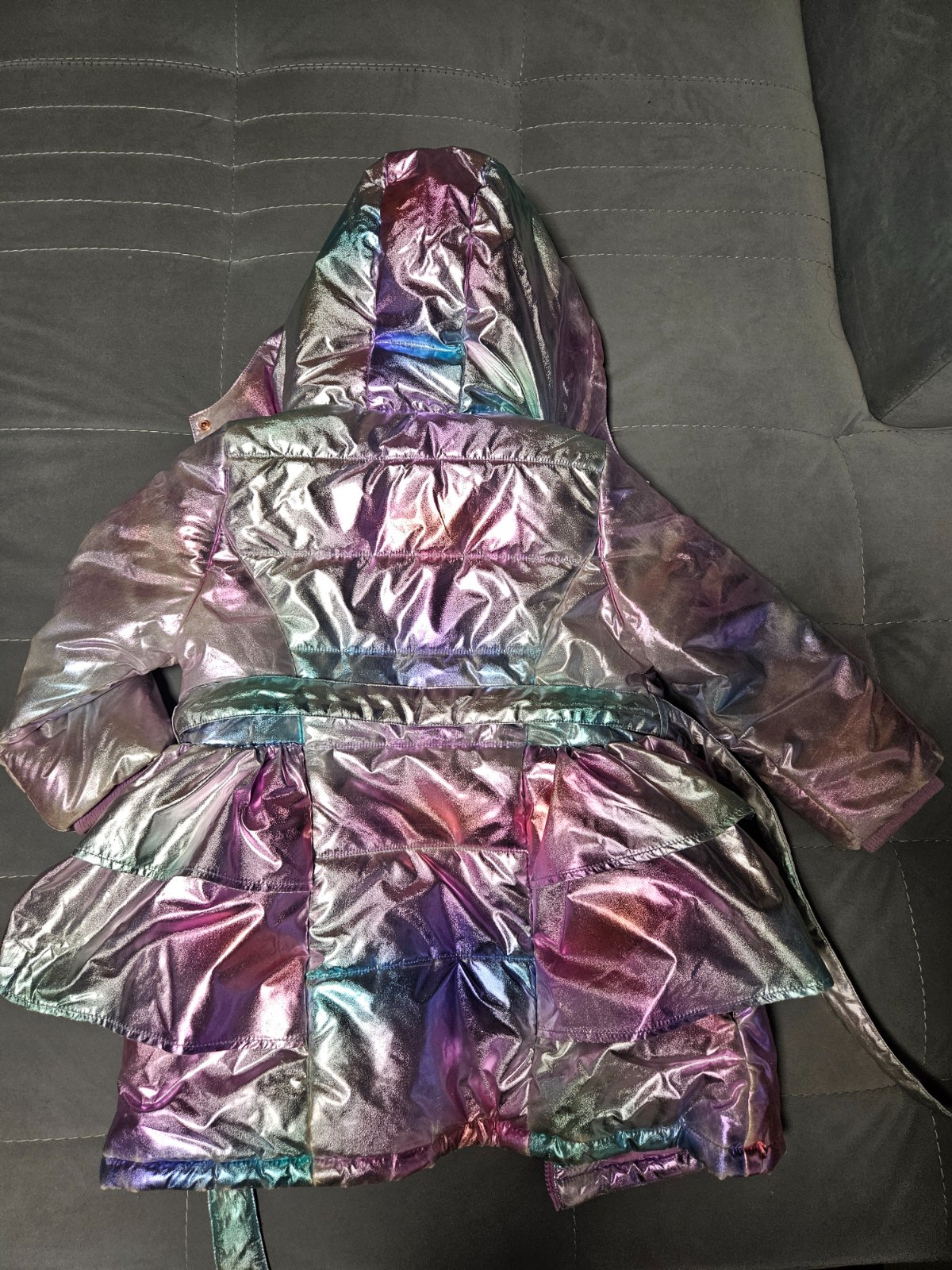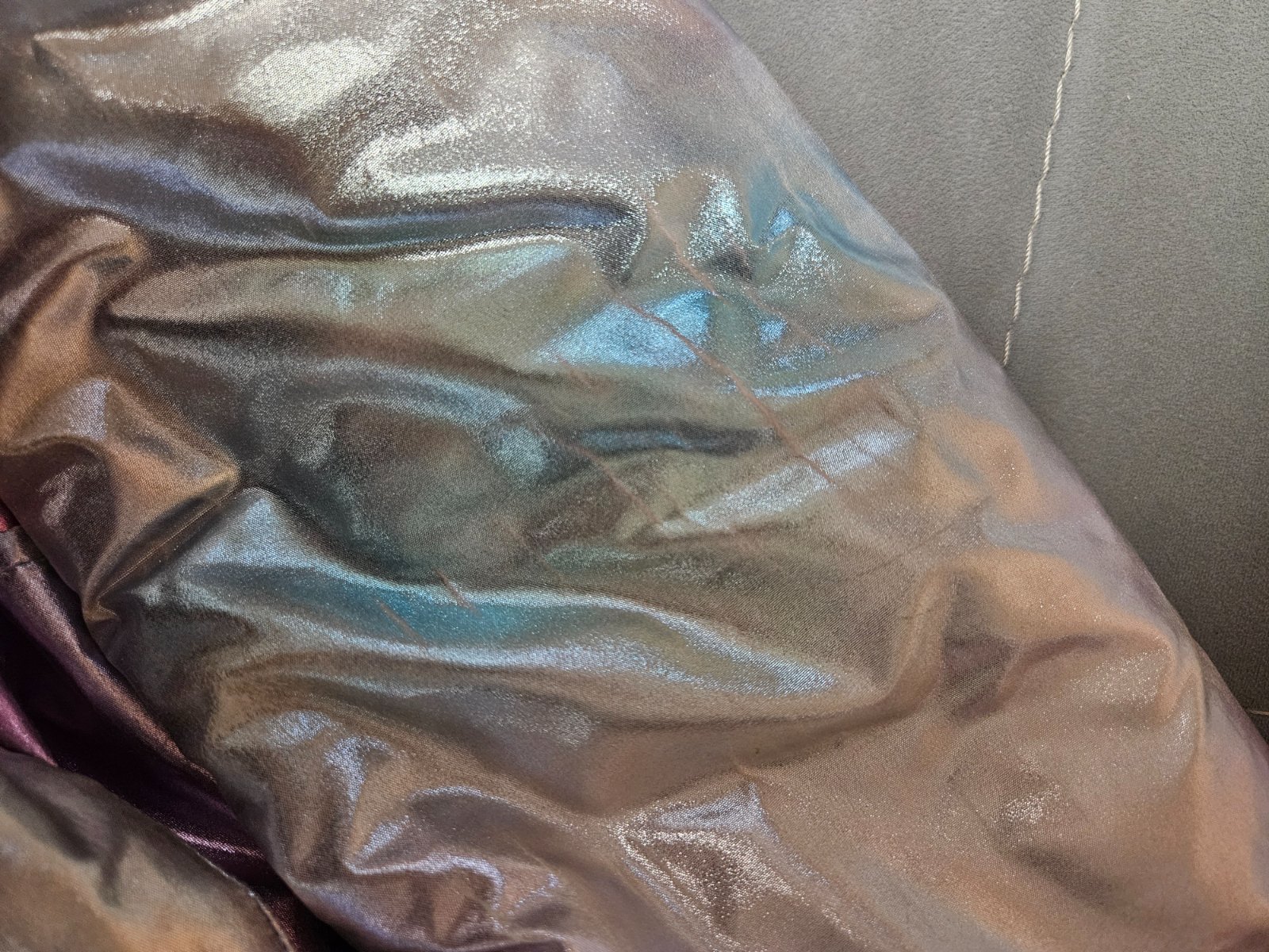 Kabat je vo velmi peknom stave, nema ziadne poskodenia. Miestami na latke je vidno take ciary z toho ako sa latka ohybala (hlavne na rukavoch) detail je vo fotke. Nieje to ziadne poskodenie, len esteticke a v podstate je to koli vlastnostiam latky a urobilo sa to hned na zaciatku nosenia.